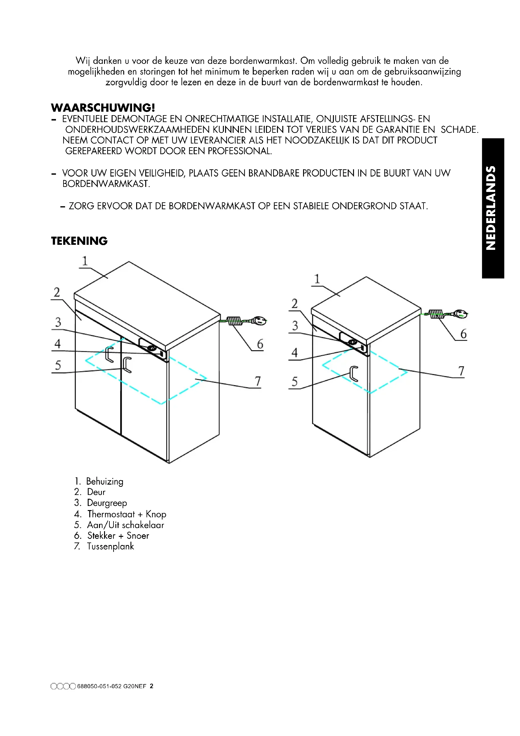 CHAUFFE-ASSIETTES Modelnr.: *688.050 - *688.051 - *688.052 CaterChef 120 CaterChef 60 CaterChef 30688050-051-052 G20NEF 2 NEDERLANDS Wij danken u voor de keuze van deze bordenwarmkast. Om volledig gebruik te maken van de mogelijkheden en storingen tot het minimum te beperken raden wij u aan om de gebruiksaanwijzing zorgvuldig door te lezen en deze in de buurt van de bordenwarmkast te houden. WAARSCHUWING! − EVENTUELE DEMONTAGE EN ONRECHTMATIGE INSTALLATIE, ONJUISTE AFSTELLINGS- EN ONDERHOUDSWERKZAAMHEDEN KUNNEN LEIDEN TOT VERLIES VAN DE GARANTIE EN SCHADE. NEEM CONTACT OP MET UW LEVERANCIER ALS HET NOODZAKELIJK IS DAT DIT PRODUCT GEREPAREERD WORDT DOOR EEN PROFESSIONAL. − VOOR UW EIGEN VEILIGHEID, PLAATS GEEN BRANDBARE PRODUCTEN IN DE BUURT VAN UW BORDENWARMKAST. − ZORG ERVOOR DAT DE BORDENWARMKAST OP EEN STABIELE ONDERGROND STAAT. TEKENING