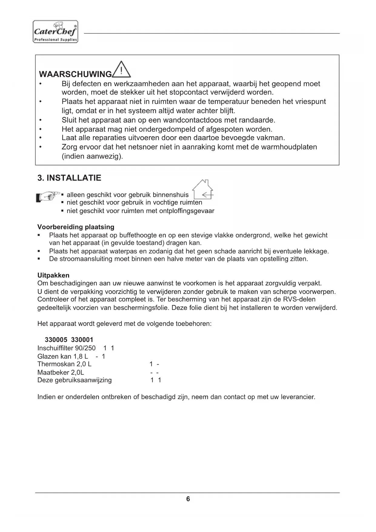alleen geschkt voor gebruk bnnenshus net geschkt voor gebruk n vochtge rumten net geschkt voor rumten met ontploffngsgevaar Voorberedng plaatsng Plaats het apparaat op buffethoogte en op een stevge vlakke ondergrond, welke het gewcht van het apparaat (n gevulde toestand) dragen kan. Plaats het apparaat waterpas en zodang dat het geen schade aanrcht bj eventuele lekkage. De stroomaanslutng moet bnnen een halve meter van de plaats van opstellng ztten. Utpakken Om beschadgngen aan uw neuwe aanwnst te voorkomen s het apparaat zorgvuldg verpakt. U dent de verpakkng voorzchtg te verwjderen zonder gebruk te maken van scherpe voorwerpen. Controleer of het apparaat compleet s. Ter beschermng van het apparaat zjn de RVS-delen gedeelteljk voorzen van beschermngsfole. Deze fole dent bj het nstalleren te worden verwjderd. Het apparaat wordt geleverd met de volgende toebehoren: