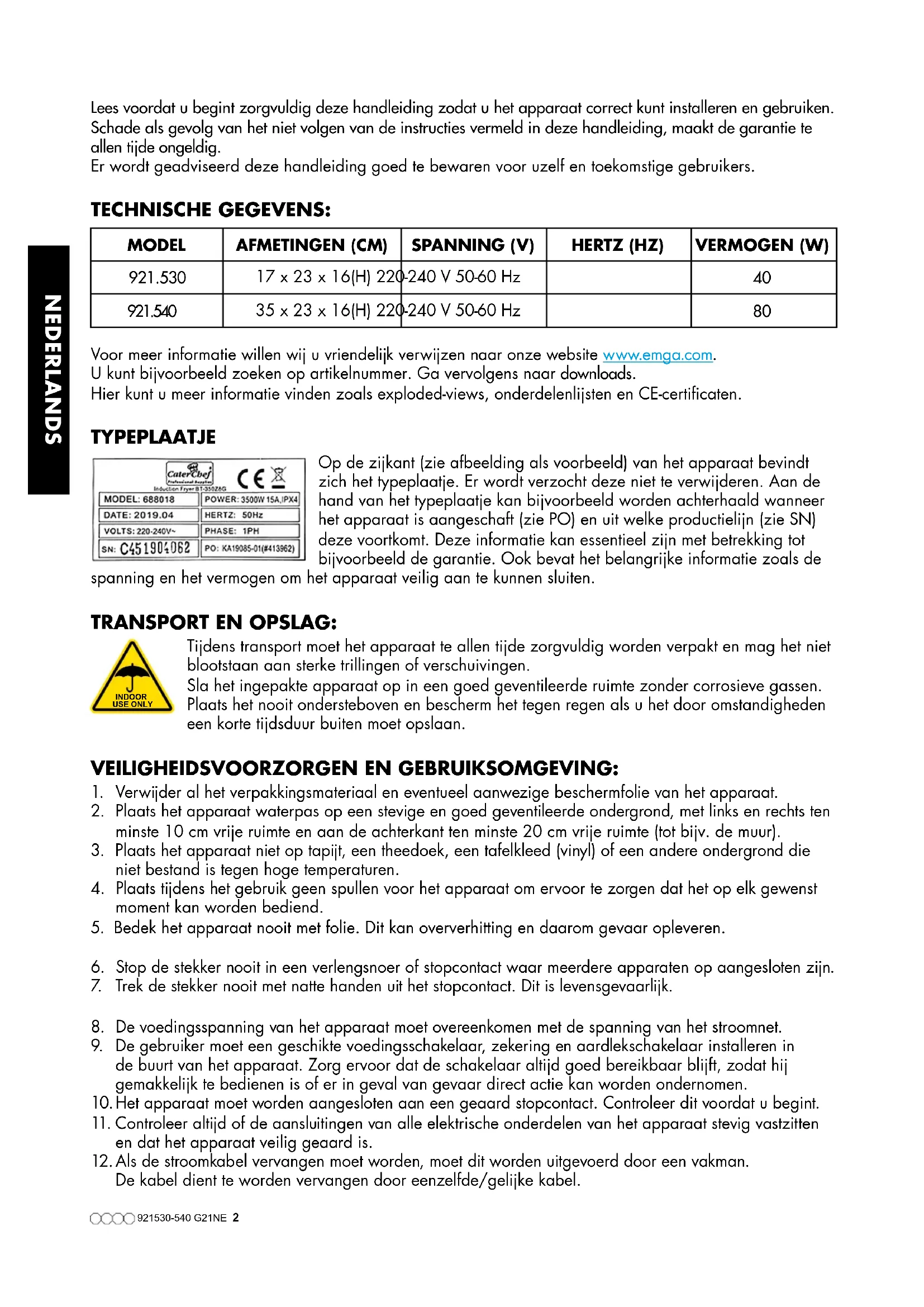 Voor meer informatie willen wij u vriendelijk verwijzen naar onze website www.emga.com. U kunt bijvoorbeeld zoeken op artikelnummer. Ga vervolgens naar downloads. Hier kunt u meer informatie vinden zoals exploded-views, onderdelenlijsten en CE-certificaten. TYPEPLAATJE Op de zijkant (zie afbeelding als voorbeeld) van het apparaat bevindt zich het typeplaatje. Er wordt verzocht deze niet te verwijderen. Aan de hand van het typeplaatje kan bijvoorbeeld worden achterhaald wanneer het apparaat is aangeschaft (zie PO) en uit welke productielijn (zie SN) deze voortkomt. Deze informatie kan essentieel zijn met betrekking tot bijvoorbeeld de garantie. Ook bevat het belangrijke informatie zoals de spanning en het vermogen om het apparaat veilig aan te kunnen sluiten. TRANSPORT EN OPSLAG: