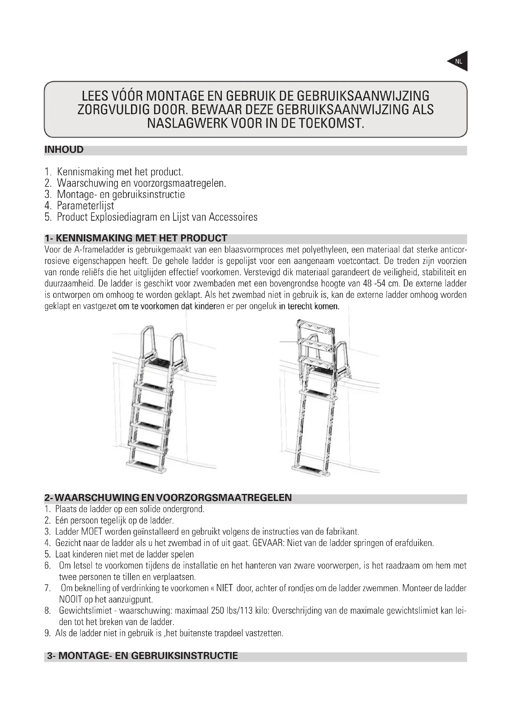 7. Om beknelling of verdrinking te voorkomen « NIET door, achter of rondjes om de ladder zwemmen. Monteer de ladder