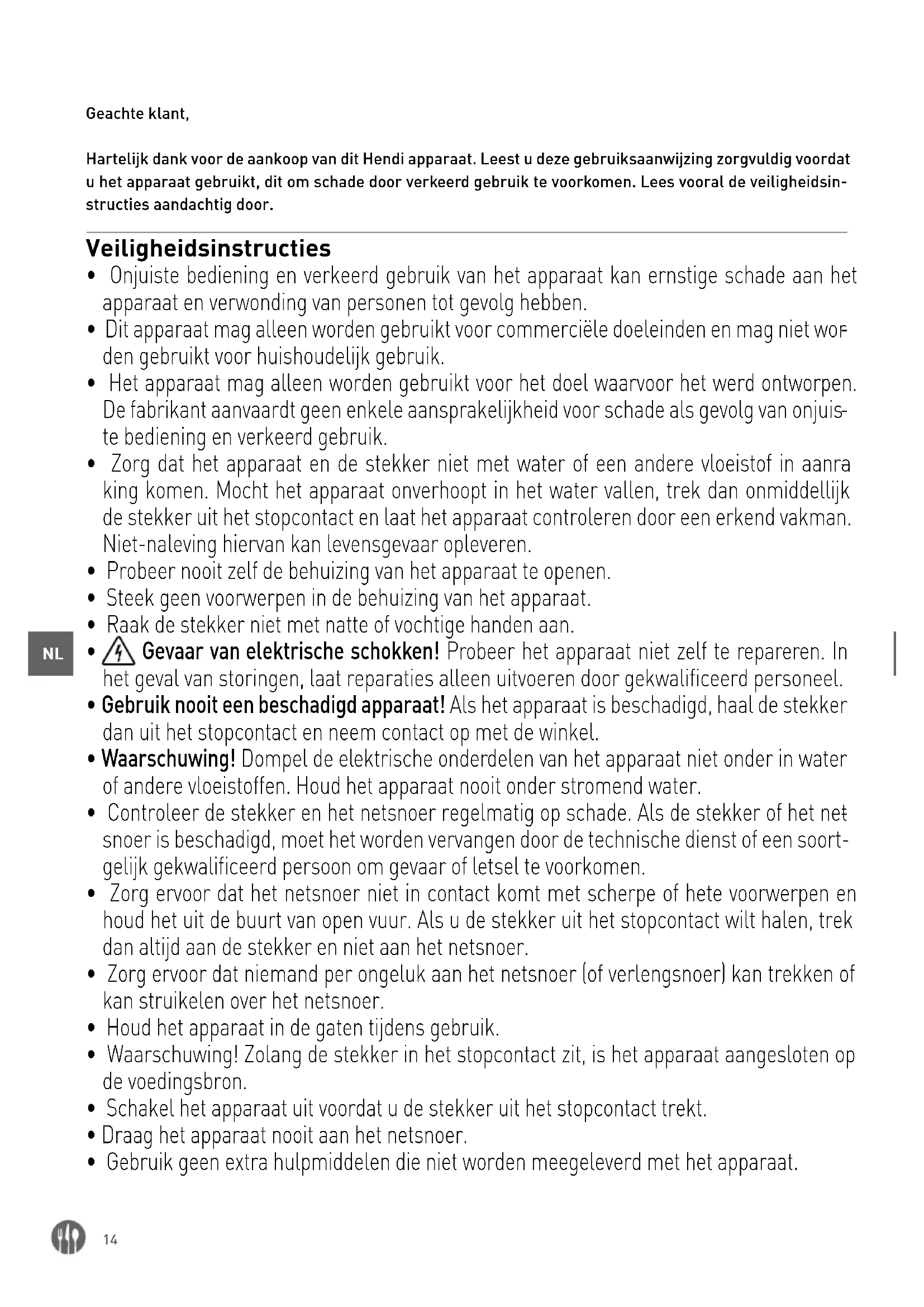 Geachte klant, Hartelijk dank voor de aankoop van dit Hendi apparaat. Leest u deze gebruiksaanwijzing zorgvuldig voordat u het apparaat gebruikt, dit om schade door verkeerd gebruik te voorkomen. Lees vooral de veiligheidsin- structies aandachtig door. Veiligheidsinstructies