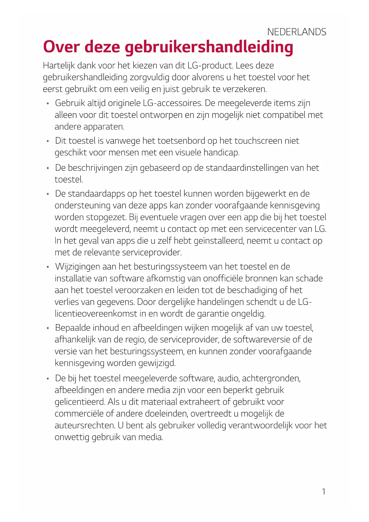 - Wijzigingen aan het besturingsystem van het toestel en de installmentie van software afkomstig van onofficièle brunnen kan schaden aan het toestel veroorzaken en leiden tot de beschadiging of het verlies van gegevens. Door dergelijkke handelingen schendt u de LG-licentieovereenkomst in en worden de garantie onteldig.