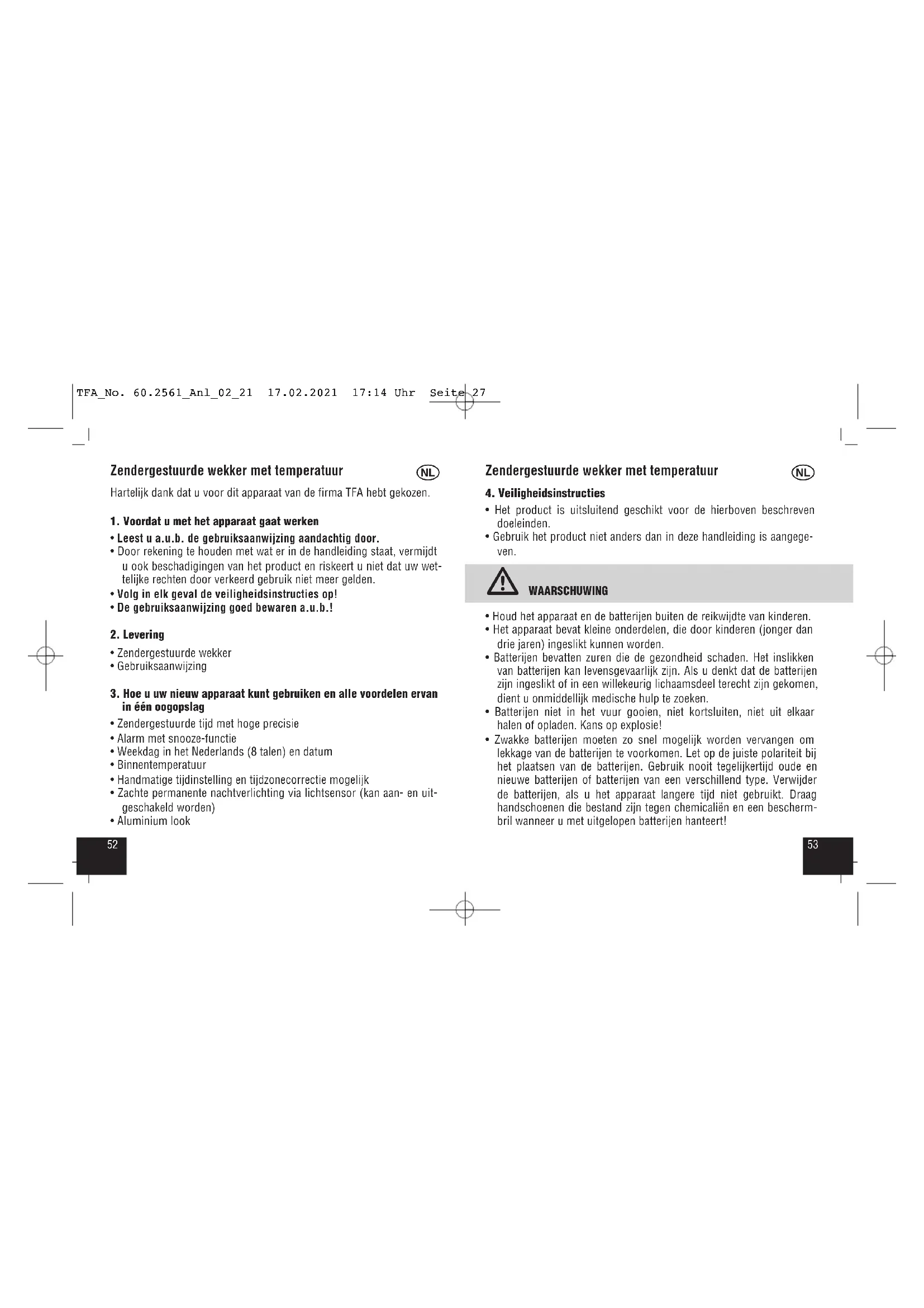 - Sluit het batterijvak weer. TFA_No. 60.2561_Anl_02_21 17.02.2021 17:14 Uhr Seite 31Zendergestuurde wekker met temperatuur
