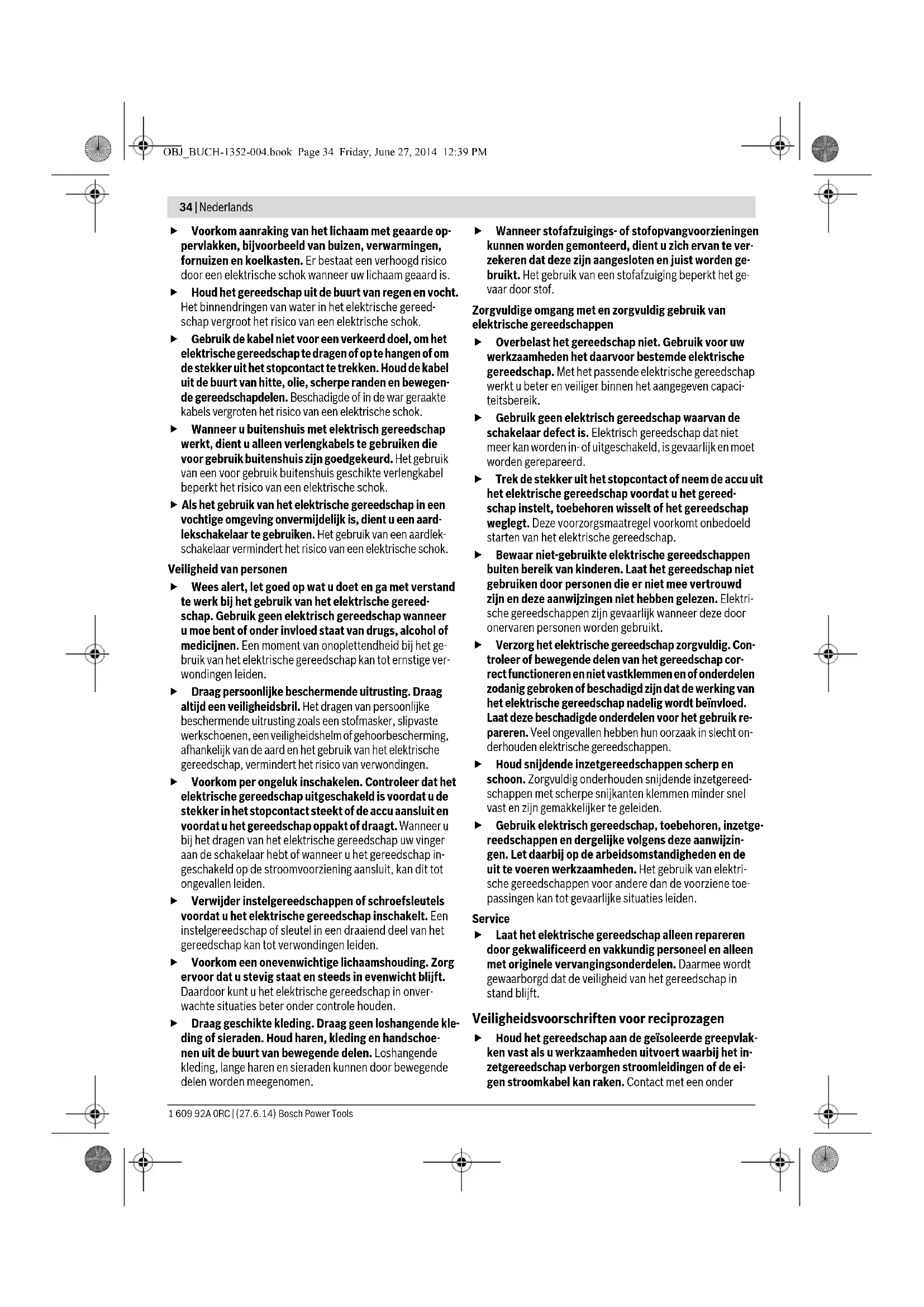 Gewicht volgens EPTA-Procedure 01/2003 kg 3,5 Isolatieklasse /II De gegevens gelden voor nominale spanningen [U] 230 V. Bij afwij-kende spanningen en bij per land verschillende uitvoeringen kunnen deze gegevens afwijken. OBJ_BUCH-1352-004.book Page 35 Friday, June 27, 2014 12:39 PM36 | Nederlands 1 609 92A 0RC | (27.6.14) Bosch Power Tools Het in deze gebruiksaanwijzing vermelde trillingsniveau is ge- meten met een volgens EN 60745 genormeerde meetmetho- de en kan worden gebruikt om elektrische gereedschappen met elkaar te vergelijken. Het is ook geschikt voor een voorlo- pige inschatting van de trillingsbelasting. Het aangegeven trillingsniveau representeert de voornaam- ste toepassingen van het elektrische gereedschap. Als echter het elektrische gereedschap wordt gebruikt voor andere toe- passingen, met verschillende accessoire, met afwijkende in- zetgereedschappen of onvoldoende onderhoud, kan het tril- lingsniveau afwijken. Dit kan de trillingsbelasting gedurende de gehele arbeidsperiode duidelijk verhogen. Voor een nauwkeurige schatting van de trillingsbelasting moet ook rekening worden gehouden met de tijd waarin het gereedschap uitgeschakeld is, of waarin het gereedschap wel loopt, maar niet werkelijk wordt gebruikt. Dit kan de trillings- belasting gedurende de gehele arbeidsperiode duidelijk ver- minderen. Leg aanvullende veiligheidsmaatregelen ter bescherming van de bediener tegen het effect van trillingen vast, zoals: Onder- houd van elektrische gereedschappen en inzetgereedschap- pen, warm houden van de handen, organisatie van het ar- beidsproces. Conformiteitsverklaring We verklaren op onze verantwoordelijkheid dat het onder „Technische gegevens” beschreven product aan alle desbe- treffende bepalingen van de richtlijnen 2011/65/EU, 2014/30/EU, 2006/42/EG inclusief van de wijzigingen er- van voldoet en met de volgende normen overeenstemt EN 60745-1, EN 60745-2-11. Technisch dossier (2006/42/EG) bij: Robert Bosch GmbH, PT/ETM9, 70764 Leinfelden-Echterdingen, GERMANY Robert Bosch GmbH, Power Tools Division 70764 Leinfelden-Echterdingen, GERMANY Leinfelden, 25.04.2014 Montage Zaagblad inzetten of vervangen Trek altijd voor werkzaamheden aan het elektrische gereedschap de stekker uit het stopcontact. Draag werkhandschoenen bij de montage van het zaag- blad. Bij het aanraken van het zaagblad bestaat verwon- dingsgevaar. Let er bij het wisselen van zaagbladen op dat de zaag- bladopname vrij van materiaalresten zoals hout- en metaalspanen is. Zaagblad kiezen Een overzicht van geadviseerde zaagbladen vindt u aan het einde van deze gebruiksaanwijzing. Gebruik alleen zaagbla- den met ½" universele schacht. Het zaagblad mag niet langer zijn dan nodig is voor de gewenste zaagsnede. De schachtdikte van het zaagblad moet 0,8–1,6 mm bedra- gen. Gebruik voor het zagen van nauwe bochten een smal zaag- blad. Zaagblad inzetten (zie afbeelding A) Duw de SDS-hendel 5 naar voren en steek het zaagblad 1 achter de klemplaat 8 in de zaagbladopname 3. Laat de SDS- hendel 5 los. Controleer of het zaagblad stevig vastzit door eraan te trekken. Een los zaagblad kan uit de zaaghouder vallen en kan u verwonden. Voor bepaalde werkzaamheden kan het zaagblad 1 ook 180° worden gedraaid (tanden wijzen omhoog) en weer worden in- gezet. Zaagblad verwijderen Laat het zaagblad afkoelen voordat u het verwijdert. Bij het aanraken van het hete zaagblad bestaat verwondings- gevaar. Duw de SDS-hendel 5 naar voren en trek het zaagblad 1 naar buiten. Laat de SDS-hendel 5 los. Afzuiging van stof en spanen Stof van materialen zoals loodhoudende verf, enkele hout- soorten, mineralen en metaal kunnen schadelijk voor de gezondheid zijn. Aanraking of inademing van stof kan lei- den tot allergische reacties en/of ziekten van de ademwe- gen van de gebruiker of personen die zich in de omgeving bevinden. Bepaalde soorten stof, bijvoorbeeld van eiken- en beuken- hout, gelden als kankerverwekkend, in het bijzonder in combinatie met toevoegingsstoffen voor houtbehandeling (chromaat en houtbeschermingsmiddelen). Asbesthou- dend materiaal mag alleen door bepaalde vakmensen wor- den bewerkt. – Zorg voor een goede ventilatie van de werkplek. – Er wordt geadviseerd om een ademmasker met filter- klasse P2 te dragen. Neem de in uw land geldende voorschriften voor de te bewerken materialen in acht. Voorkom ophoping van stof op de werkplek. Stof kan gemakkelijk ontbranden. Gebruik Ingebruikneming Let op de netspanning! De spanning van de stroombron moet overeenkomen met de gegevens op het type- plaatje van het elektrische gereedschap. Met 230 V aangeduide elektrische gereedschappen kunnen ook met 220 V worden gebruikt. Henk Becker Executive Vice President Engineering Helmut Heinzelmann Head of Product Certification PT/ETM9 OBJ_BUCH-1352-004.book Page 36 Friday, June 27, 2014 12:39 PMNederlands | 37 Bosch Power Tools 1 609 92A 0RC | (27.6.14) In- en uitschakelen Als u het elektrische gereedschap wilt inschakelen drukt u op de aan/uit-schakelaar 6 en houdt u deze ingedrukt. Als u het elektrische gereedschap wilt uitschakelen laat u de aan/uit-schakelaar 6 los. Opmerking: Om veiligheidsredenen kan de aan-/uitschake- laar 6 van de machine niet worden vergrendeld, maar moet deze tijdens het gebruik voortdurend ingedrukt blijven. Om energie te besparen, schakelt u het elektrische gereed- schap alleen in wanneer u het gebruikt. Aantal zaagbewegingen instellen Door toe- of afnemende druk op de aan/uit-schakelaar 6 kunt u het aantal zaagbewegingen van het ingeschakelde elektri- sche gereedschap traploos regelen. Lichte druk op de aan/uit-schakelaar 6 heeft een klein aantal zaagbewegingen tot gevolg. Met toenemende druk wordt het aantal zaagbewegingen groter. Het vereiste aantal zaagbewegingen is afhankelijk van het ma- teriaal en de werkomstandigheden en kan proefsgewijs wor- den vastgesteld. Geadviseerd wordt om het aantal zaagbewegingen te vermin- deren als het zaagblad op het werkstuk wordt geplaatst en bij het zagen van kunststof en alum