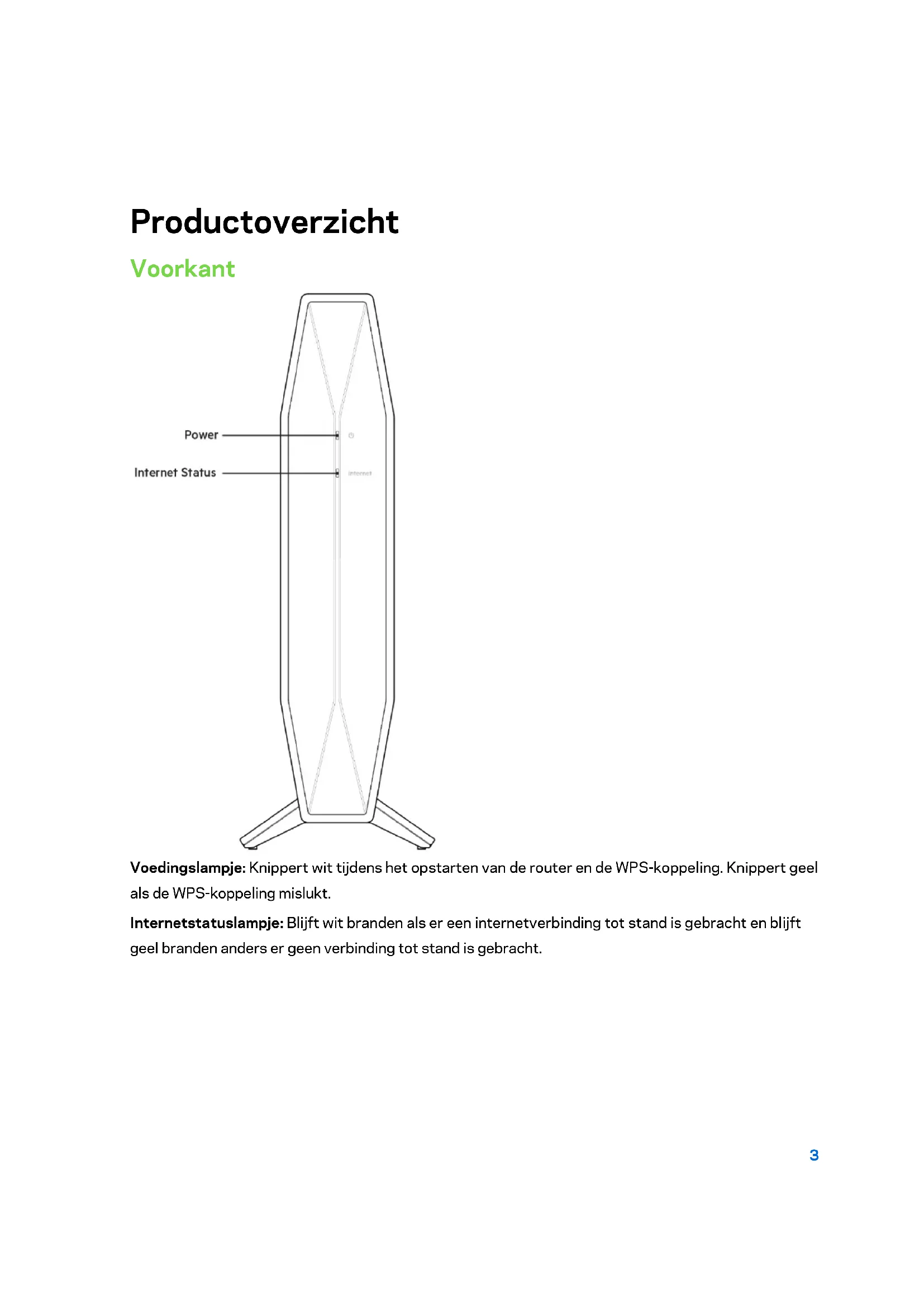 - Omgevingsspecificaties Productoverzicht Voorkant Voedingslampje: Knippert wit tijdens het opstarten van de router en de WPS-koppeling. Knippert geel als de WPS-koppeling mislukt. Internetstatuslampje: Blijft wit branden als er een internetverbinding tot stand is gebracht en blijft geel branden anders er geen verbinding tot stand is gebracht.4 Achterkant Wi-Fi Protected Setup™ (WPS)-knop (1): Druk op deze knop om eenvoudig draadloze beveiliging te configureren op netwerkapparaten die WPS ondersteunen. Het voedingslampje op de voorkant van de router zal wit branden tijdens de WPS-koppeling. Resetknop (2): Houd deze knop ingedrukt tot het statuslampje gaat knipperen, om de fabrieksinstellingen van de router te herstellen. Ethernet-poorten (3): Op deze Gigabit Ethernet (10/100/1000)-poorten sluit u Ethernet-kabels (ook wel netwerk- of internetkabels genoemd) aan om andere apparaten via een kabel met uw netwerk te verbinden. Internetpoort (4):Sluit uw modem met behulp van een Ethernet-kabel aan op deze poort. Het internetstatuslampje aan de voorkant van de router zal wit worden als de router verbonden is met een modem met een internetverbinding. USB 2.0-poort (5): Sluit een USB-station aan om het te delen op uw netwerk. Voedingsaansluiting (6): Sluit de meegeleverde netvoedingsadapter hierop aan. Aan/uit-schakelaar (7): Druk op | (aan) om de router aan te zetten.5 Installatie: basisinstructies Waar kan ik terecht voor extra ondersteuning? Voor aanvullende informatie op deze handleiding verwijzen we u naar: Belkin.com/support/RT3200 (voor documentatie, downloads, veelgestelde vragen, technische ondersteuning, live-chat, forums). Opmerking: Licenties en kennisgevingen voor software van derden die gebruikt worden voor dit product, vindt u hier: http://www.belkin.com/support/license/. Voor de GPL- broncodebestanden of gerelateerde vragen kunt u via http://www.belkin.com/support/gplcodecenter/ contact met ons opnemen. Uw router installeren p. 213