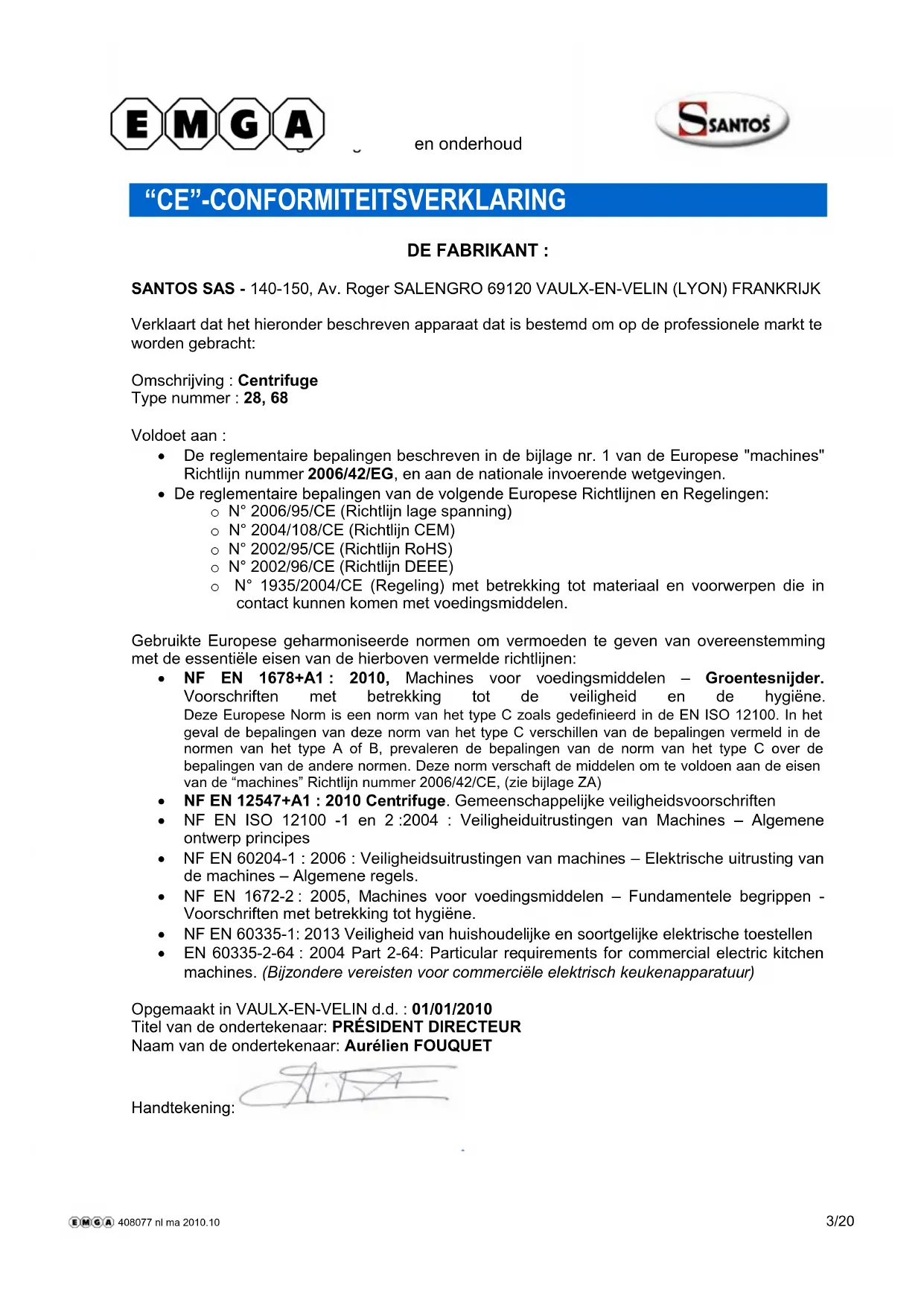 Opmerking: zie de schema’s aan het eind van de handleiding om de hierna volgende paragrafen beter te kunnen begrijpen. 408077 nl ma 2010.10 2/20SANTOS: Handleiding MBT gebruik en onderhoud 98168 NL 1.0 - 12 2013 3 / 22 www.santos.fr “CE”-CONFORMITEITSVERKLARING DE FABRIKANT : SANTOS SAS - 140-150, Av. Roger SALENGRO 69120 VAULX-EN-VELIN (LYON) FRANKRIJK Verklaart dat het hieronder beschreven apparaat dat is bestemd om op de professionele markt te worden gebracht: Omschrijving : Centrifuge Type nummer : 28, 68 Voldoet aan : De reglementaire bepalingen beschreven in de bijlage nr. 1 van de Europese "machines" Richtlijn nummer 2006/42/EG, en aan de nationale invoerende wetgevingen. De reglementaire bepalingen van de volgende Europese Richtlijnen en Regelingen: o N° 2006/95/CE (Richtlijn lage spanning) o N° 2004/108/CE (Richtlijn CEM) o N° 2002/95/CE (Richtlijn RoHS) o N° 2002/96/CE (Richtlijn DEEE) o N° 1935/2004/CE (Regeling) met betrekking tot materiaal en voorwerpen die in contact kunnen komen met voedingsmiddelen. Gebruikte Europese geharmoniseerde normen om vermoeden te geven van overeenstemming met de essentiële eisen van de hierboven vermelde richtlijnen: NF EN 1678+A1 : 2010, Machines voor voedingsmiddelen – Groentesnijder. Voorschriften met betrekking tot de veiligheid en de hygiëne. Deze Europese Norm is een norm van het type C zoals gedefinieerd in de EN ISO 12100. In het geval de bepalingen van deze norm van het type C verschillen van de bepalingen vermeld in de normen van het type A of B, prevaleren de bepalingen van de norm van het type C over de bepalingen van de andere normen. Deze norm verschaft de middelen om te voldoen aan de eisen van de “machines” Richtlijn nummer 2006/42/CE, (zie bijlage ZA) NF EN 12547+A1 : 2010 Centrifuge. Gemeenschappelijke veiligheidsvoorschriften NF EN ISO 12100 -1 en 2 :2004 : Veiligheiduitrustingen van Machines – Algemene ontwerp principes NF EN 60204-1 : 2006 : Veiligheidsuitrustingen van machines – Elektrische uitrusting van de machines – Algemene regels. NF EN 1672-2 : 2005, Machines voor voedingsmiddelen – Fundamentele begrippen - Voorschriften met betrekking tot hygiëne. NF EN 60335-1: 2013 Veiligheid van huishoudelijke en soortgelijke elektrische toestellen EN 60335-2-64 : 2004 Part 2-64: Particular requirements for commercial electric kitchen machines. (Bijzondere vereisten voor commerciële elektrisch keukenapparatuur) Opgemaakt in VAULX-EN-VELIN d.d. : 01/01/2010 Titel van de ondertekenaar: PRÉSIDENT DIRECTEUR Naam van de ondertekenaar: Aurélien FOUQUET Handtekening: 408077 nl ma 2010.10 3/20SANTOS: Handleiding MBT gebruik en onderhoud 98168 NL 1.0 - 12 2013 4 / 22 www.santos.fr BELANGRIJKE VOORZORGSMAATREGELEN Wanneer u deze machine of een ander elektrisch apparaat gebruikt, neem dan altijd de volgende veiligheidsmaatregelen in acht. Lees de gehele handleiding. INSTALLATIE, HANTERING LET OP : Het is absoluut verboden het apparaat aan de spanhendel (1) van het deksel beet te pakken of op te tillen bij het hanteren van het apparaat, met inbegrip tijdens het uitpakken. Het apparaat kan door één enkel persoon gehanteerd worden. Om de werkzaamheden te vergemakkelijken, raden wij u aan het apparaat op een tafel of een werkblad te plaatsen en wel zodanig dat het tuitje waaruit het sap komt en de drukknoppen aan (11) en uit (12), tegenover u staan (aanbevolen hoogte : 90 cm, naar gelang de lengte van de gebruiker). Bij het schoonmaken van de installatie moet men de mand met toebehoren (5) voorzichtig behandelen om hem niet te vervormen, dit zou de goede werking van het apparaat nadelig kunnen beïnvloeden. CONTRA INDICATIES:
