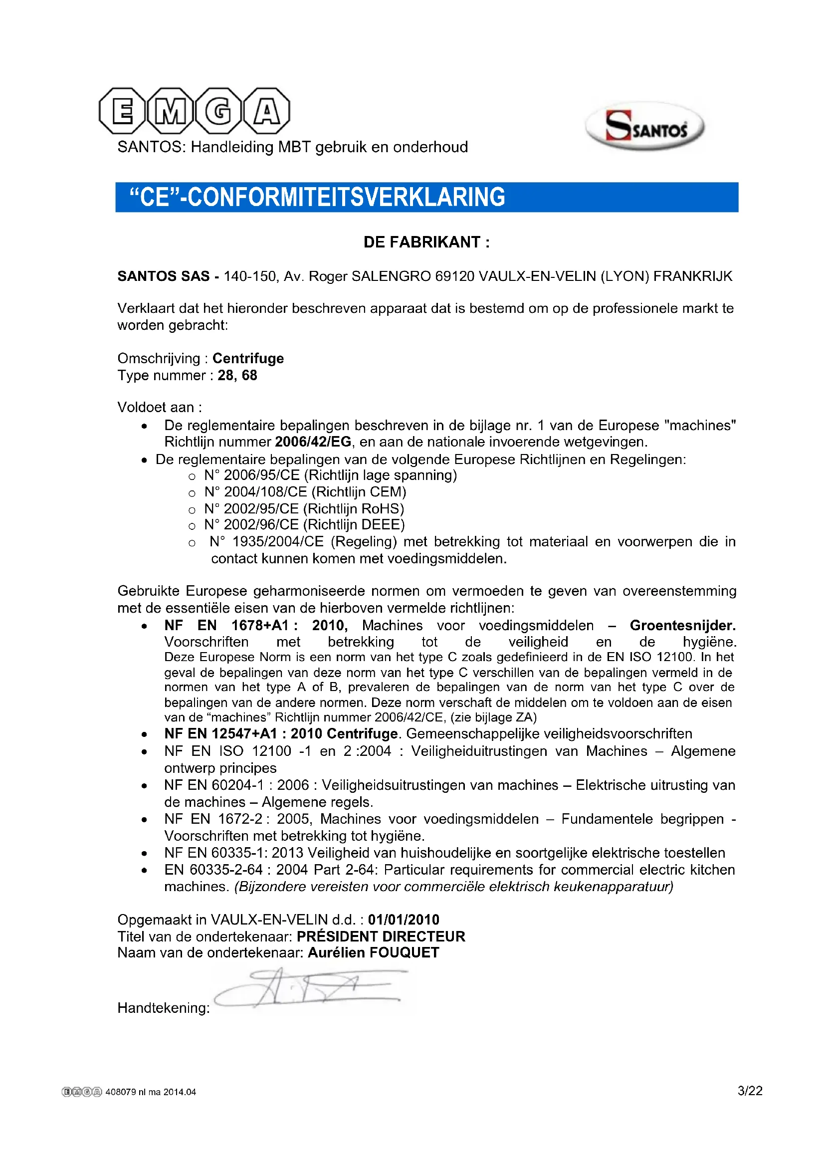 Opmerking: zie de schema’s aan het eind van de handleiding om de hierna volgende paragrafen beter te kunnen begrijpen. 408079 nl ma 2014.04 2/22SANTOS: Handleiding MBT gebruik en onderhoud 98168 NL 1.0 - 12 2013 3 / 22 www.santos.fr “CE”-CONFORMITEITSVERKLARING DE FABRIKANT : SANTOS SAS - 140-150, Av. Roger SALENGRO 69120 VAULX-EN-VELIN (LYON) FRANKRIJK Verklaart dat het hieronder beschreven apparaat dat is bestemd om op de professionele markt te worden gebracht: Omschrijving : Centrifuge Type nummer : 28, 68 Voldoet aan : De reglementaire bepalingen beschreven in de bijlage nr. 1 van de Europese "machines" Richtlijn nummer 2006/42/EG, en aan de nationale invoerende wetgevingen. De reglementaire bepalingen van de volgende Europese Richtlijnen en Regelingen: o N° 2006/95/CE (Richtlijn lage spanning) o N° 2004/108/CE (Richtlijn CEM) o N° 2002/95/CE (Richtlijn RoHS) o N° 2002/96/CE (Richtlijn DEEE) o N° 1935/2004/CE (Regeling) met betrekking tot materiaal en voorwerpen die in contact kunnen komen met voedingsmiddelen. Gebruikte Europese geharmoniseerde normen om vermoeden te geven van overeenstemming met de essentiële eisen van de hierboven vermelde richtlijnen: NF EN 1678+A1 : 2010, Machines voor voedingsmiddelen – Groentesnijder. Voorschriften met betrekking tot de veiligheid en de hygiëne. Deze Europese Norm is een norm van het type C zoals gedefinieerd in de EN ISO 12100. In het geval de bepalingen van deze norm van het type C verschillen van de bepalingen vermeld in de normen van het type A of B, prevaleren de bepalingen van de norm van het type C over de bepalingen van de andere normen. Deze norm verschaft de middelen om te voldoen aan de eisen van de “machines” Richtlijn nummer 2006/42/CE, (zie bijlage ZA) NF EN 12547+A1 : 2010 Centrifuge. Gemeenschappelijke veiligheidsvoorschriften NF EN ISO 12100 -1 en 2 :2004 : Veiligheiduitrustingen van Machines – Algemene ontwerp principes NF EN 60204-1 : 2006 : Veiligheidsuitrustingen van machines – Elektrische uitrusting van de machines – Algemene regels. NF EN 1672-2 : 2005, Machines voor voedingsmiddelen – Fundamentele begrippen - Voorschriften met betrekking tot hygiëne. NF EN 60335-1: 2013 Veiligheid van huishoudelijke en soortgelijke elektrische toestellen EN 60335-2-64 : 2004 Part 2-64: Particular requirements for commercial electric kitchen machines. (Bijzondere vereisten voor commerciële elektrisch keukenapparatuur) Opgemaakt in VAULX-EN-VELIN d.d. : 01/01/2010 Titel van de ondertekenaar: PRÉSIDENT DIRECTEUR Naam van de ondertekenaar: Aurélien FOUQUET Handtekening: 408079 nl ma 2014.04 3/22SANTOS: Handleiding MBT gebruik en onderhoud 98168 NL 1.0 - 12 2013 4 / 22 www.santos.fr BELANGRIJKE VOORZORGSMAATREGELEN Wanneer u deze machine of een ander elektrisch apparaat gebruikt, neem dan altijd de volgende veiligheidsmaatregelen in acht. Lees de gehele handleiding. INSTALLATIE, HANTERING LET OP : Het is absoluut verboden het apparaat aan de spanhendel (1) van het deksel beet te pakken of op te tillen bij het hanteren van het apparaat, met inbegrip tijdens het uitpakken. Het apparaat kan door één enkel persoon gehanteerd worden. Om de werkzaamheden te vergemakkelijken, raden wij u aan het apparaat op een tafel of een werkblad te plaatsen en wel zodanig dat het tuitje waaruit het sap komt en de drukknoppen aan (11) en uit (12), tegenover u staan (aanbevolen hoogte : 90 cm, naar gelang de lengte van de gebruiker). Bij het schoonmaken van de installatie moet men de mand met toebehoren (5) voorzichtig behandelen om hem niet te vervormen, dit zou de goede werking van het apparaat nadelig kunnen beïnvloeden. CONTRA INDICATIES: