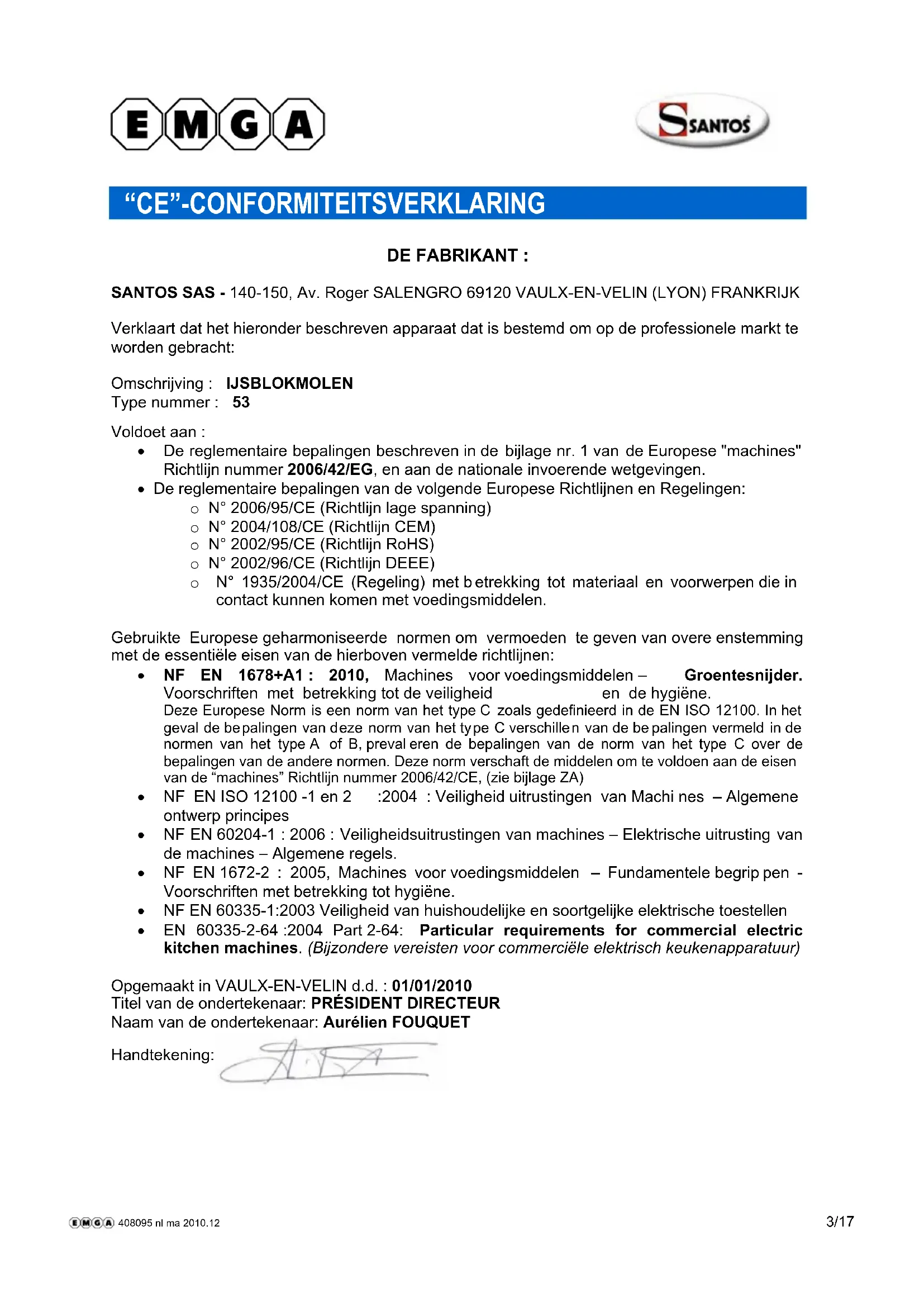 408095 nl ma 2010.12 2/1798153 NL 3.2 – 12 2010 4 / 18 www.santos.fr “CE”-CONFORMITEITSVERKLARING DE FABRIKANT : SANTOS SAS - 140-150, Av. Roger SALENGRO 69120 VAULX-EN-VELIN (LYON) FRANKRIJK Verklaart dat het hieronder beschreven apparaat dat is bestemd om op de professionele markt te worden gebracht: Omschrijving : IJSBLOKMOLEN Type nummer : 53 Voldoet aan : De reglementaire bepalingen beschreven in de bijlage nr. 1 van de Europese "machines" Richtlijn nummer 2006/42/EG, en aan de nationale invoerende wetgevingen. De reglementaire bepalingen van de volgende Europese Richtlijnen en Regelingen: o N° 2006/95/CE (Richtlijn lage spanning) o N° 2004/108/CE (Richtlijn CEM) o N° 2002/95/CE (Richtlijn RoHS) o N° 2002/96/CE (Richtlijn DEEE) o N° 1935/2004/CE (Regeling) met b etrekking tot materiaal en voorwerpen die in contact kunnen komen met voedingsmiddelen. Gebruikte Europese geharmoniseerde normen om vermoeden te geven van overe enstemming met de essentiële eisen van de hierboven vermelde richtlijnen: NF EN 1678+A1 : 2010, Machines voor voedingsmiddelen – Groentesnijder. Voorschriften met betrekking tot de veiligheid en de hygiëne. Deze Europese Norm is een norm van het type C zoals gedefinieerd in de EN ISO 12100. In het geval de bepalingen van deze norm van het type C verschillen van de be palingen vermeld in de normen van het type A of B, preval eren de bepalingen van de norm van het type C over de bepalingen van de andere normen. Deze norm verschaft de middelen om te voldoen aan de eisen van de “machines” Richtlijn nummer 2006/42/CE, (zie bijlage ZA) NF EN ISO 12100 -1 en 2 :2004 : Veiligheid uitrustingen van Machi nes – Algemene ontwerp principes NF EN 60204-1 : 2006 : Veiligheidsuitrustingen van machines – Elektrische uitrusting van de machines – Algemene regels. NF EN 1672-2 : 2005, Machines voor voedingsmiddelen – Fundamentele begrip pen - Voorschriften met betrekking tot hygiëne. NF EN 60335-1:2003 Veiligheid van huishoudelijke en soortgelijke elektrische toestellen EN 60335-2-64 :2004 Part 2-64: Particular requirements for commercial electric kitchen machines. (Bijzondere vereisten voor commerciële elektrisch keukenapparatuur) Opgemaakt in VAULX-EN-VELIN d.d. : 01/01/2010 Titel van de ondertekenaar: PRÉSIDENT DIRECTEUR Naam van de ondertekenaar: Aurélien FOUQUET Handtekening: 408095 nl ma 2010.12 3/1798153 NL 3.2 – 12 2010 5 / 18 www.santos.fr IJSBLOKMOLEN N°53 De ijsblokmolen N° 53 is bestemd voor bars, cafe’s, hotels, restaurants, nachtclubs. Het apparaat is s amengesteld uit een molenlichaam van plastic voorz ien van messen van roestvrij staal, een doorzichtig plastic reservoir met een inhoud van 1,3 kg en een standaard ijsbak. Het apparaat maakt het mogelijk ijsblokjes (kubusvormig of cilindervormig) te malen gemaakt door de traditionele ijsblokmachines. Het apparaat is voorzien van een vertr agingsdrijfwerk met planeetwie len en een asynchroon motor bestuurd door een elektronische kaart. Het apparaat maakt het mogelijk twee ver schillende groottes fijngestampt ijs te vervaardigen. LET OP : Bij het hanteren, en dus ook bij het uitpakken van de machine, is het verboden het apparaat beet te pakken of op te tillen aan het vergrendelingshandvat (2) van het deksel (1). (fig. A) RECYCLAGE VAN HET PRODUCT AAN HET EINDE VAN DE LEVENSDUUR Dit apparaat is voorzien van het symbool van de selectieve sortering betreffende afgedankte elektrische en elektronische apparatuur. Dit betekent dat dit pr oduct verwerkt moet worden door een selectief inzamelingssysteem conform de rich tlijn 2002/96/CE (WEEE) – deel Professionele Apparaten – zodat het gerecycleerd of uit elkaar gehaald kan worden om de impact ervan op het milieu te verminderen. Voor meer informatie kunt u contact opnemen met uw verdeler of met SANTOS. Voor de verwijdering of de recyclage van de componenten van het apparaat, gelieve contact op te nemen met een gespecialiseerde maatschappij of met SANTOS. De elektronische producten die niet selec tief gesorteerd zijn, kunnen m ogelijks een gevaar betekenen voor het milieu. De verpakkingsmaterialen moet en verwijderd en gerecycleerd worden conform de geldende wetgeving. LET OP: Controleren of het deksel (1) in de gesloten stand staat alvorens de steker van het netsnoer (10) in het contactblok van uw stroomnet te steken. (fig. B)