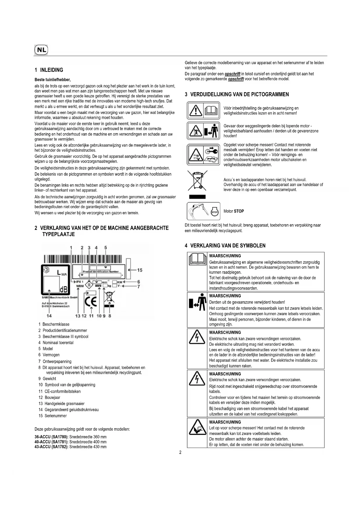 Deze gebruiksaanwijzing geldt voor de volgende modellen: 36-ACCU (SA1780): Snedebreedte 360 mm 40-ACCU (SA1781): Snedebreedte 400 mm 43-ACCU (SA1782): Snedebreedte 430 mm Gelieve de correcte modelbenaming van uw apparaat en het serienummer af te leiden van het typeplaatje. De paragraaf onder een opschrift in tekst cursief en onderlijnd geldt tot aan het volgende zo gemarkeerde opschrift voor het betreffende model.