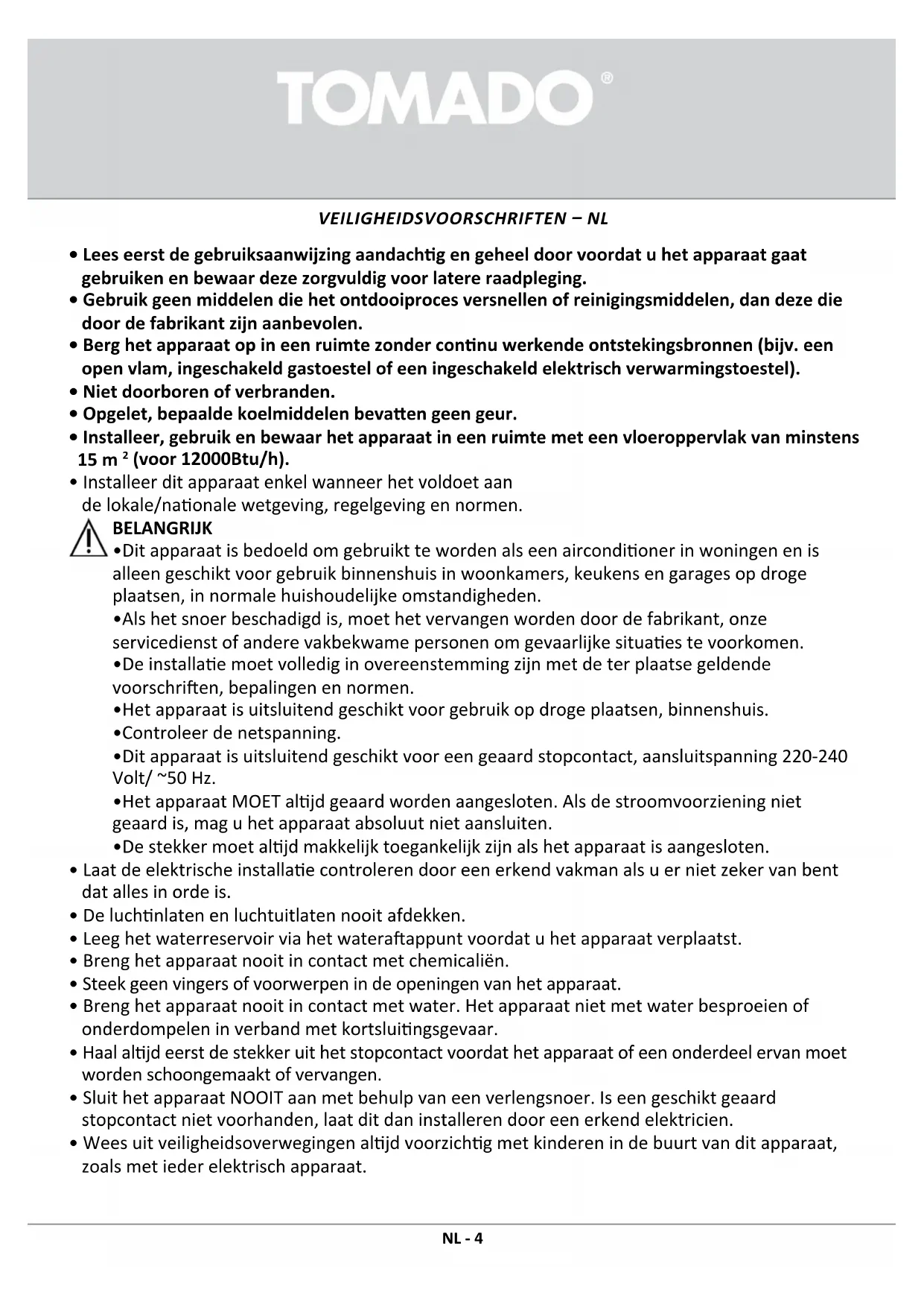 Chladivo/typ GWP/g R-290/3/226 g Teplotný rozsah °C 16 – 31 Rýchlos venlátora 2 Max. emisie hluku dB(A) 65 dB(A) Rozmery (V x Š x H) 715 x 440 x 335 mm Čistá hmotnosť 30,0 kg Stupeň ochrany krytom IP20 Diaľkové ovládanie áno104 Ga naar www.tomado.com/support om accessoires of reserveonderdelen aan te schaen. ACCESSOIRES BESTELLEN Op dit product wordt een garane van 24 maanden verleend. Uw garane is geldig wanneer het product is gebruikt in overeenstemming met de gebruiksaanwijzing en voor het doel waarvoor het gemaakt is. Tevens dient het originele aankoopbewijs overlegd te worden met daarop de aankoopdatum, de naam van de retailer en het arkelnummer van het product. Voor uitgebreide garanevoorwaarden verwijzen wij u naar onze website: www.tomado.com/support GARANTIEVOORWAARDEN