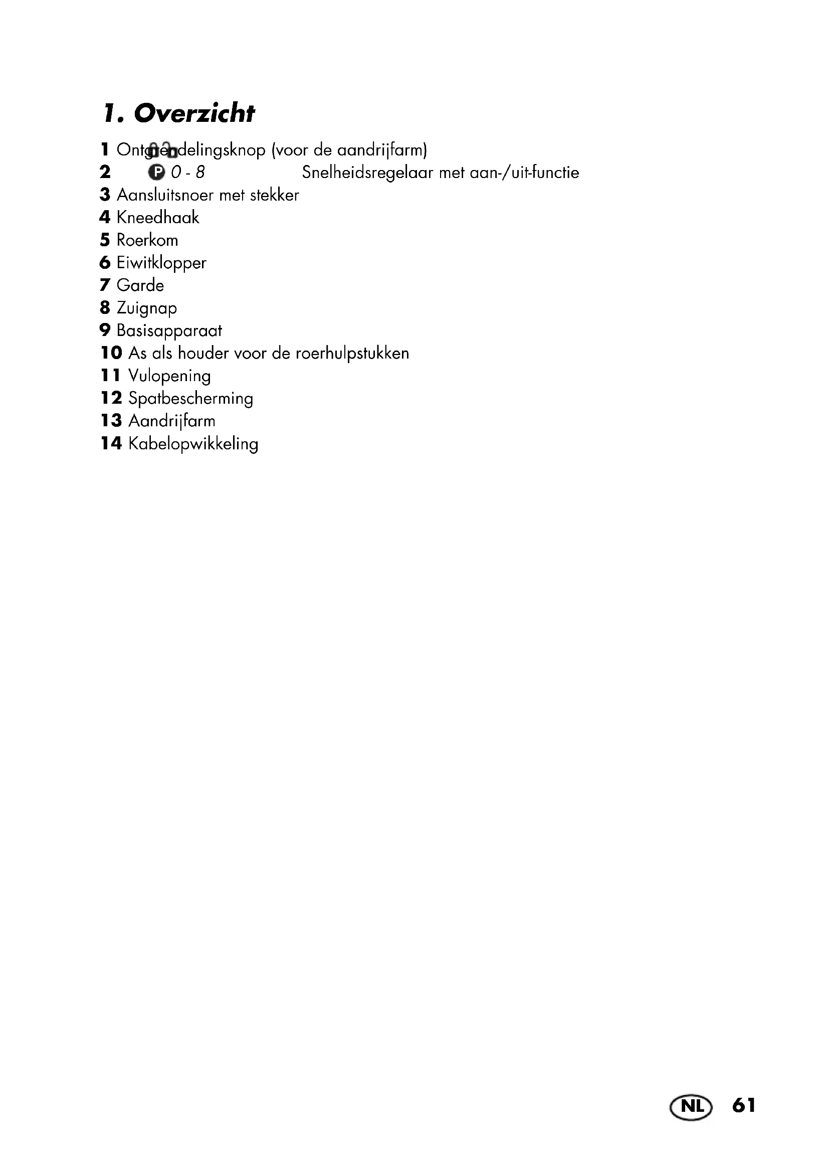 1 Ontgrendelingsknop (voor de aandrijfarm) 2 0 - 8 Snelheidsregelaar met aan-/uit-functie 3 Aansluitsnoer met stekker 4 Kneedhaak 5 Roerkom 6 Eiwitklopper 7 Garde 8 Zuignap 9 Basisapparaat 10 As als houder voor de roerhulpstukken 11 Vulopening 12 Spatbescherming 13 Aandrijfarm 14 Kabelopwikkeling