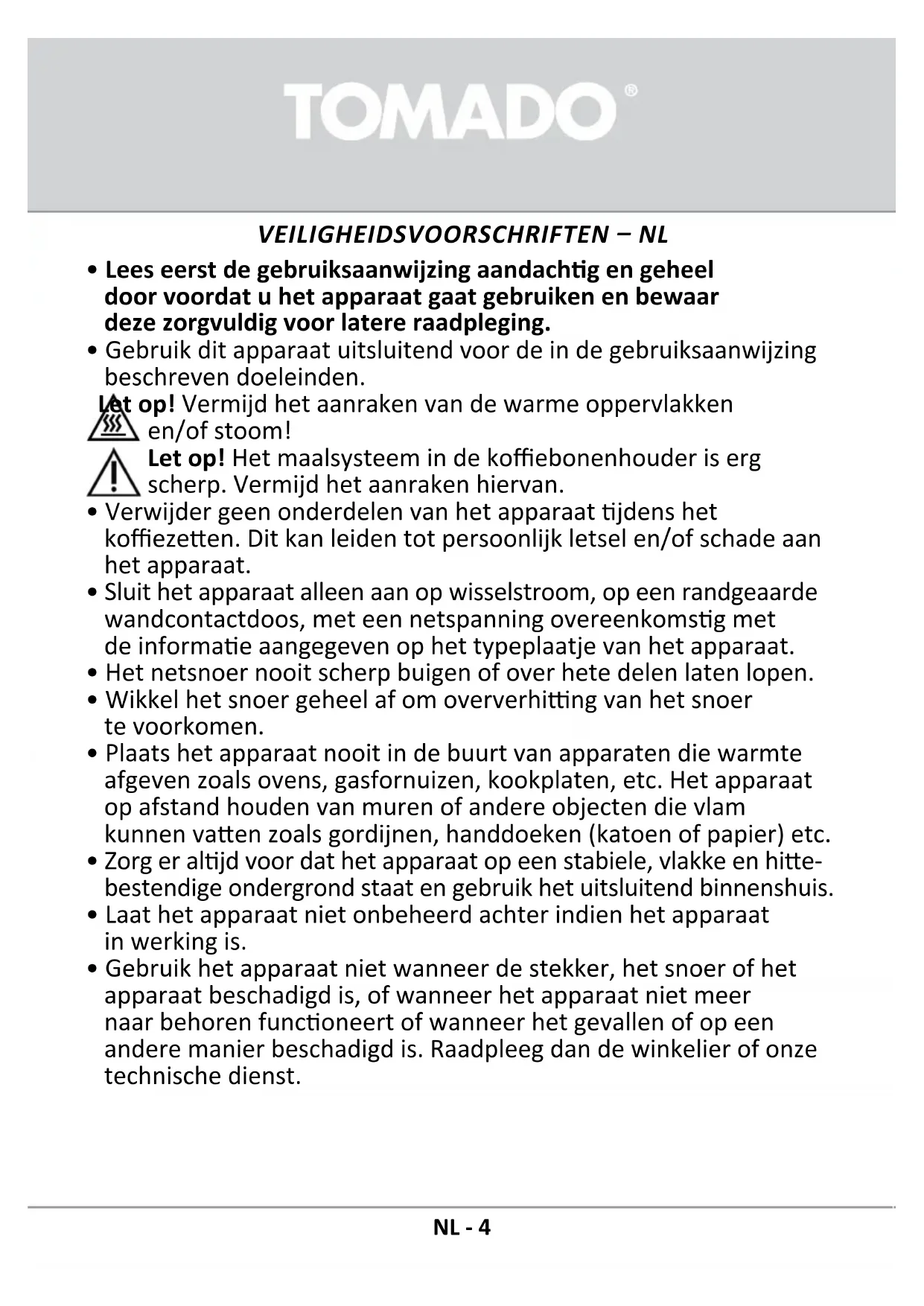 Download de handleiding voor uw Koffiemachine in PDF-formaat gratis! Vind uw handleiding TGB1301S - Tomado en neem uw elektronisch apparaat weer in handen. Op deze pagina staan alle documenten die nodig zijn voor het gebruik van uw apparaat. TGB1301S van het merk Tomado.