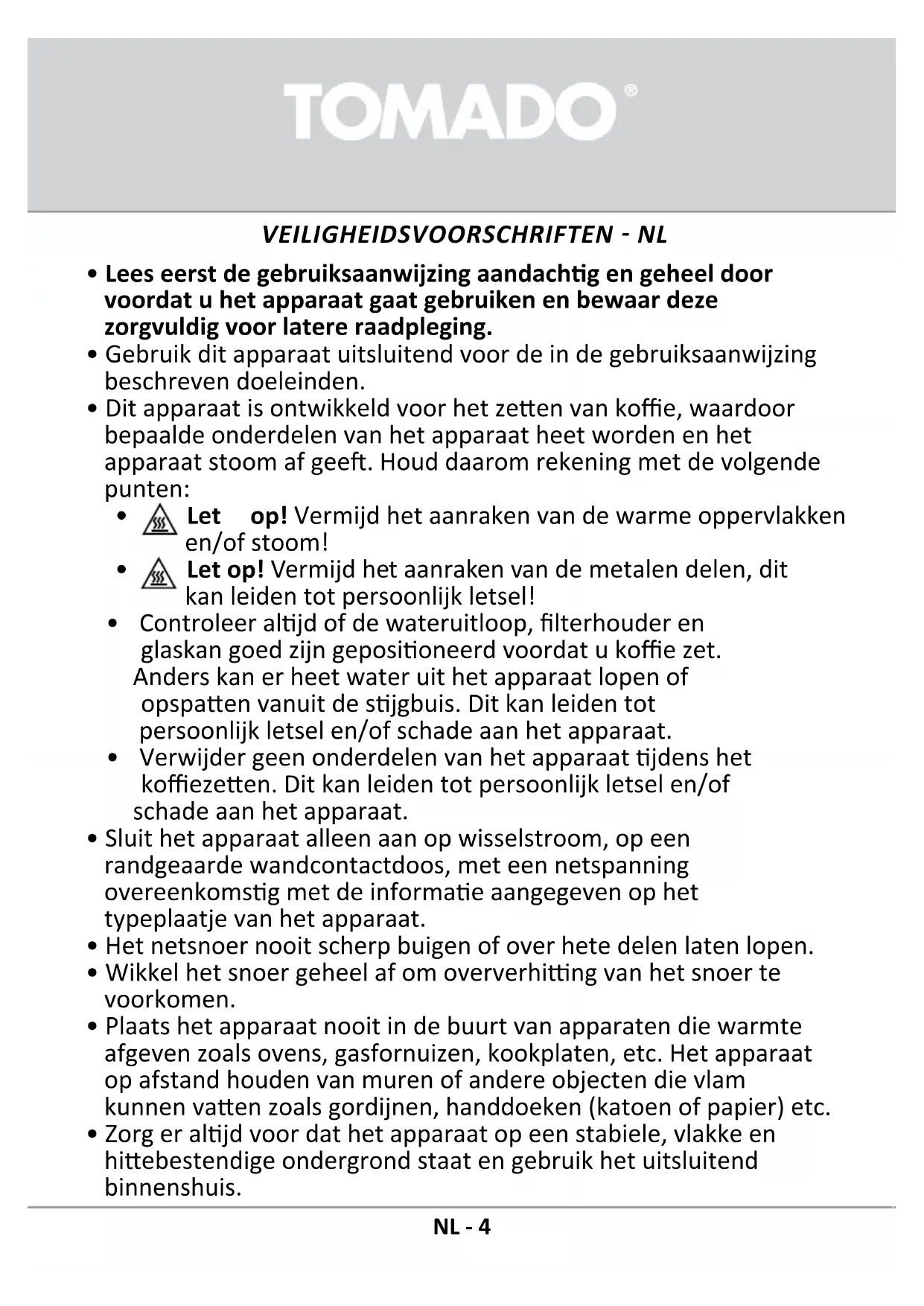 Download de handleiding voor uw Koffiemachine in PDF-formaat gratis! Vind uw handleiding TCM1301S - Tomado en neem uw elektronisch apparaat weer in handen. Op deze pagina staan alle documenten die nodig zijn voor het gebruik van uw apparaat. TCM1301S van het merk Tomado.