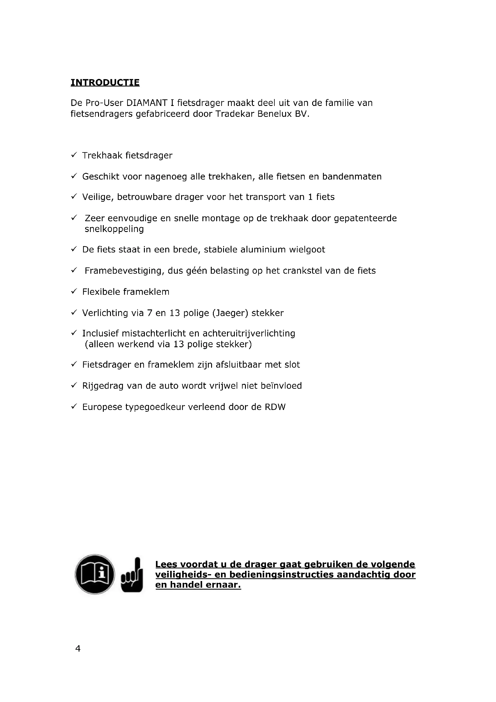 Lees voordat u de drager gaat gebruiken de volgende veiligheids- en bedieningsinstructies aandachtig door en handel ernaar.5 BELANGRIJKE INFORMATIE Voor gebruik goed doorlezen! Dit product niet monteren en gebruiken voordat de montagehandleiding en veiligheidsvoorschriften geheel zijn doorgelezen en duidelijk zijn. De assemblage en montage van de fietsdrager alleen volgens deze montagehandleiding uitvoeren. De stappen die worden genoemd en de veiligheidsinstructies voor montage, bediening en gebruik van de fietsdrager, moeten beslist worden opgevolgd. Al de kleinste afwijking kan leiden tot verkeerde montage of verkeerd gebruik. De drager is geschikt voor het vervoeren van maximaal één fiets. Let op de maximaal toelaatbare kogeldruk. U kunt deze vinden op het typeplaatje van de trekhaak van uw auto (bij de meeste auto’s is deze 75kg). Het totale gewicht van de drager inclusief de fiets mag niet hoger zijn dan de maximaal toelaatbare kogeldruk van de trekhaak. De maximale belasting op de fietsdrager zelf mag 30kg zijn. Het eigen netto gewicht van de drager is ca. 9,5kg. Maximale kogeldruk Gewicht fietsdrager Max. belasting 50kg 9,5kg Max. 30kg 60kg 9,5kg Max. 30kg 75kg 9,5kg Max. 30kg 90kg 9,5kg Max. 30kg