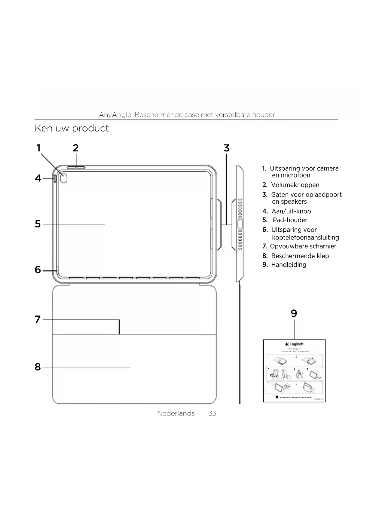 - Zorg dat uw iPad met de juiste kant in de houder is geplaatst. Als uw iPad juist wordt geplaatst, is de camera op uw iPad uitgelijnd met het gat voor de camera en microfoon op het folio (raadpleeg 'Ken uw product'). In de liggende positie moet de Home- toets aan de rechterkant zich aan de rechterkant bevinden. Wat vindt u ervan? Neem even de tijd om ons je mening te geven. Hartelijk dank voor de aanschaf van ons product. www.logitech.com/ithink38 Svenska AnyAngle – Skyddsfodral med flervinkelstativ Produktöversikt