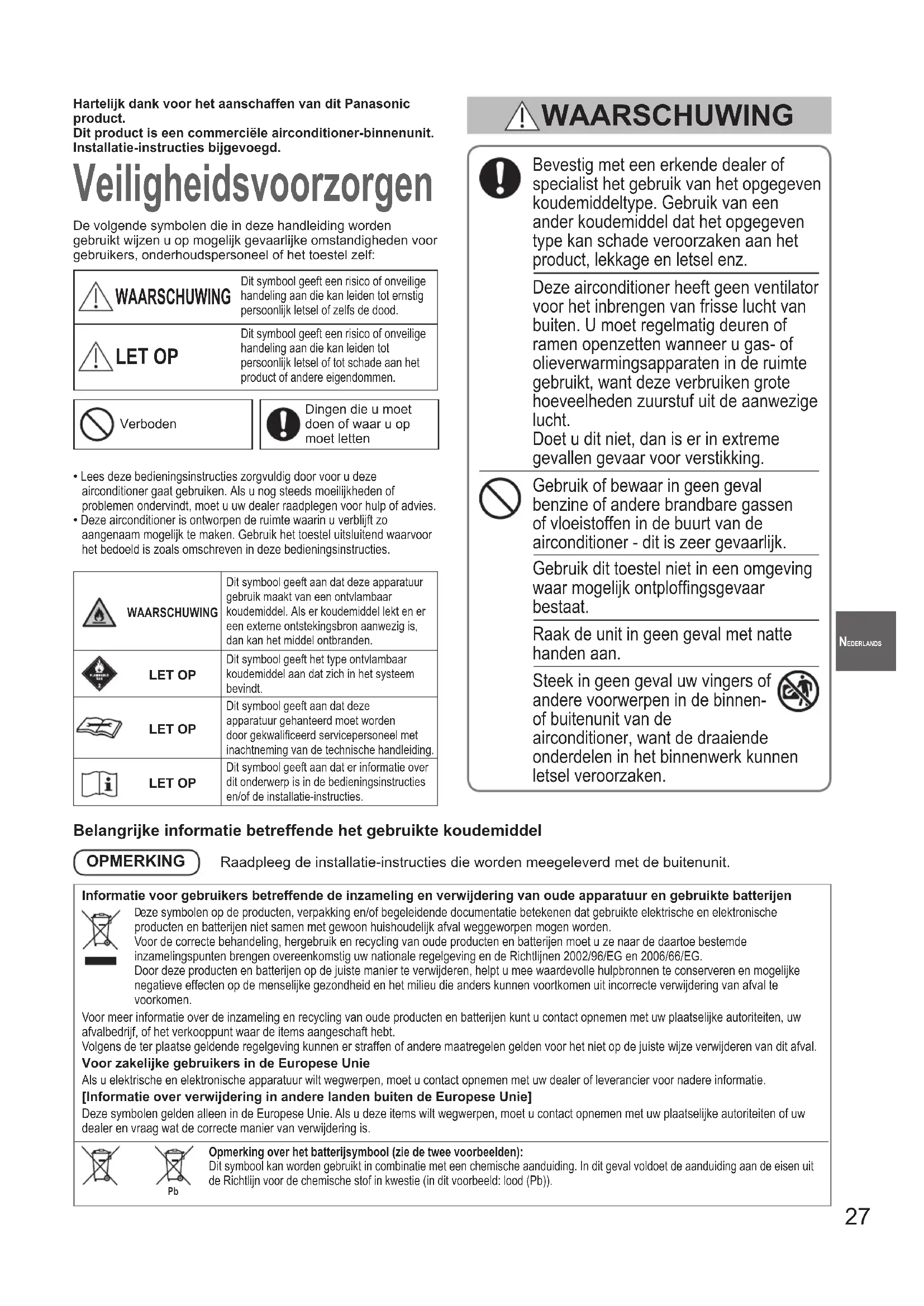 Indicatore del ltroTelecomando cablatoUscita dell’ariaPulire con un panno morbido.(In presenza di molto sporco, usare un panno inumidito con acqua.)Presa d’ariaIndicatore del ltro 00_330260_all.indb 26 2020/11/23 13:35:1427 NEDERLANDSHartelijk dank voor het aanschaffen van dit Panasonic product.Dit product is een commerciële airconditioner-binnenunit.Installatie-instructies bijgevoegd. Veiligheidsvoorzorgen De volgende symbolen die in deze handleiding worden gebruikt wijzen u op mogelijk gevaarlijke omstandigheden voor gebruikers, onderhoudspersoneel of het toestel zelf: WAARSCHUWING Dit symbool geeft een risico of onveilige handeling aan die kan leiden tot ernstig persoonlijk letsel of zelfs de dood. LET OP Dit symbool geeft een risico of onveilige handeling aan die kan leiden tot persoonlijk letsel of tot schade aan het product of andere eigendommen.VerbodenDingen die u moet doen of waar u op moet letten Lees deze bedieningsinstructies zorgvuldig door voor u deze airconditioner gaat gebruiken. Als u nog steeds moeilijkheden of problemen ondervindt, moet u uw dealer raadplegen voor hulp of advies. Deze airconditioner is ontworpen de ruimte waarin u verblijft zo aangenaam mogelijk te maken. Gebruik het toestel uitsluitend waarvoor het bedoeld is zoals omschreven in deze bedieningsinstructies. Bevestig met een erkende dealer of specialist het gebruik van het opgegeven koudemiddeltype. Gebruik van een ander koudemiddel dat het opgegeven type kan schade veroorzaken aan het product, lekkage en letsel enz. Deze airconditioner heeft geen ventilator voor het inbrengen van frisse lucht van buiten. U moet regelmatig deuren of ramen openzetten wanneer u gas- of olieverwarmingsapparaten in de ruimte gebruikt, want deze verbruiken grote hoeveelheden zuurstuf uit de aanwezige lucht. Doet u dit niet, dan is er in extreme gevallen gevaar voor verstikking. Gebruik of bewaar in geen geval benzine of andere brandbare gassen of vloeistoffen in de buurt van de airconditioner - dit is zeer gevaarlijk. Gebruik dit toestel niet in een omgeving waar mogelijk ontplofngsgevaar bestaat. Raak de unit in geen geval met natte handen aan. Steek in geen geval uw vingers of andere voorwerpen in de binnen- of buitenunit van de airconditioner, want de draaiende onderdelen in het binnenwerk kunnen letsel veroorzaken. WAARSCHUWING WAARSCHUWINGDit symbool geeft aan dat deze apparatuur gebruik maakt van een ontvlambaar koudemiddel. Als er koudemiddel lekt en er een externe ontstekingsbron aanwezig is, dan kan het middel ontbranden.LET OPDit symbool geeft het type ontvlambaar koudemiddel aan dat zich in het systeem bevindt.LET OPDit symbool geeft aan dat deze apparatuur gehanteerd moet worden door gekwalificeerd servicepersoneel met inachtneming van de technische handleiding.LET OPDit symbool geeft aan dat er informatie over dit onderwerp is in de bedieningsinstructies en/of de installatie-instructies.Belangrijke informatie betreffende het gebruikte koudemiddelOPMERKING Raadpleeg de installatie-instructies die worden meegeleverd met de buitenunit.Informatie voor gebruikers betreffende de inzameling en verwijdering van oude apparatuur en gebruikte batterijen