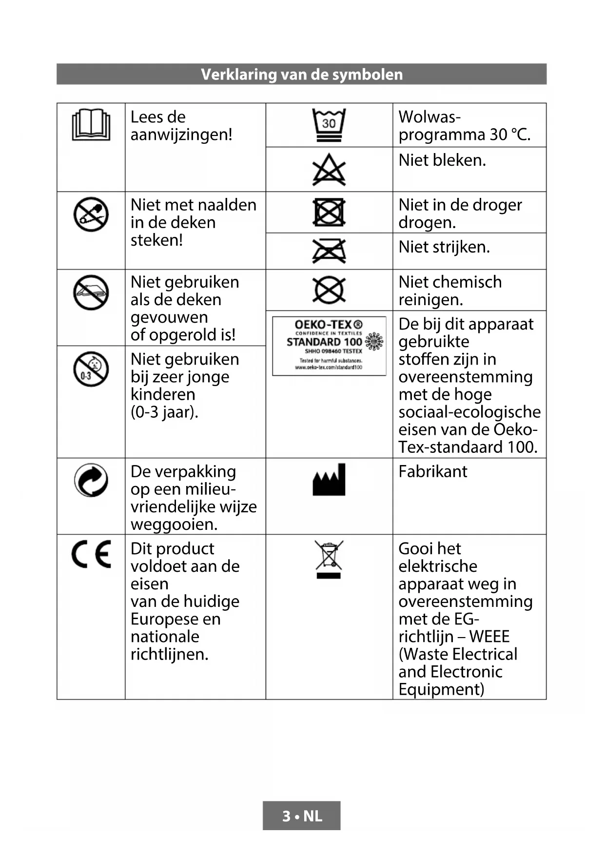 Manual GebrauchsanweisungGebruiksaan wijzing pagina 3 Mode d’emploi page 30 Manual page 12 Gebrauchsanweisung Seite 21 2Lees de aanwijzingen! Wolwas- programma 30 °C. Niet bleken. Niet met naalden in de deken steken! Niet in de droger drogen. Niet strijken. Niet gebruiken als de deken gevouwen of opgerold is! Niet chemisch reinigen. De bij dit apparaat gebruikte stoen zijn in overeenstemming met de hoge sociaal-ecologische eisen van de Oeko- Tex-standaard 100. Niet gebruiken bij zeer jonge kinderen (0-3 jaar). De verpakking op een milieu- vriendelijke wijze weggooien. Fabrikant Dit product voldoet aan de eisen van de huidige Europese en nationale richtlijnen. Gooi het elektrische apparaat weg in overeenstemming met de EG- richtlijn – WEEE (Waste Electrical and Electronic Equipment) 3 • NL Verklaring van de symbolenHet apparaat is dubbel geïsoleerd en is in overeenstemming met beschermings- klasse 2. De elektrische deken is geschikt voor 1 persoon. WAARSCHUWING; Waarschuwing voor risico op letsel of gevaar voor uw gezondheid. OPGELET; Veiligheidswaarschuwing voor mogelijke schade aan het apparaat of toebehoren. ATTENTIE; Aandachtspunt voor belangrijke informatie. 4 • NLVeiligheidsvoorschriften Belangrijke veiligheidsaanwijzingen - aandachtig lezen en bewaren voor later gebruik! WAARSCHUWING