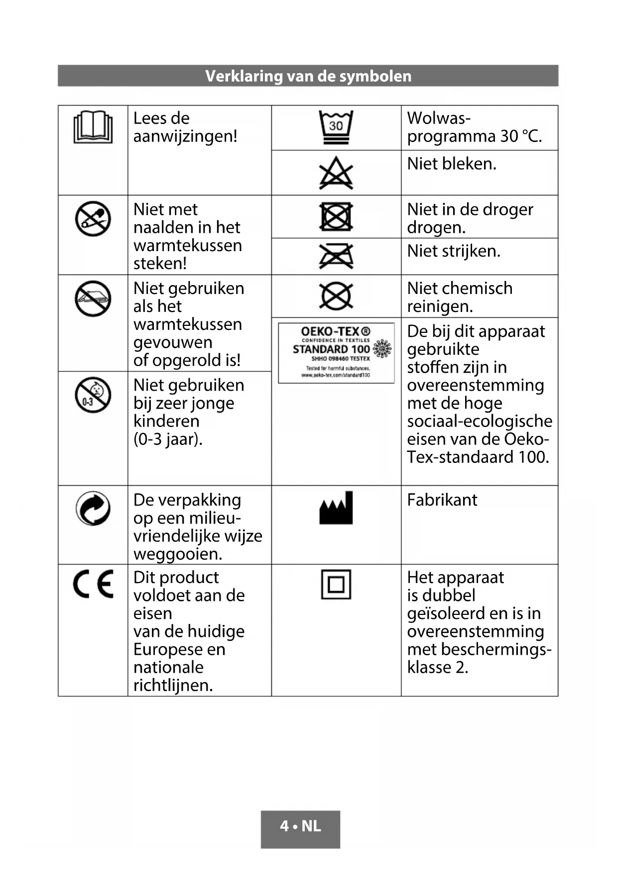 - Leg tijdens het opbergen geen voorwerpen op het warmtekussen om te voorkomen dat er een scherpe knik in de bedrading ontstaat. 11 • NLRecycling Dit symbool betekent dat dit product niet bij het gewone huishoudelijke afval mag worden weggegooid (2012/19/EU). Volg de geldende regels in uw land voor de gescheiden inzameling van elektrische en elektronische producten. Als u het product correct afvoert, voorkomt u negatieve gevolgen voor het milieu en de volksgezondheid. Het verpakkingsmateriaal van dit product is 100% recyclebaar, lever het verpakkingsmateriaal gescheiden in. 12 • NLRead the instructions! Wool wash program 30 °C. Do not bleach. Do not stick needles in the heating pad! Do not dry in dryer. Do not iron. Do not use when the heating pad is folded or rolled! Do not dry clean. The fabrics used with this appliance are in correspondence with the high social ecological requirements of Oeko-Tex standard