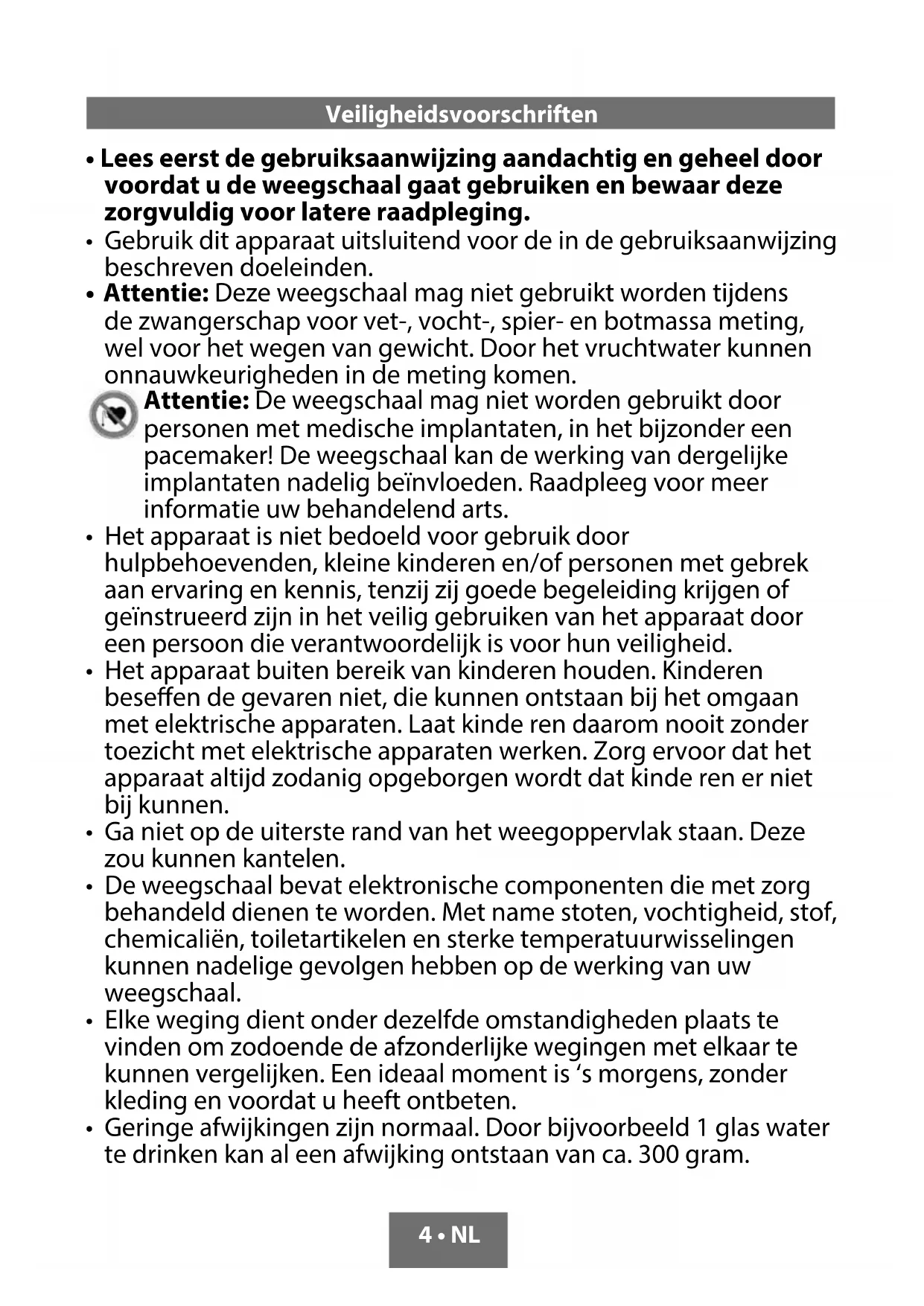 Attentie: De weegschaal mag nicht worden gebrukt door Personen met medische implantaten, in het bijzonder een pacemaker! De weegschaal kan de werkking van dergelijkte implantaten nadelig beinvloeden. Raadpleeg voor meer informatatie uw behandelend arts.