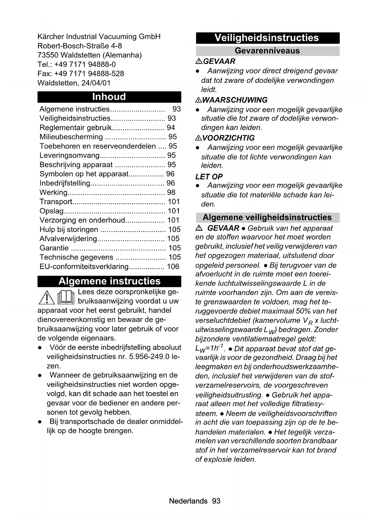 WAARSCHUWING U mag het apparaat Niet opstellen of gebruiken opplaatsen waar het risico op stof- of gasexplosionie bestaat. Een stofexplosionie atmosefer in het apparaat is alleen toegestaan voor het filter. In het apparaat zijn gasexplosionie atmoseferen verboden. Het apparaat is Niet geschikt voor het opzuigen van ontvlambare vloeistoffen (ontvlambaar,licht ontvlambaar,zeren ontvlambaar volgens de Duitserichtlijn 67/548/EEG inzake gevaarlijkestoffen) (vlampunt onder 55^) en mengels van ontvlambare stoffen met ontvlambare vloeistoffen. Het apparaat is Niet geschikt om stof te absorberen met een extreem lage minimale ontstekingsenergie (ME < 1mJ) zoals: toner, netzwavel, alumi-niumpoeder, loodzeep. Het apparaat is Niet geschikt voor het opzuigen van ontstekingsbronnen en stof met een gloeitemperatur ≤ 190^. Controlleroor elkingebruikname of de potentaalvereffen-ingsleidingen (massaleidingen) aangeslo-ten zich. Het apparaat mag Niet in de openlucht in natte omstandigheden worden gebruikt of bewaard. Gebruik voor een veilige stand van het apparaat de parkeerrem aan het zwenkwiel. Als het apparaat Niet op de rem worden gezet, kan het once-controleerd gaan bewegen.