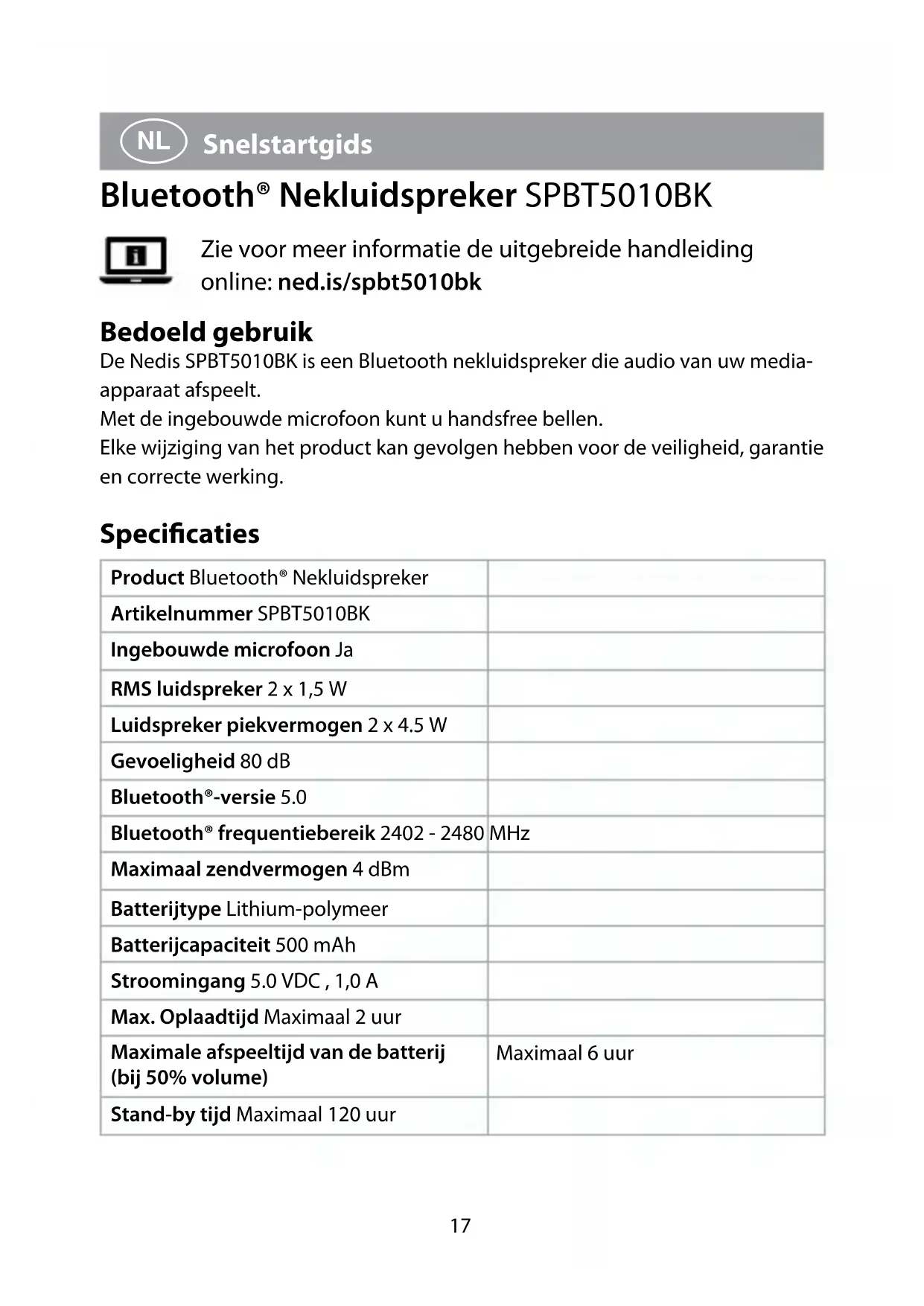Vind de handleiding van het apparaat gratis SPBT5010BK NEDIS in PDF-formaat.