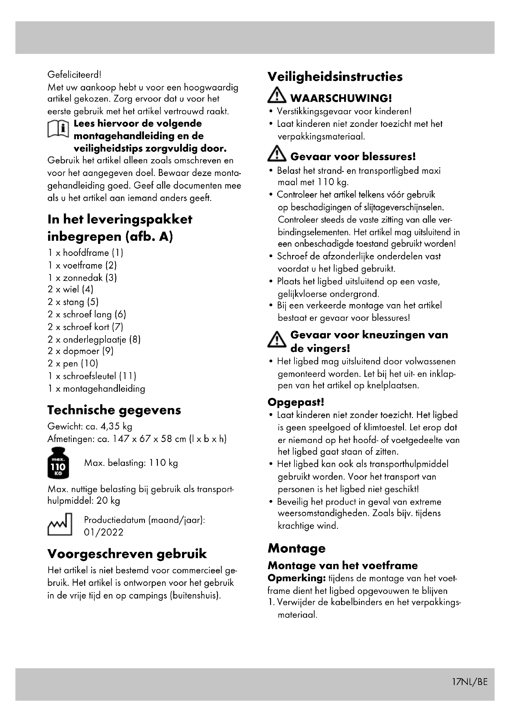 - Het ligbed mag uitsluitend door volwassenen gemonteerd worden. Let bij het uit- en inklap- pen van het artikel op knelplaatsen. Opgepast!