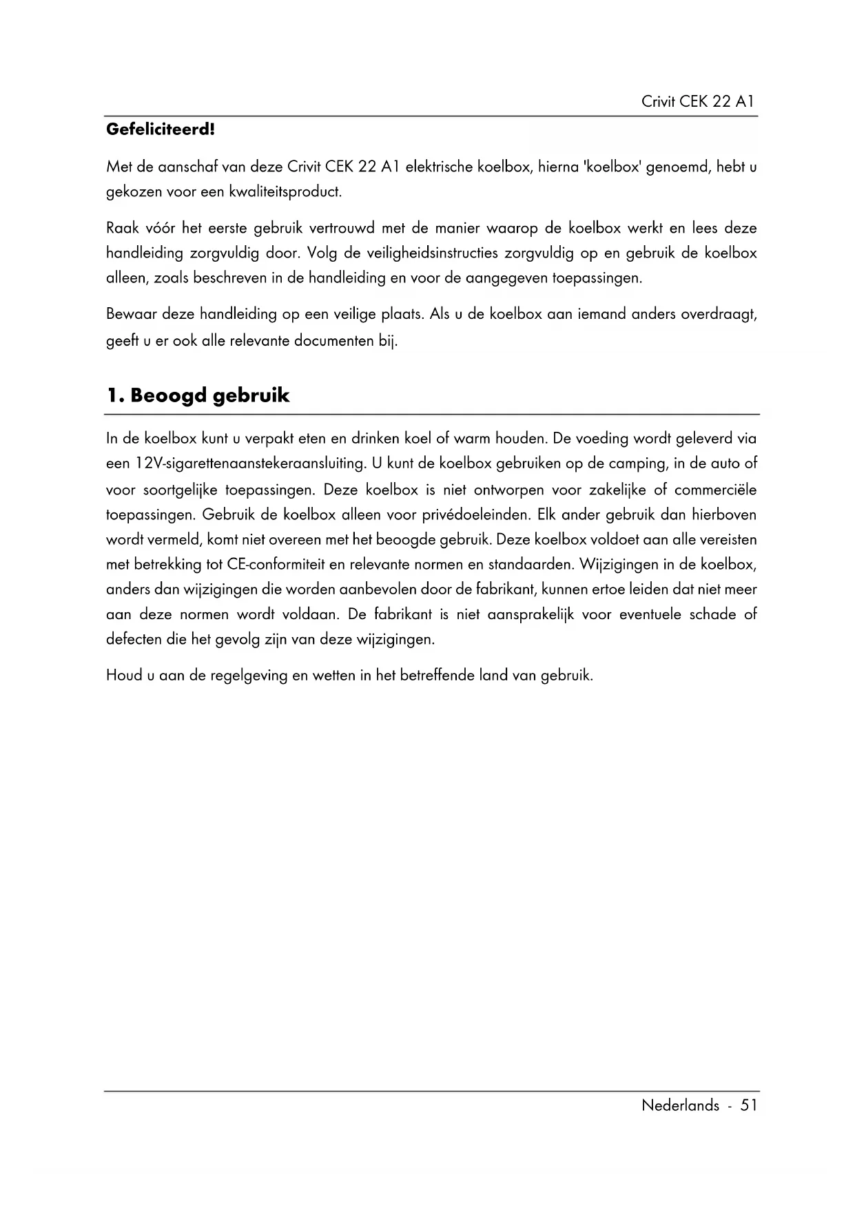 14. Garantie- en servicegegevens ..................................................................... 63Crivit CEK 22 A1 Nederlands - 51 Gefeliciteerd! Met de aanschaf van deze Crivit CEK 22 A1 elektrische koelbox, hierna 'koelbox' genoemd, hebt u gekozen voor een kwaliteitsproduct. Raak vóór het eerste gebruik vertrouwd met de manier waarop de koelbox werkt en lees deze handleiding zorgvuldig door. Volg de veiligheidsinstructies zorgvuldig op en gebruik de koelbox alleen, zoals beschreven in de handleiding en voor de aangegeven toepassingen. Bewaar deze handleiding op een veilige plaats. Als u de koelbox aan iemand anders overdraagt, geeft u er ook alle relevante documenten bij.