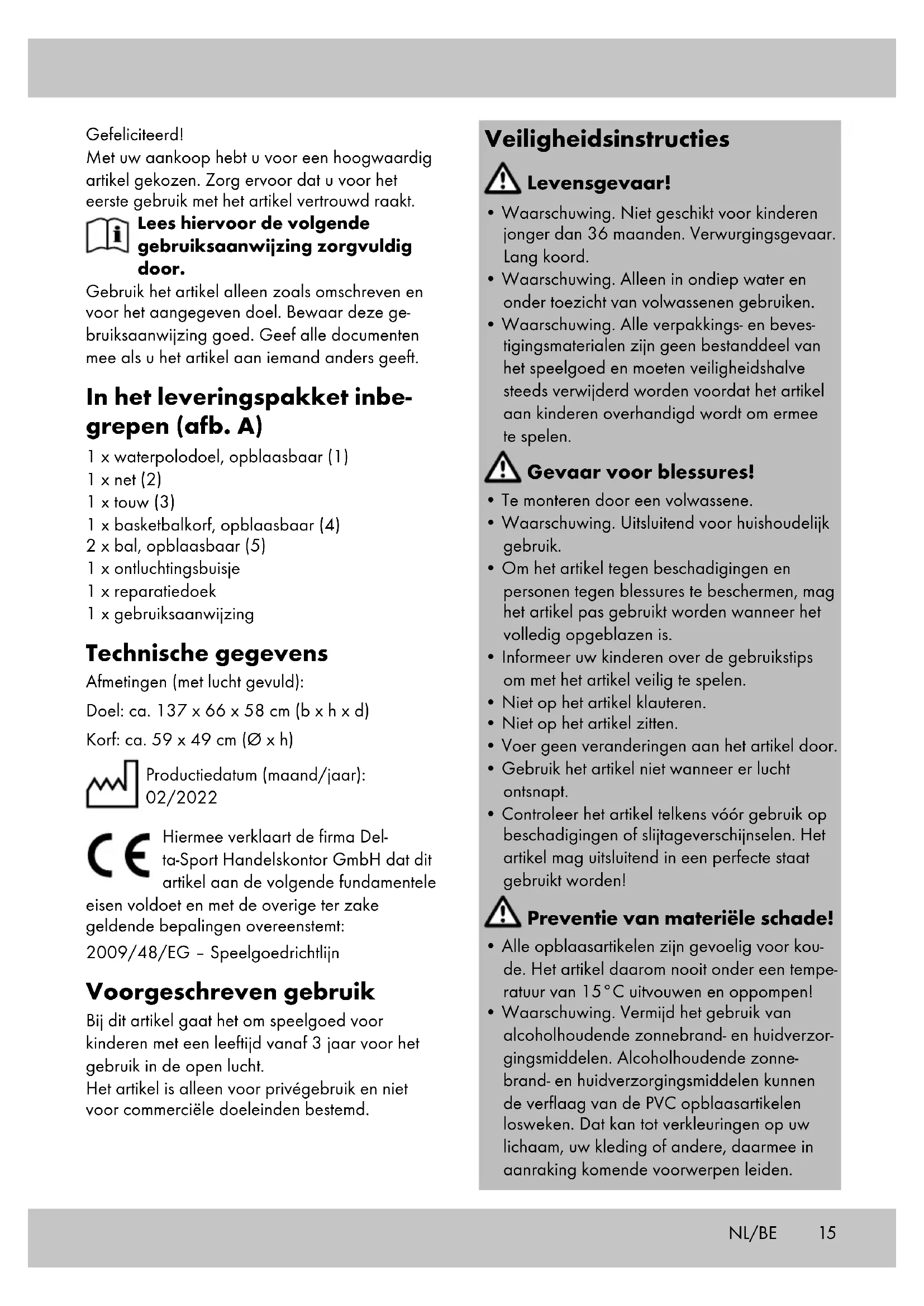 op het beschadigde oppervlak en druk de doek stevig aan. Opslag, reiniging Berg het artikel bij niet-gebruik altijd droog, schoon en niet opgepompt bij kamertemperatuur op. De ventielen dienen bij de opslag steeds geslo- ten te zijn. Bij het opbergen in de winter geen scherpe voorwerpen op het artikel zetten en niet met talkpoeder bestrooien. Reinig het artikel alleen met een vochtige schoonmaakdoek en droog het vervolgens af. BELANGRIJK! Reinig nooit met agressieve reini- gingsmiddelen. Afvalverwerking Voer het artikel en verpakkingsmaterialen in overeenstemming met actuele lokale voor- schriften af. Verpakkingsmaterialen, zoals bv. foliezakjes, horen niet thuis in kinderhanden. Berg het verpakkingsmateriaal buiten het bereik van kinderen op. Voer de producten en verpakkingen op milieuvriendelijke wijze af. De recyclingcode dient om verschillende materialen te kenmerken ten behoeve van hergebruik via het recyclingproces. De code bestaat uit het recyclingsymbool, dat het recyclingproces weerspiegelt, en een getal dat het materiaal identificeert. Opmerkingen over garantie en serviceafhandeling Het artikel werd met de grootste zorgvuldigheid en onder permanent toezicht geproduceerd. De firma DELTA-SPORT HANDELSKONTOR GmbH verleent particuliere eindklanten op dit artikel drie jaar garantie, te rekenen vanaf de datum van aankoop (garantietermijn) en dit op grond van de volgende bepalingen. De garantie geldt alleen voor materiaal- en verwerkingsfouten. De garantie is niet van toepassing op onderde- len die aan een normale slijtage onderhevig zijn en daarom als niet-slijtvaste onderdelen te beschouwen zijn (bv. batterijen) en evenmin op breekbare onderdelen, bv. schakelaars, accu’s of onderdelen die van glas gemaakt zijn. Uit de garantie voortvloeiende claims zijn uitgesloten als het artikel onvakkundig, verkeerd of niet in het kader van de voorziene bepaling of in het kader van het voorziene gebruiksdoel- einde gebruikt werd of indien richtlijnen in de gebruiksaanwijzing niet in acht genomen wer- den, tenzij de eindklant aantoont dat er sprake is van een materiaal- of verwerkingsfout die niet op één van de hoger vermelde omstandigheden gebaseerd is. Uit de garantie voortvloeiende claims kunnen alleen tijdens de garantieperiode op vertoon van de originele kassabon ingediend worden. Gelieve daarom de originele kassabon te bewaren. De garantieperiode wordt door eventuele reparaties op grond van de garantie, wettelijke waarborg of coulance niet verlengd. Dit geldt ook voor vervangen en gerepareerde onderdelen. Gelieve u bij klachten in eerste instantie tot de hieronder vermelde servicehotline te richten of met ons per e-mail contact op te nemen. Is er sprake van een garantiegeval, dan wordt het artikel door ons – naar onze keuze – voor u gratis gerepareerd, wordt het vervangen of wordt de aankoopsom terugbetaald. Verdere rechten op grond van de garantie bestaan niet. Uw wettelijke rechten, in het bijzonder rechten op garantie tegenover de betreffende verkoper, worden door deze garantie niet beperkt.18 IAN: 388686_2107 Service België Tel.:070 270 171 (0,15 EUR/Min.) E-Mail: deltasport@lidl.be Service Nederland Tel.: 08000249630 E-Mail: deltasport@lidl.nl NL/BE19 Gratulujemy! Decydując się na ten produkt, otrzymują Państwo towar wysokiej jakości. Należy zapoznać się z produktem przed jego pierwszym użyciem. Należy uważnie przeczytać nastę- pującą instrukcję użytkowania. Produkt ten należy użytkować wyłącznie w opisany sposób oraz zgodnie ze wskazanym przeznaczeniem. Niniejszą instrukcję użytko- wania należy przechowywać w bezpiecznym miejscu. Przekazując produkt innej osobie, należy upewnić się, że otrzyma ona także całą dokumentację dotyczącą produktu. Zakres dostawy (rys. A) 1 x bramka do piłki wodnej, nadmuchiwana (1) 1 x siatka (2) 1 x linka (3) 1 x kosz do koszykówki, nadmuchiwany (4) 2 x piłka, nadmuchiwana (5) 1 x rurka do spuszczania powietrza 1 x łatka naprawcza 1 x instrukcja użytkowania Dane techniczne Wymiary (po nadmuchaniu): Bramka: ok. 137 x 66 x 58 cm (szer. x wys. x gł.) Kosz: ok. 59 x 49 cm (Ø x wys.) Data produkcji (miesiąc/rok): 02/2022 Delta-Sport Handelskontor GmbH oświadcza niniejszym, że ten artykuł jest zgodny z zasadniczymi wymoga- mi i innymi stosownymi postanowieniami: 2009/48/WE – Dyrektywa w sprawie bezpie- czeństwa zabawek Zastosowanie zgodne z przeznaczeniem Niniejszy artykuł jest zabawką dla dzieci w wieku powyżej 3 lat do użytku na wolnym po- wietrzu. Artykuł ten przeznaczony jest wyłącznie do użytku prywatnego i nie nadaje się do użytku komercyjnego. Wskazówki bezpieczeństwa Zagrożenie dla życia!