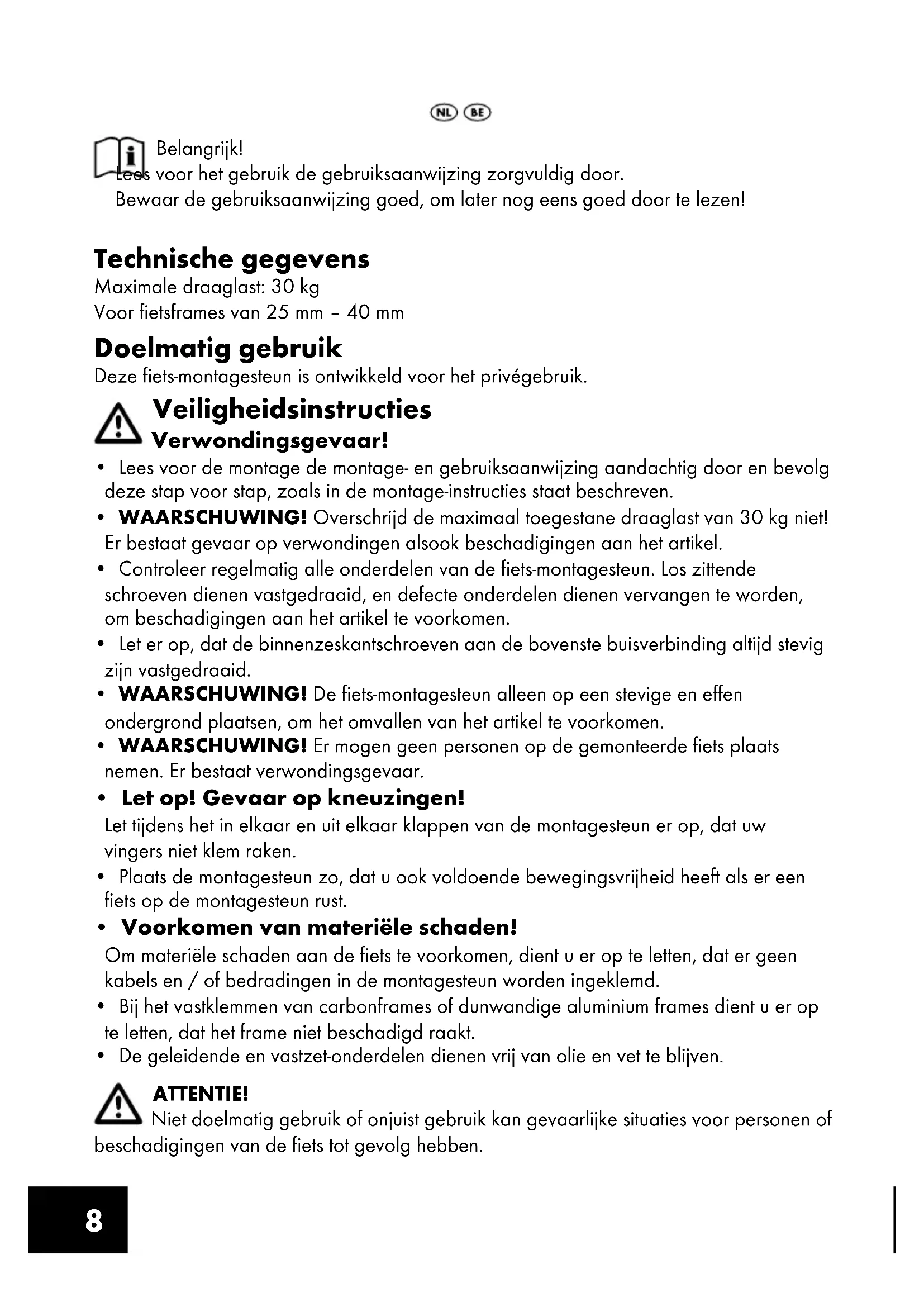 - WAARSCHUWING! De fiets-montagesteun alleen op een stevige en effen ondergrond plaatsen, om het omvallen van het artikel te voorkomen.