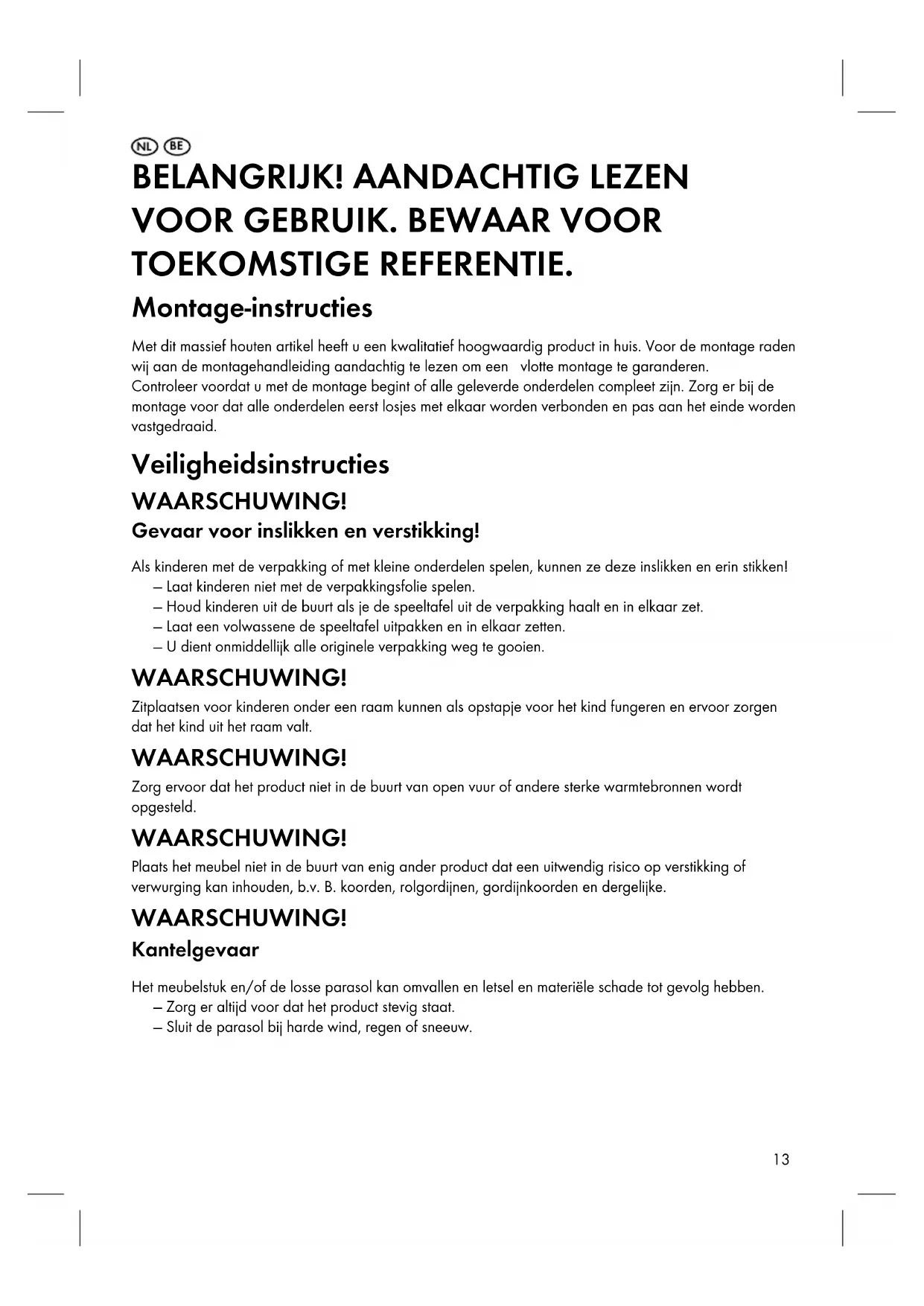 TOEKOMSTIGE REFERENTIE. Montage-instructies Met dit massief houten artikel heeft u een kwalitatief hoogwaardig product in huis. Voor de montage raden wij aan de montagehandleiding aandachtig te lezen om een vlotte montage te garanderen. Controleer voordat u met de montage begint of alle geleverde onderdelen compleet zijn. Zorg er bij de montage voor dat alle onderdelen eerst losjes met elkaar worden verbonden en pas aan het einde worden vastgedraaid. Veiligheidsinstructies WAARSCHUWING! Gevaar voor inslikken en verstikking! Als kinderen met de verpakking of met kleine onderdelen spelen, kunnen ze deze inslikken en erin stikken! — Laat kinderen niet met de verpakkingsfolie spelen. — Houd kinderen uit de buurt als je de speeltafel uit de verpakking haalt en in elkaar zet. — Laat een volwassene de speeltafel uitpakken en in elkaar zetten. — U dient onmiddellijk alle originele verpakking weg te gooien. WAARSCHUWING! Zitplaatsen voor kinderen onder een raam kunnen als opstapje voor het kind fungeren en ervoor zorgen dat het kind uit het raam valt. WAARSCHUWING! Zorg ervoor dat het product niet in de buurt van open vuur of andere sterke warmtebronnen wordt opgesteld. WAARSCHUWING! Plaats het meubel niet in de buurt van enig ander product dat een uitwendig risico op verstikking of verwurging kan inhouden, b.v. B. koorden, rolgordijnen, gordijnkoorden en dergelijke. WAARSCHUWING! Kantelgevaar Het meubelstuk en/of de losse parasol kan omvallen en letsel en materiële schade tot gevolg hebben. — Zorg er altijd voor dat het product stevig staat. — Sluit de parasol bij harde wind, regen of sneeuw.14 LET OP! Verwondingsgevaar door rondvliegende onderdelen. Bij harde wind kan de parasol uit de openingen in de tafel worden getrokken. Daarom is de tafel niet geschikt als standaard voor de parasol. De openingen in de tafel mogen alleen gebruikt worden om de gesloten en vastgebonden parasol op te bergen. — Voordat u de parasol opent, bevestigt u deze alleen aan een geschikte parasolstandaard naast het kinderzitje. De parasolstandaard dient te beschikken over een diameter van 32 mm voor de parasol en een eigen gewicht van minimaal 25 kg. — Controleer altijd of de parasol goed vastzit aan de houder voordat u deze opent. LET OP! Gevaar voor letsel door bewegende delen. Voordat u het product opent en sluit, moet u ervoor zorgen dat niemand zich in het openings- of sluitgebied van de paraplu bevindt. LET OP! Verwondingsgevaar door beknelling. Let er bij het openen en sluiten op dat uw handen niet in het openings- of sluitmechanisme van de paraplu komen. LET OP! Laat de geopende paraplu niet onbeheerd achter. Onverwachte sterkere wind kan schade veroorzaken veiligheidsinstructies