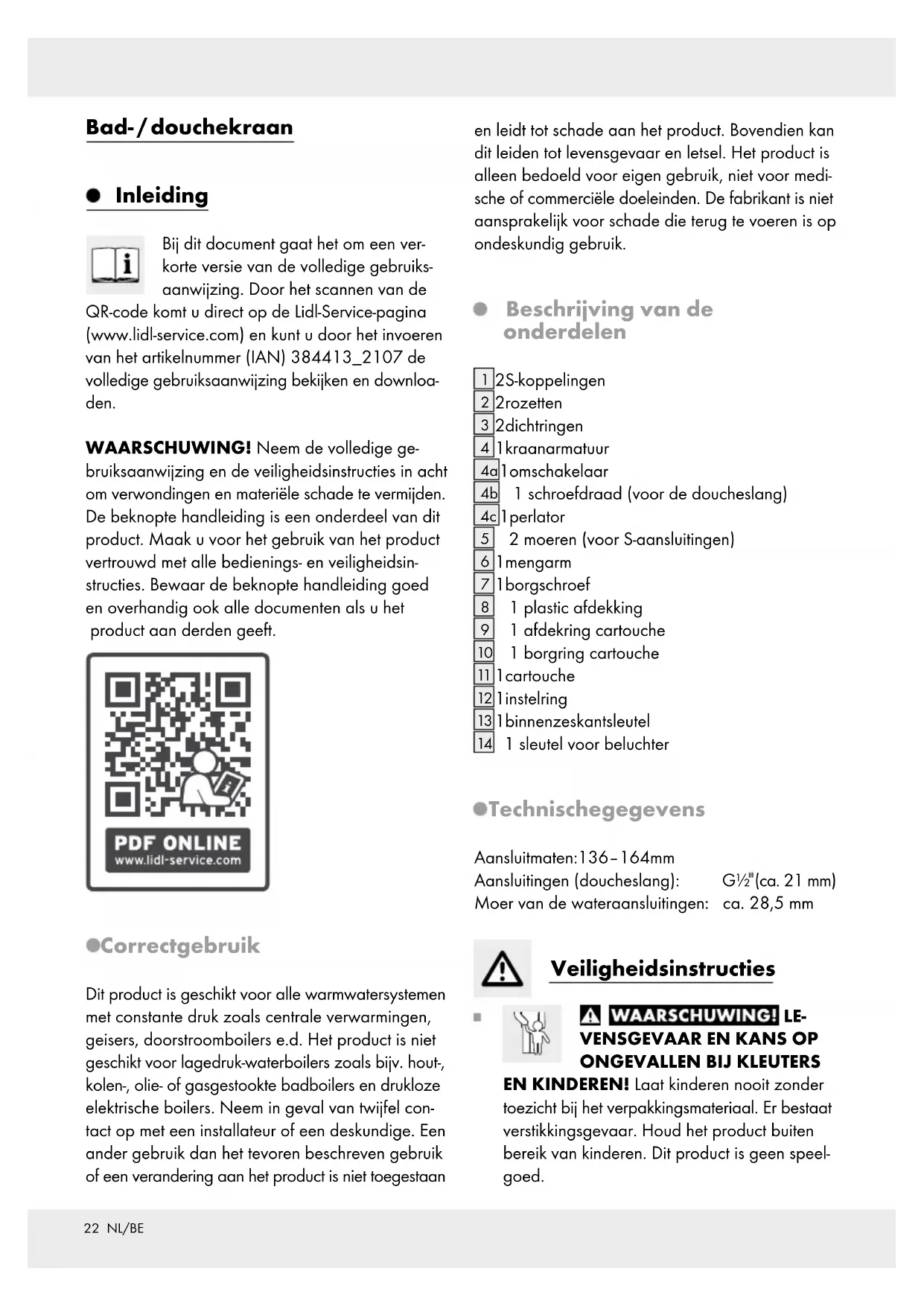 1 sleutel voor beluchter Technische gegevens Aansluitmaten: 136–164 mm Aansluitingen (doucheslang): G½ (ca. 21 mm) Moer van de wateraansluitingen: ca. 28,5 mm Veiligheidsinstructies LE-
