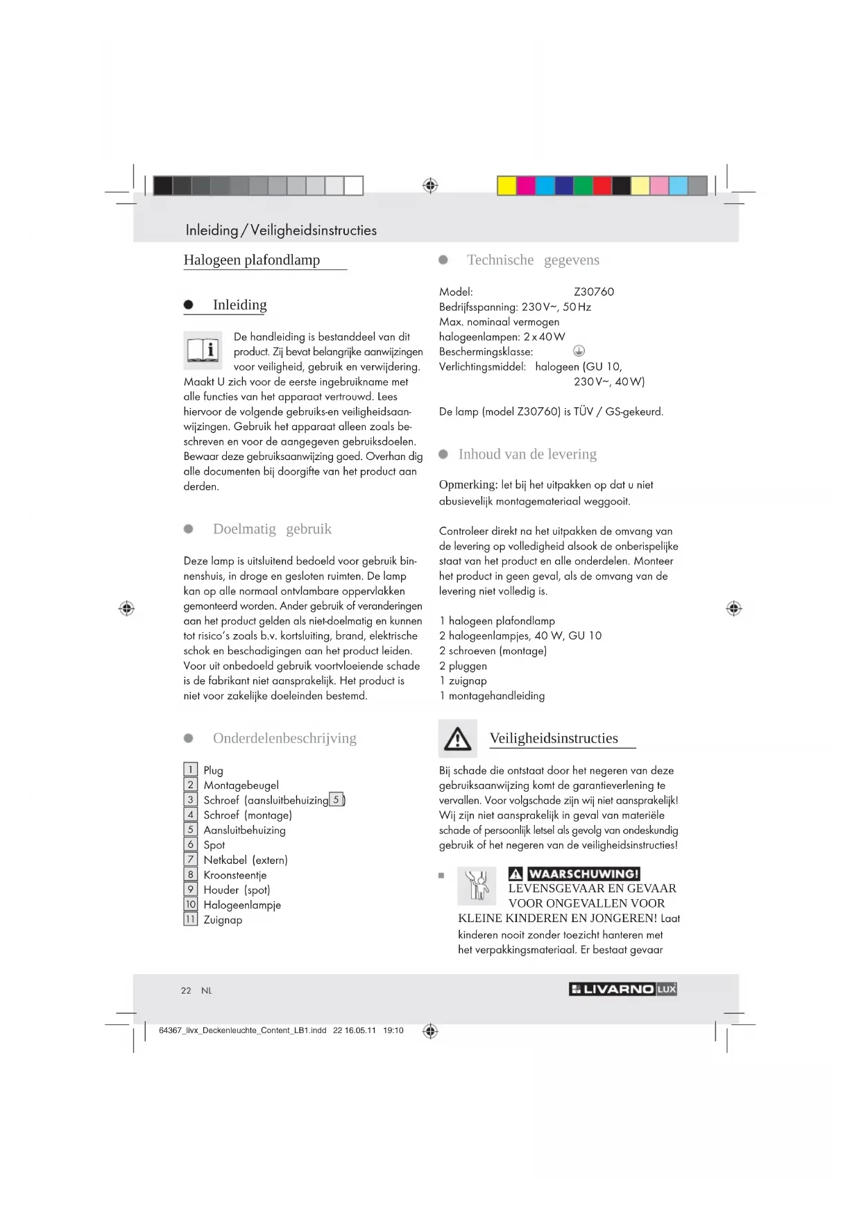 BRANDING! Waarborg dat de lamp uitge- schakeld en 30 minuten afgekoeld is voordat u hem aanraakt. Verlichtingsmiddelen kunnen grote hitte ontwikkelen. 64367_livx_Deckenleuchte_Content_LB1.indd 23 16.05.11 19:1024 NL Veiligheidsinstructies / Voorbereiding / Vóór de montage / Montage Zo handelt u correct Controleer vóór de plafondmontage eerst of het plafond stevig genoeg is om de lamp te dragen. Neem eventueel contact op met een vakman. Informeer vóór de plafondmontage naar het geschikte montagemateriaal voor uw plafond. Voor de plafondmontage hebben wij montage- materiaal bijgevoegd dat geschikt is voor normaal vast muurwerk. Vervang defecte verlichtingsmiddelen onmid- dellijk door nieuwe. In het andere geval kan de lamp beschadigd raken. Gebruik alléén 230 V ∼ halogeenlampjes met een GU 10-sokkel en een maximaal vermogen van 40 Watt. Monteer de lamp zodanig dat hij beschermd wordt tegen vocht en verontreiniging. Voorbereiding Vereist gereedschap en materiaal De genoemde gereedschappen en materialen zijn niet bij de leveringsomvang inbegrepen. Het gaat hierbij om niet-bindende gegevens en waarden ter oriëntatie. De hoedanigheid van het materiaal is afhankelijk van de individuele voorwaarden ter plekke. – potlood / markeergereedschap – spanningzoeker – kruiskopschroevendraaier – boormachine – boor – zijsnijder – ladder – hamer Vóór de montage Belangrijk: laat de installatie uitvoeren door een opgeleide elektricien of een voor elektro-installaties bevoegde persoon. Deze persoon moet op de hoogte zijn van de eigenschappen van de lamp en van de aansluitbepalingen. Maak u vóór de montage vertrouwd met alle aanwijzingen en afbeeldingen in deze handlei- ding en met de lamp zelf. Waarborg vóór de montage dat er geen spanning staat op de netkabel waarop de lamp moet worden aangesloten. Verwijder daartoe de zekering of schakel de betreffende stroomkring in de zekeringkast uit (0-stand). Controleer de spanningsvrijheid met een spanningzoeker. Montage Opmerking: voor de montage hebt u een boormachine nodig. VOORZICHTIG! GEVAAR VOOR LETSEL! Raadpleeg de gebruiksaanwijzing van uw boor- machine. Verwijder de aan de zijde van de aansluit- behuizing aangebrachte schroeven. Verwijder de montagebeugel van de aansluit- behuizing. Markeer de boorgaten met behulp van de voorgeboorde gaten in de montagebeugel. Boor nu de bevestigingsgaten. VOORZICHTIG! Let op dat u de in het plafond liggende stroomkabels niet beschadigt. Plaats de pluggen in de boorgaten. Bevestig de montagebeugel met behulp van de schroeven aan het plafond. Verbind de aansluitkabel van de lamp via het bijgevoegde kroonsteentje met de netkabel (extern). Opmerking: let op dat de afzonderlijke geleiders van de netkabel (extern) telkens goed zijn aangesloten; stroomvoerende geleider, zwart of bruin = symbool L, neutrale geleider N, blauw = symbool N, aardgeleider, groen-geel = symbool