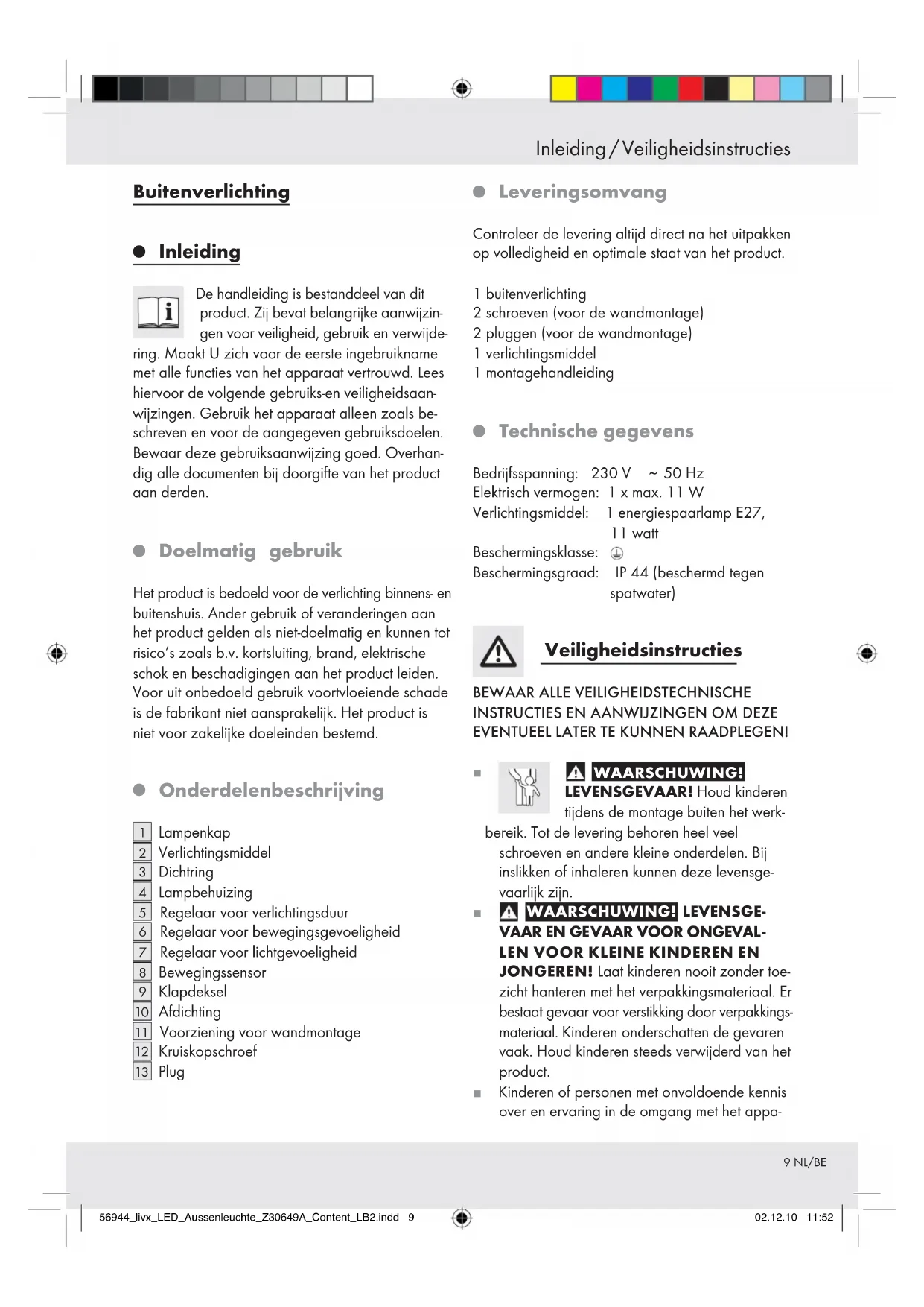 JONGEREN! Laat kinderen nooit zonder toe- zicht hanteren met het verpakkingsmateriaal. Er bestaat gevaar voor verstikking door verpakkings- materiaal. Kinderen onderschatten de gevaren vaak. Houd kinderen steeds verwijderd van het product. Kinderen of personen met onvoldoende kennis over en ervaring in de omgang met het appa- Inleiding / Veiligheidsinstructies 56944_livx_LED_Aussenleuchte_Z30649A_Content_LB2.indd 9 02.12.10 11:5210 NL/BE raat of met beperkte lichamelijke, sensorische of geestige vermogens mogen het apparaat niet zonder toezicht of voorafgaande instructie door een voor hun veiligheid verantwoordelijke persoon gebruiken. Op kinderen dient toezicht te worden gehouden om te voorkomen dat ze met het apparaat spelen. Dit product is geen speelgoed, het mag niet in kinderhanden geraken. Kinderen kunnen de gevaren die door de omgang met elektrische producten ontstaan, niet beseffen. Gebruik het artikel niet als U de een of andere beschadiging vaststelt.