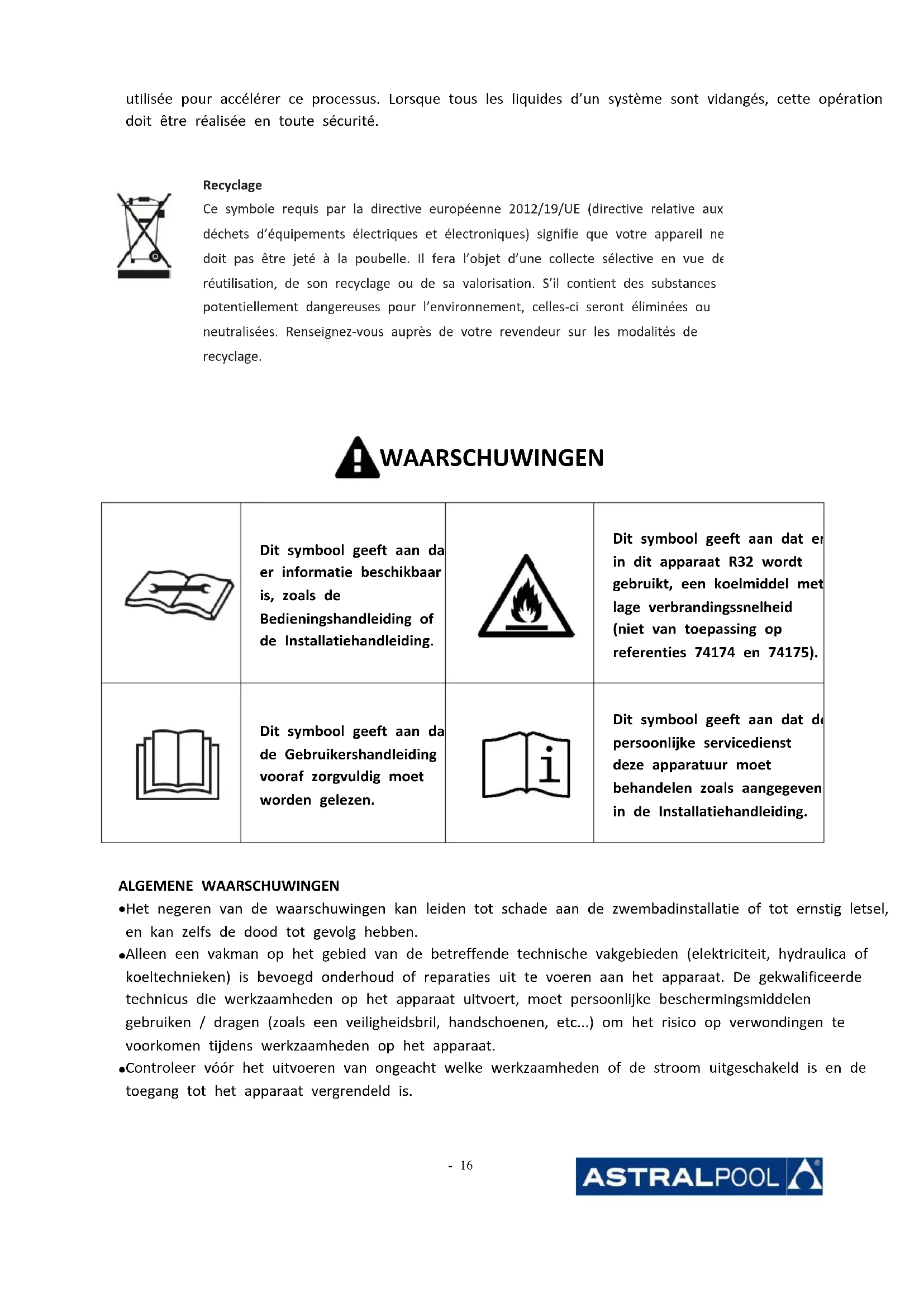 Het negeren van de waarschuwingen kan leiden tot schade aan de zwembadinstallatie of tot ernstig letsel, en kan zelfs de dood tot gevolg hebben.