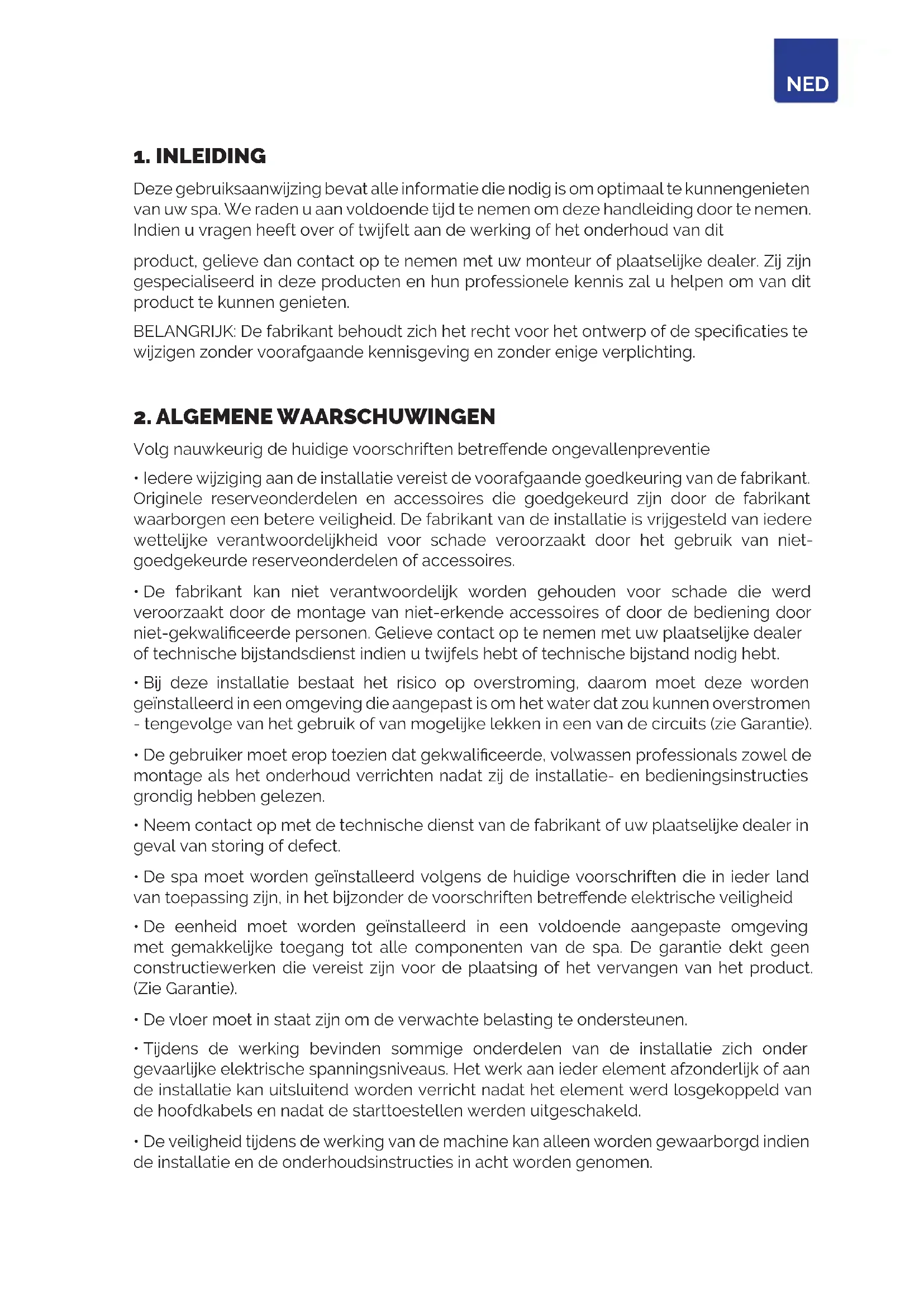De spa’s worden vervaardigd met een maximale kwaliteit en van de meest duurzame materialen. De juiste zorg en onderhoud zullen een lange levensduur van de spa en de onderdelen garanderen. 6.1. Waarschuwingen