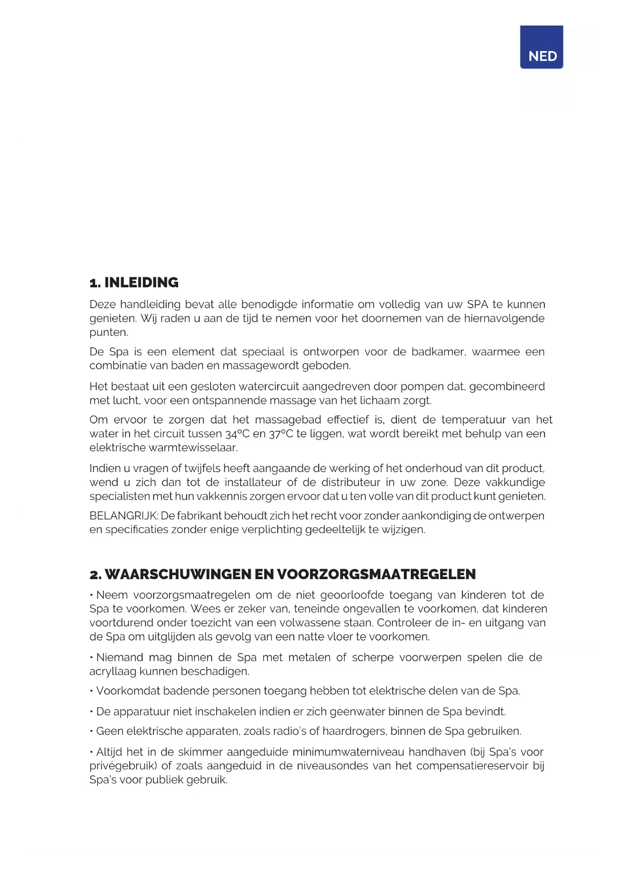 Deze handleiding bevat alle benodigde informatie om volledig van uw SPA te kunnen genieten. Wij raden u aan de tijd te nemen voor het doornemen van de hiernavolgende punten. De Spa is een element dat speciaal is ontworpen voor de badkamer, waarmee een combinatie van baden en massagewordt geboden. Het bestaat uit een gesloten watercircuit aangedreven door pompen dat, gecombineerd met lucht, voor een ontspannende massage van het lichaam zorgt. Om ervoor te zorgen dat het massagebad eectief is, dient de temperatuur van het water in het circuit tussen 34ºC en 37ºC te liggen, wat wordt bereikt met behulp van een elektrische warmtewisselaar. Indien u vragen of twijfels heeft aangaande de werking of het onderhoud van dit product, wend u zich dan tot de installateur of de distributeur in uw zone. Deze vakkundige specialisten met hun vakkennis zorgen ervoor dat u ten volle van dit product kunt genieten. BELANGRIJK: De fabrikant behoudt zich het recht voor zonder aankondiging de ontwerpen en specicaties zonder enige verplichting gedeeltelijk te wijzigen.