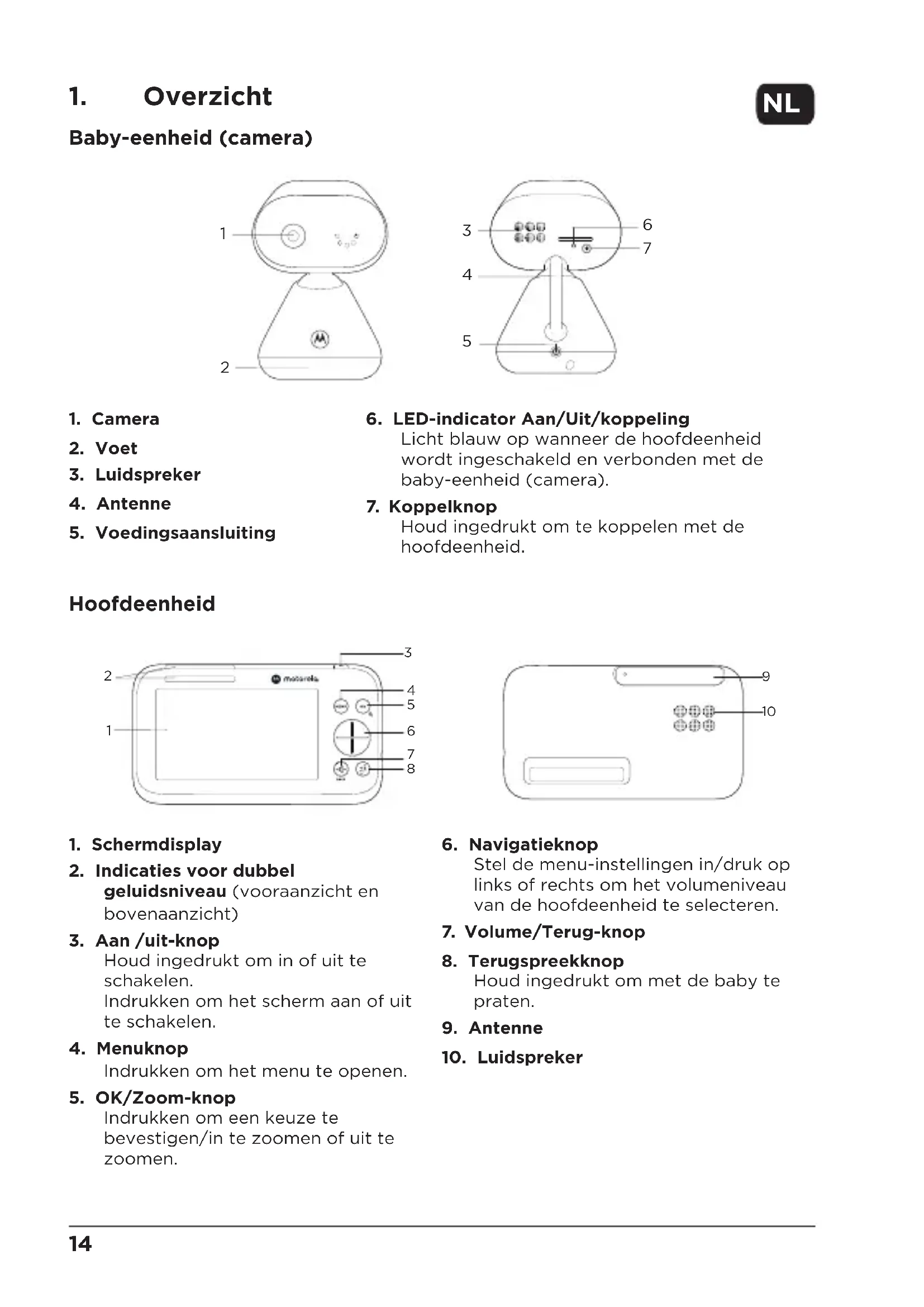 knippert rood als de hoofdeenheid niet is ingeschakeld of de verbinding met de baby-eenheid (camera) is verbroken. WAARSCHUWING Gevaar voor verwurging. Kinderen zijn GEWURGD in snoeren. Houd dit snoer buiten het bereik van kinderen (op meer dan 1 meter afstand). Verwijder de labels van de AC-adapters niet. Gebruik alleen de meegeleverde AC-adapters. Hoofdeenheid Een oplaadbare batterij is al voorgeïnstalleerd in de hoofdeenheid. Wanneer deze volledig opgeladen is, kunt u de hoofdeenheid verplaatsen zonder de verbinding en het beeld van de baby-eenheid (camera) te verliezen. Wanneer u de batterij voor de eerste keer oplaadt, laadt u deze ten minste 16 uur onafgebroken op.