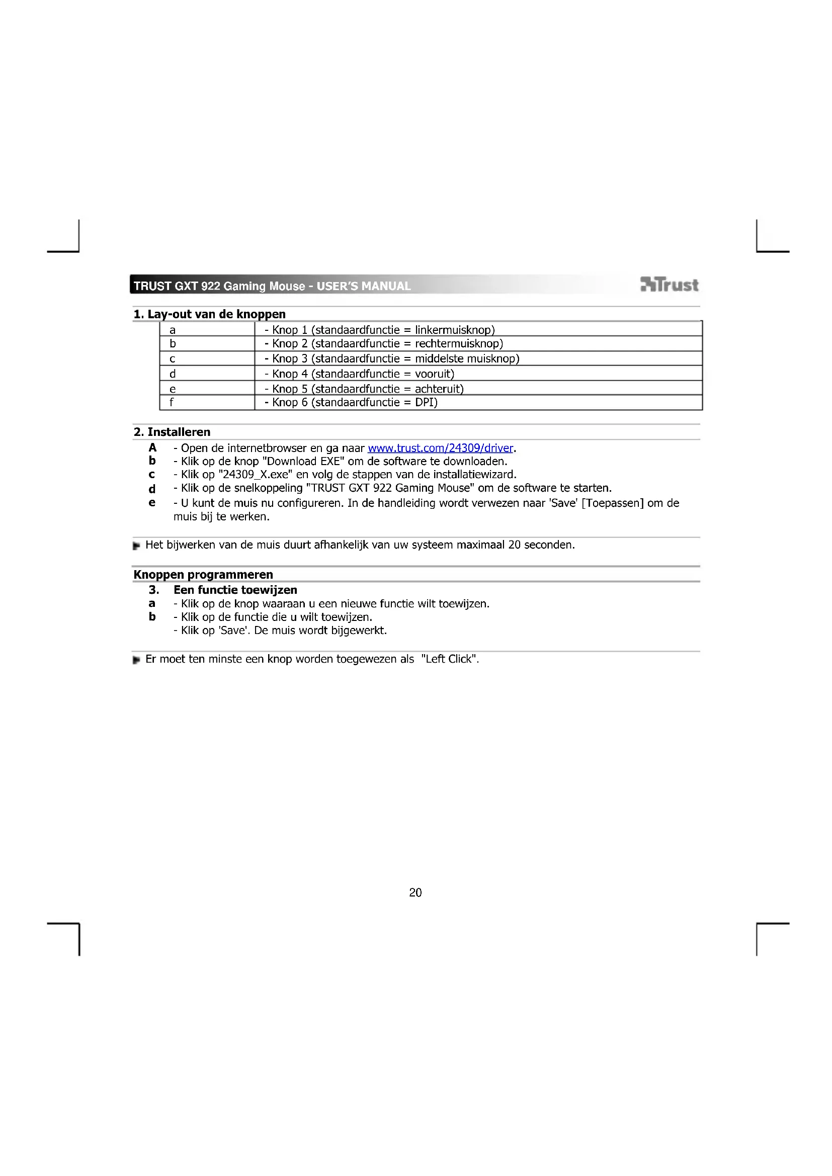 - Open de internetbrowser en ga naar www.trust.com/24309/driver. - Klik op de knop "Download EXE" om de software te downloaden. - Klik op "24309_X.exe" en volg de stappen van de installatiewizard. - Klik op de snelkoppeling "TRUST GXT 922 Gaming Mouse" om de software te starten. - U kunt de muis nu configureren. In de handleiding wordt verwezen naar 'Save' [Toepassen] om de muis bij te werken. Het bijwerken van de muis duurt afhankelijk van uw systeem maximaal 20 seconden. Knoppen programmeren
