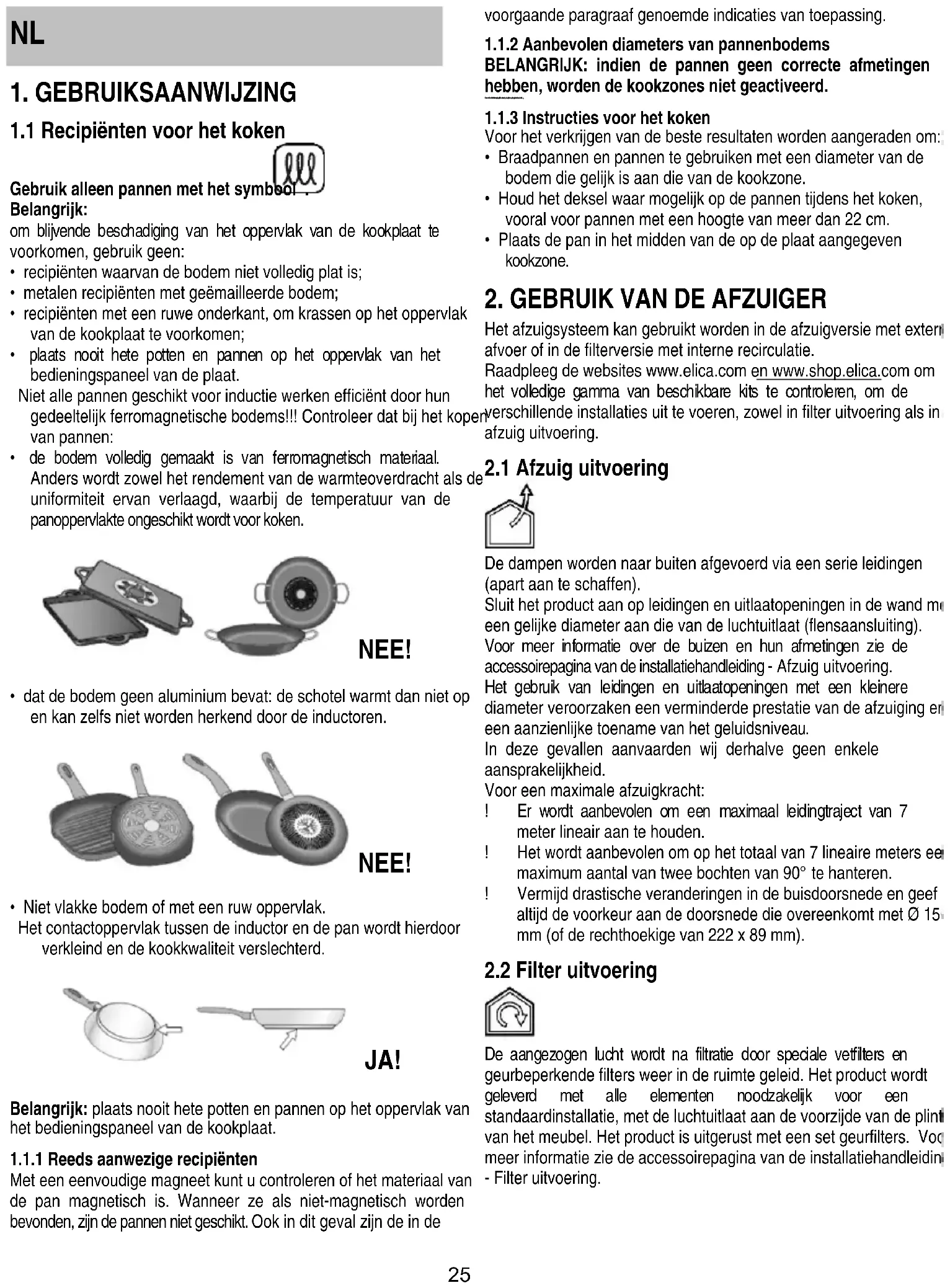 Het afzuigsysteem kan gebruikt worden in de afzuigversie met externe afvoer of in de filterversie met interne recirculatie. Raadpleeg de websites www.elica.com en www.shop.elica.com om het volledige gamma van beschikbare kits te controleren, om de verschillende installaties uit te voeren, zowel in filter uitvoering als in afzuig uitvoering.