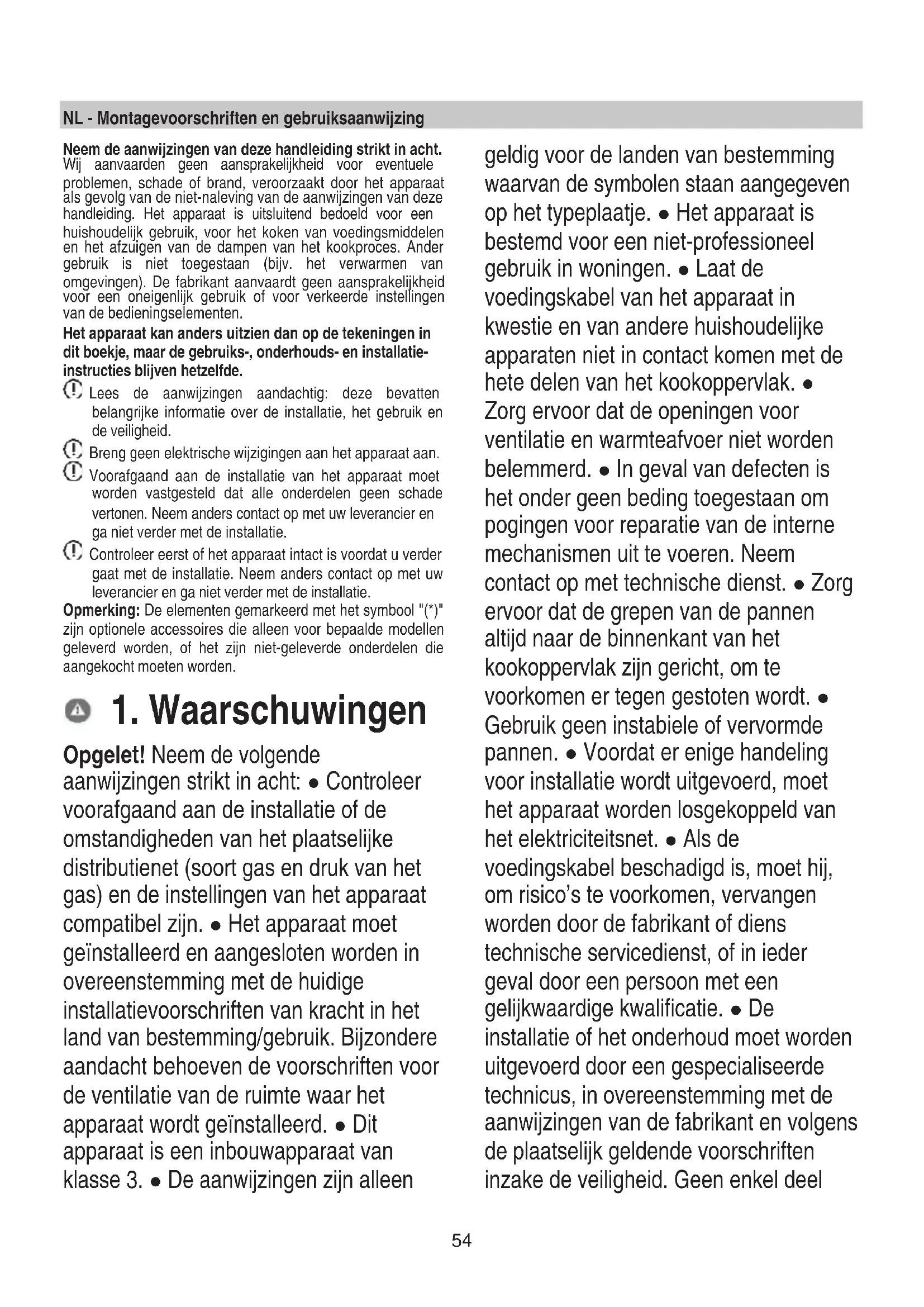 - le numéro de série (S/N) Ces dernières informations se trouvent sur la plaque signalétique fixée sur l’appareil et/ou sur l’emballage. ! Il ne faut jamais recourir à des techniciens non agréés et toujours refuser l’installation de pièces de rechange non originales54 NL - Montagevoorschriften en gebruiksaanwijzing Neem de aanwijzingen van deze handleiding strikt in acht. Wij aanvaarden geen aansprakelijkheid voor eventuele problemen, schade of brand, veroorzaakt door het apparaat als gevolg van de niet-naleving van de aanwijzingen van deze handleiding. Het apparaat is uitsluitend bedoeld voor een huishoudelijk gebruik, voor het koken van voedingsmiddelen en het afzuigen van de dampen van het kookproces. Ander gebruik is niet toegestaan (bijv. het verwarmen van omgevingen). De fabrikant aanvaardt geen aansprakelijkheid voor een oneigenlijk gebruik of voor verkeerde instellingen van de bedieningselementen. Het apparaat kan anders uitzien dan op de tekeningen in dit boekje, maar de gebruiks-, onderhouds- en installatie- instructies blijven hetzelfde. Lees de aanwijzingen aandachtig: deze bevatten belangrijke informatie over de installatie, het gebruik en de veiligheid. Breng geen elektrische wijzigingen aan het apparaat aan. Voorafgaand aan de installatie van het apparaat moet worden vastgesteld dat alle onderdelen geen schade vertonen. Neem anders contact op met uw leverancier en ga niet verder met de installatie. Controleer eerst of het apparaat intact is voordat u verder gaat met de installatie. Neem anders contact op met uw leverancier en ga niet verder met de installatie. Opmerking: De elementen gemarkeerd met het symbool "(*)" zijn optionele accessoires die alleen voor bepaalde modellen geleverd worden, of het zijn niet-geleverde onderdelen die aangekocht moeten worden.