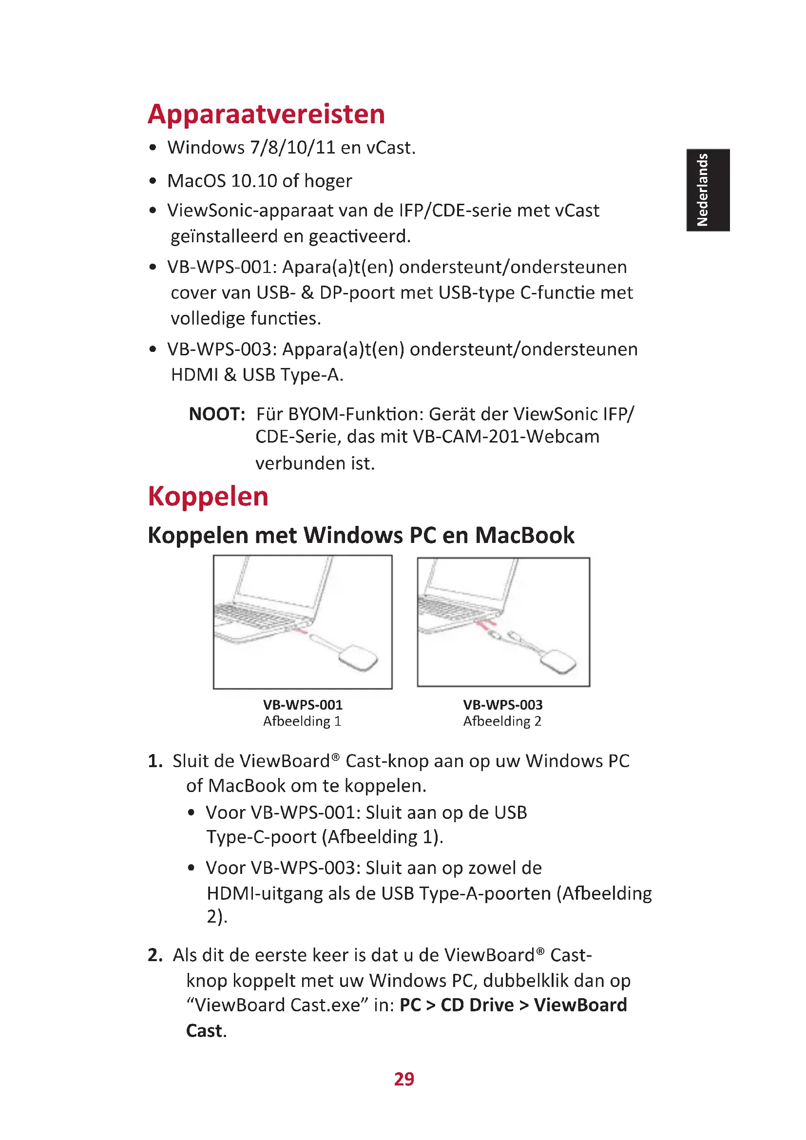 - VB-WPS-003: Appara(a)t(en) ondersteunt/ondersteunen HDMI & USB Type-A. NOOT:ᅠ Für BYOM-Funkon: Gerät der ViewSonic IFP/ CDE-Serie, das mit VB-CAM-201-Webcam verbunden ist. Koppelen Koppelen met Windows PC en MacBook VB-WPS-001 Aeelding 1 VB-WPS-003 Aeelding 2