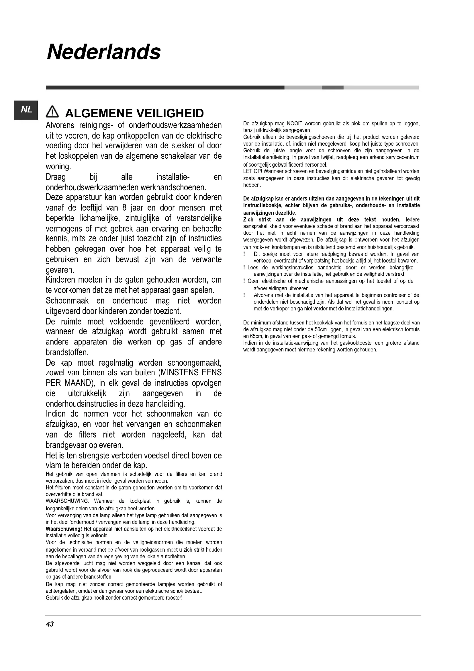 ALGEMENE VEILIGHEID Alvorens reinigings- of onderhoudswerkzaamheden uit te voeren, de kap ontkoppellen van de elektrische voeding door het verwijderen van de stekker of door het loskoppelen van de algemene schakelaar van de woning. Draag bij alle installatie- en onderhoudswerkzaamheden werkhandschoenen. Deze apparatuur kan worden gebruikt door kinderen vanaf de leeftijd van 8 jaar en door mensen met beperkte lichamelijke, zintuiglijke of verstandelijke vermogens of met gebrek aan ervaring en behoefte kennis, mits ze onder juist toezicht zijn of instructies hebben gekregen over hoe het apparaat veilig te gebruiken en zich bewust zijn van de verwante gevaren. Kinderen moeten in de gaten gehouden worden, om te voorkomen dat ze met het apparaat gaan spelen. Schoonmaak en onderhoud mag niet worden uitgevoerd door kinderen zonder toezicht. De ruimte moet voldoende geventileerd worden, wanneer de afzuigkap wordt gebruikt samen met andere apparaten die werken op gas of andere brandstoffen. De kap moet regelmatig worden schoongemaakt, zowel van binnen als van buiten (MINSTENS EENS PER MAAND), in elk geval de instructies opvolgen die uitdrukkelijk zijn aangegeven in de onderhoudsinstructies in deze handleiding. Indien de normen voor het schoonmaken van de afzuigkap, en voor het vervangen en schoonmaken van de filters niet worden nageleefd, kan dat brandgevaar opleveren. Het is ten strengste verboden voedsel direct boven de vlam te bereiden onder de kap. Het gebruik van open vlammen is schadelijk voor de filters en kan brand veroorzaken, dus moet in ieder geval worden vermeden. Het frituren moet constant in de gaten gehouden worden om te voorkomen dat oververhitte olie brand vat. WAARSCHUWING: Wanneer de kookplaat in gebruik is, kunnen de toegankelijke delen van de afzuigkap heet worden Voor vervanging van de lamp alleen het type lamp gebruiken dat aangegeven is in het deel ‘onderhoud / vervangen van de lamp’ in deze handleiding. Waarschuwing! Het apparaat niet aansluiten op het elektriciteitsnet voordat de installatie volledig is voltooid. Voor de technische normen en de veiligheidsnormen die moeten worden nagekomen in verband met de afvoer van rookgassen moet u zich strikt houden aan de bepalingen van de regelgeving van de lokale autoriteiten. De afgevoerde lucht mag niet worden weggeleid door een kanaal dat ook gebruikt wordt voor de afvoer van rook die geproduceerd wordt door apparaten op gas of andere brandstoffen. De kap mag niet zonder correct gemonteerde lampjes worden gebruikt of achtergelaten, omdat er dan gevaar voor een elektrische schok bestaat. Gebruik de afzuigkap nooit zonder correct gemonteerd rooster! De afzuigkap mag NOOIT worden gebruikt als plek om spullen op te leggen, tenzij uitdrukkelijk aangegeven. Gebruik alleen de bevestigingsschoeven die bij het product worden geleverd voor de installatie, of, indien niet meegeleverd, koop het juiste type schroeven. Gebruik de juiste lengte voor de schroeven die zijn aangegeven in de Installatiehandleiding. In geval van twijfel, raadpleeg een erkend servicecentrum of soortgelijk gekwalificeerd personeel. LET OP! Wanneer schroeven en bevestigingsmiddelen niet geϊnstalleerd worden zoals aangegeven in deze instructies kan dit elektrische gevaren tot gevolg hebben. De afzuigkap kan er anders uitzien dan aangegeven in de tekeningen uit dit instructieboekje, echter blijven de gebruiks-, onderhouds- en installatie aanwijzingen dezelfde. Zich strikt aan de aanwijzingen uit deze tekst houden. Iedere aansprakelijkheid voor eventuele schade of brand aan het apparaat veroorzaakt door het niet in acht nemen van de aanwijzingen in deze handleiding weergegeven wordt afgewezen. De afzuigkap is ontworpen voor het afzuigen van rook- en kookdampen en is uitsluitend bestemd voor huishoudelijk gebruik. ! Dit boekje moet voor latere raadpleging bewaard worden. In geval van verkoop, overdracht of verplaatsing het boekje altijd bij het toestel bewaren. ! Lees de werkingsinstructies aandachtig door: er worden belangrijke aanwijzingen over de installatie, het gebruik en de veiligheid verstrekt. ! Geen elektrische of mechanische aanpassingen op het toestel of op de afvoerleidingen uitvoeren. ! Alvorens met de installatie van het apparaat te beginnen controleer of de onderdelen niet beschadigd zijn. Als dat wel het geval is neem contact op met de verkoper en ga niet verder met de installatiehandelingen. De minimum afstand tussen het kookvlak van het fornuis en het laagste deel van de afzuigkap mag niet onder de 50cm liggen, in geval van een elektrisch fornuis en 65cm, in geval van een gas- of gemengd fornuis. Indien in de installatie-aanwijzing van het gaskooktoestel een grotere afstand wordt aangegeven moet hiermee rekening worden gehouden.44 ELEKTRISCHE AANSLUITING De netspanning moet overeenkomen met de spanning vermeld op het etiket met eigenschappen, te vinden aan de binnenkant van de afzuigkap. Als de afzuigkap een stekker heeft, moet deze in een stopcontact worden gestoken dat voldoet aan de geldende voorschriften op een, ook na de installatie, goed bereikbare plaats. Heeft de kap geen stekker (rechtstreekse verbinding met het net) of is deze, ook na de installatie, niet goed te bereiken, dan moet er een tweepolige schakelaar worden geplaatst die de volledige ontkoppeling van het net garandeert in het geval van een overspanning van klasse III, in overeenstemming met de installatie normen. Attentie! Alvorens de afzuigkap weer aan het voedingsnet aan te sluiten controleer eerst of deze goed werkt, controleer daarom altijd of de voedingskabel goed is aangesloten. Vervanging van de voeding De afzuigkap is voorzien van een speciale voedingskabel; als de kabel beschadigd is, vraag de technische dienst voor een nieuwe kabel. LUCHTAFVOER (afzuigend apparaat) Verbind de afzuigkap aan wandafvoerpijpen en afvoeropeningen met dezelfde diameter als de luchtuitgang (verbindingsflens).Het gebruik van wandafvoerpijpen of afvoeropeningen met een kleinere diameter zal le