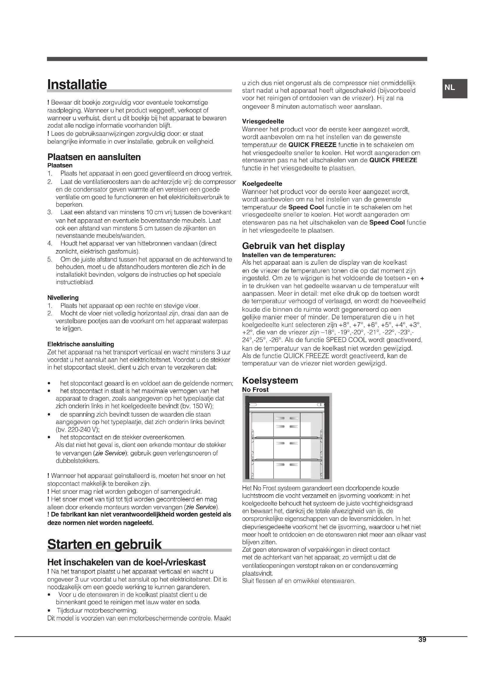 - hetstopcontactendestekkerovereenkomen. Alsdatniethetgevalis,dienteenerkendemonteurdestekker tevervangen(zie Service);gebruikgeenverlengsnoerenof dubbelstekkers. !Wanneerhetapparaatgeïnstalleerdis,moetenhetsnoerenhet stopcontactmakkelijktebereikenzijn. !Hetsnoermagnietwordengebogenofsamengedrukt. !Hetsnoermoetvantijdtottijdwordengecontroleerdenmag alleendoorerkendemonteurswordenvervangen(zie Service). ! De fabrikant kan niet verantwoordelijkheid worden gesteld als deze normen niet worden nageleefd. Starten en gebruik Het inschakelen van de koel-/vrieskast !Nahettransportplaatstuhetapparaatverticaalenwachtu ongeveer3uurvoordatuhetaansluitophetelektriciteitsnet.Ditis noodzakelijkomeengoedewerkingtekunnengaranderen.