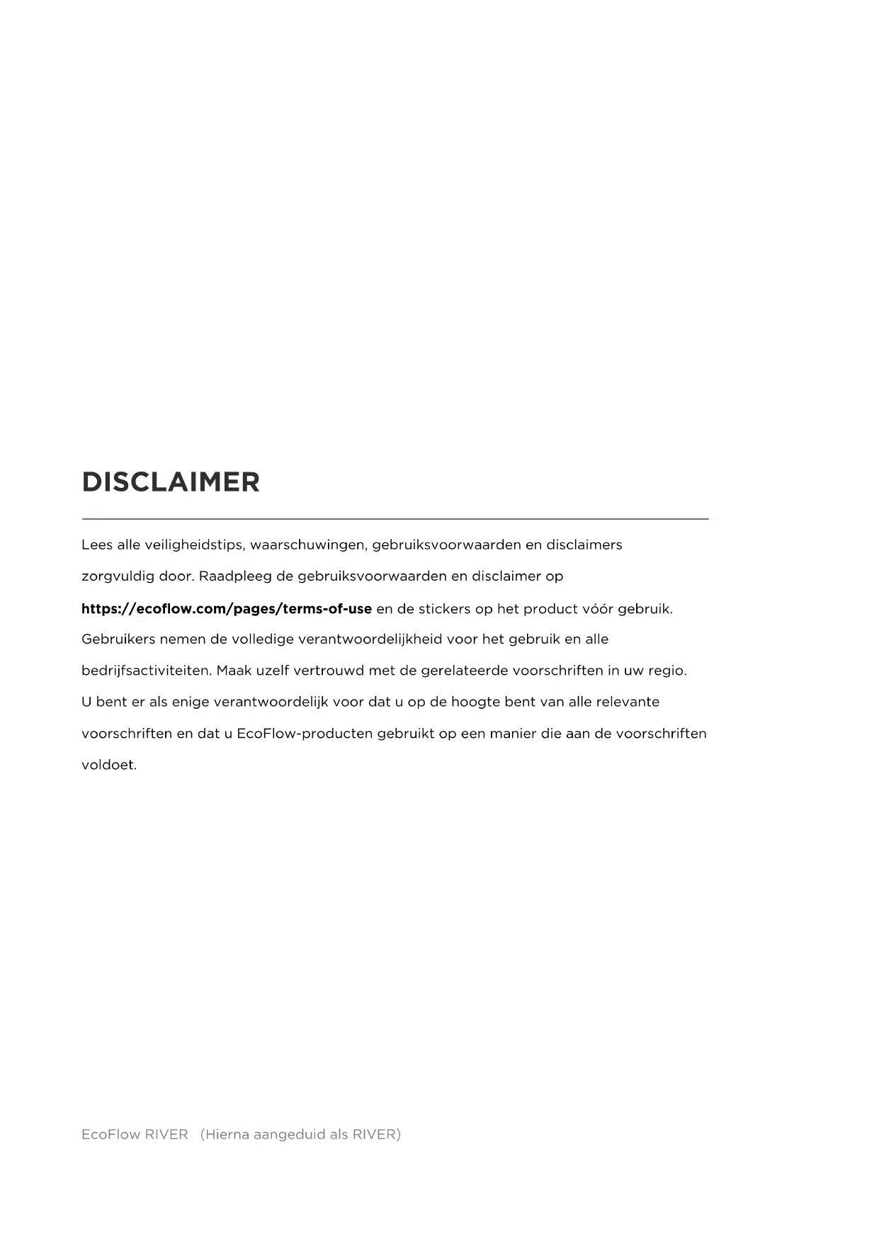 Lees alle veiligheidstips, waarschuwingen, gebruiksvoorwaarden en disclaimers zorgvuldig door. Raadpleeg de gebruiksvoorwaarden en disclaimer op https://ecoflow.com/pages/terms-of-use en de stickers op het product vóór gebruik. Gebruikers nemen de volledige verantwoordelijkheid voor het gebruik en alle bedrijfsactiviteiten. Maak uzelf vertrouwd met de gerelateerde voorschriften in uw regio. U bent er als enige verantwoordelijk voor dat u op de hoogte bent van alle relevante voorschriften en dat u EcoFlow-producten gebruikt op een manier die aan de voorschriften voldoet. DISCLAIMER1