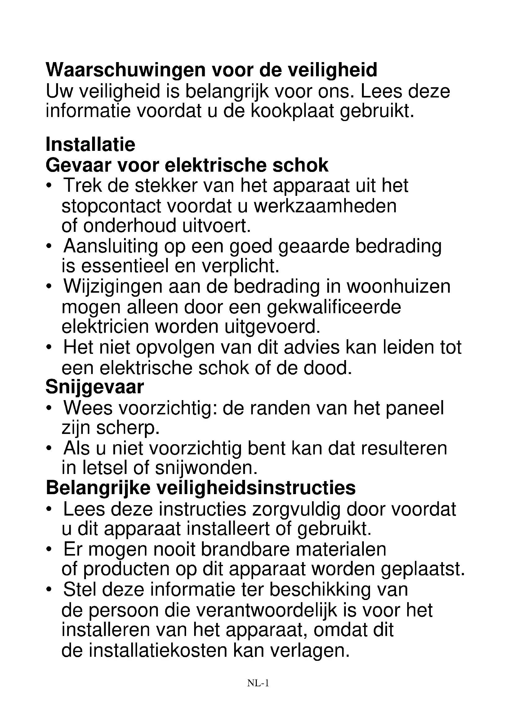 - Utilisez des casseroles dont le diamètre est aussi large que le dessin de la zone sélectionnée.NL-1 Waarschuwingen voor de veiligheid Uw veiligheid is belangrijk voor ons. Lees deze informatie voordat u de kookplaat gebruikt. Installatie Gevaar voor elektrische schok