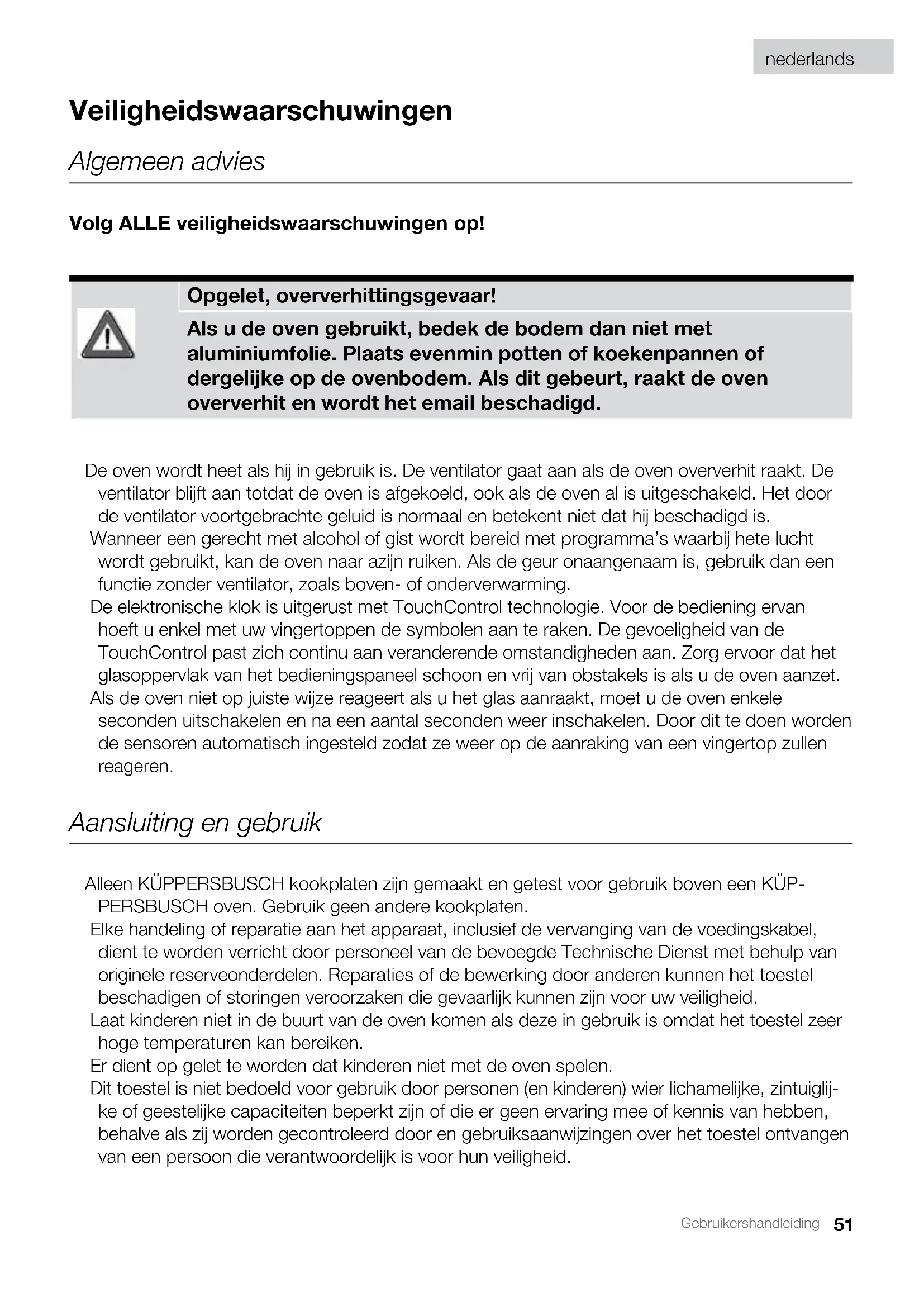 , utilisez des détergents neutres et des éponges douces non abrasives.51 Gebruikershandleiding nederlands Veiligheidswaarschuwingen Algemeen advies Volg ALLE veiligheidswaarschuwingen op! Opgelet, oververhittingsgevaar! Als u de oven gebruikt, bedek de bodem dan niet met aluminiumfolie. Plaats evenmin potten of koekenpannen of dergelijke op de ovenbodem. Als dit gebeurt, raakt de oven oververhit en wordt het email beschadigd.