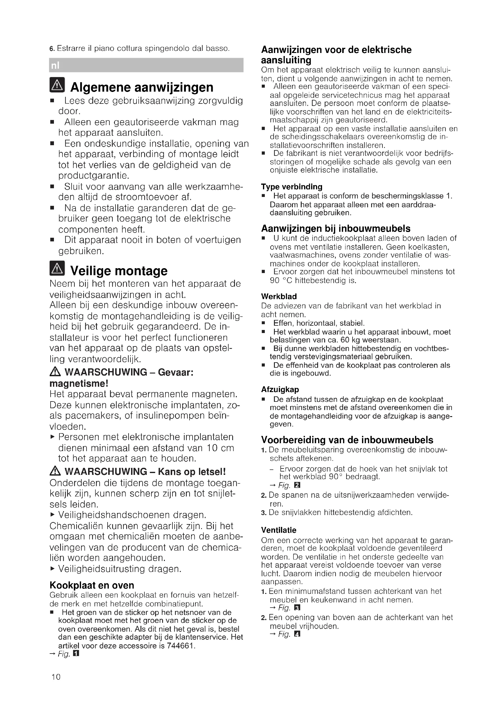 Algemene aanwijzingen ¡ Lees deze gebruiksaanwijzing zorgvuldig door. ¡ Alleen een geautoriseerde vakman mag het apparaat aansluiten. ¡ Een ondeskundige installatie, opening van het apparaat, verbinding of montage leidt tot het verlies van de geldigheid van de productgarantie. ¡ Sluit voor aanvang van alle werkzaamhe- den altijd de stroomtoevoer af. ¡ Na de installatie garanderen dat de ge- bruiker geen toegang tot de elektrische componenten heeft. ¡ Dit apparaat nooit in boten of voertuigen gebruiken. Veilige montage Neem bij het monteren van het apparaat de veiligheidsaanwijzingen in acht. Alleen bij een deskundige inbouw overeen- komstig de montagehandleiding is de veilig- heid bij het gebruik gegarandeerd. De in- stallateur is voor het perfect functioneren van het apparaat op de plaats van opstel- ling verantwoordelijk. WAARSCHUWING‒Gevaar: magnetisme! Het apparaat bevat permanente magneten. Deze kunnen elektronische implantaten, zo- als pacemakers, of insulinepompen beïn- vloeden.