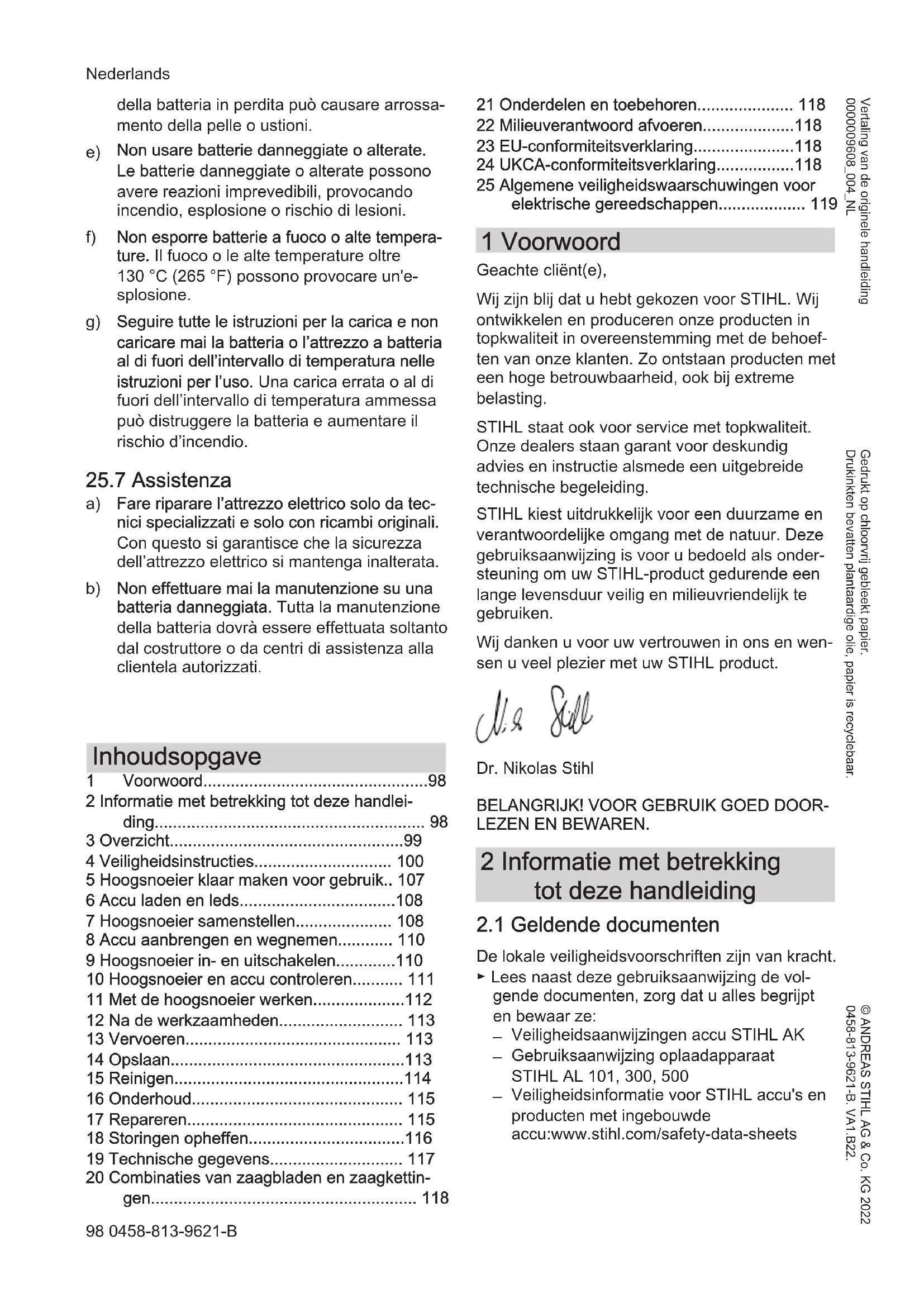Veiligheidsinformatie voor STIHL accu's en producten met ingebouwde accu:www.stihl.com/safety-data-sheets Nederlands 98 0458-813-9621-B © ANDREAS STIHL AG & Co. KG 2022 0458-813-9621-B. VA1.B22. Gedrukt op chloorvrij gebleekt papier. Drukinkten bevatten plantaardige olie, papier is recyclebaar. Vertaling van de originele handleiding 0000009608_004_NL2.2 Aanduiding van de waarschu‐ wingen in de tekst WAARSCHUWING ■ De aanwijzing duidt op gevaren die kunnen leiden tot ernstig letsel of zelfs tot de dood. ► De genoemde maatregelen kunnen ernstig letsel of de dood voorkomen. LET OP ■ De aanwijzing duidt op gevaren die kunnen leiden tot materiële schade. ► De genoemde maatregelen kunnen materi‐ ele schade voorkomen.