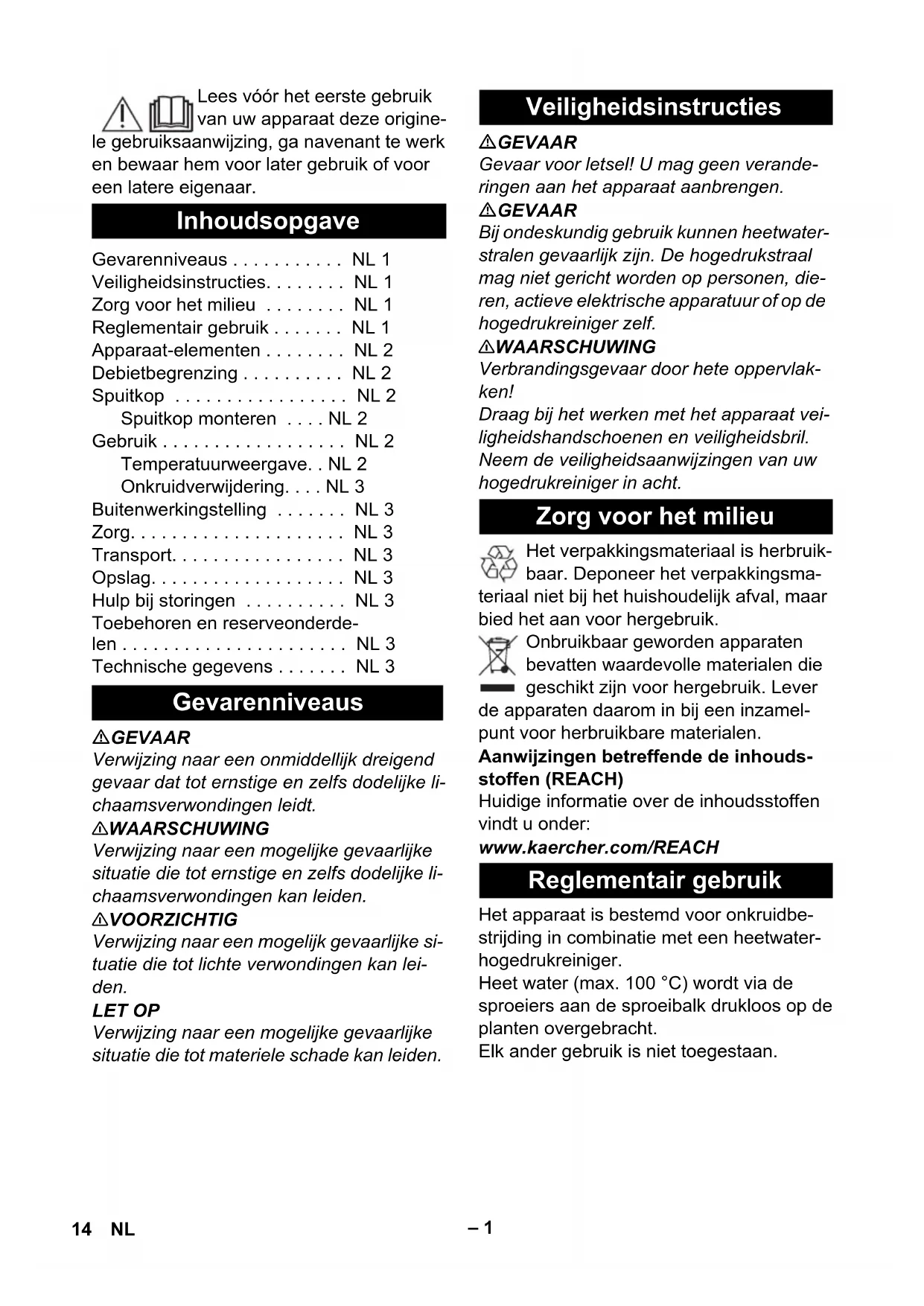HDS 1000 De 2.113-071.0 HDS 1000 Be 2.113-071.0 HDS 13/20 DeTr.1 2.113-026.0 HDS 17/20 DeTr.1 2.113-026.0 Testata di nebulizzazione Montaggio della testata di nebulizzazione Funzionamento Indicatore della temperatura 12 IT– 3 L’indicatore di temperatura si modifica all’aumentare della temperatura dell’ac- qua. I campi indicatori cambiano colore da sinistra a destra passando da nero a marrone. Quando la barra a destra si colora di verde, l’apparecchio è pronto per l’utiliz- zo. Passare lentamente la testata di nebu- lizzazione sull’erbaccia. Se necessario ripetere più volte l'opera- zione. Nota L’effetto ottimale viene raggiunto quando l'acqua calda esce senza pressione produ- cendo un leggero vapore. 몇 AVVERTIMENTO Pericolo di ustioni! Lasciare raffreddare WR10 prima dello smontaggio. Dopo l’utilizzo, far raffreddare la testata di nebulizzazione utilizzando acqua fredda per 2 minuti. Se necessario, sciacquare la testata di nebulizzazione con acqua pulita. Verificare regolarmente che gli ugelli della testata di nebulizzazione siano li- beri da otturazioni. Per il trasporto osservare il peso dell'appa- recchio. Osservare il peso dell'attrezzo quando lo si mette a magazzino. Conservare l'apparecchio in un luogo protetto dal gelo. Dalla testata di nebulizzazione fuoriesce vapore: Diminuire la temperatura impostata sull'idropulitrice. L'acqua fuoriesce con una pressione eccessiva: Montare l'ugello Power nel raccordo a vite. Selezionare l'ugello Power adatto (vedi tabella). L'idropulitrice si spegne / il bruciatore sull'idropulitrice non si avvia: Verificare che gli ugelli della testata di nebulizzazione siano liberi da otturazio- ni. Verificare che gli ugelli della testata di nebulizzazione non presentino forma- zione di calcare. Utilizzando solamente accessori e ricambi originali, si garantisce un funzionamento si- curo e privo di disturbi dell'apparecchio. Si possono trovare informazioni riguardo ad accessori e ricambi su www.kaercher.com. Distanza erbacce infestanti Messa fuori servizio Cura Trasporto Immagazzinaggio Guida alla risoluzione dei guasti Accessori e ricambi Dati tecnici WR 10 Larghezza della superficie di lavoro 100mm Temperatura nominale in en- trata min. 90° C Temperatura nominale in en- trata max. 100° C Peso (kg) 0,3 13IT– 1 Lees vóór het eerste gebruik van uw apparaat deze origine- le gebruiksaanwijzing, ga navenant te werk en bewaar hem voor later gebruik of voor een latere eigenaar. GEVAAR Verwijzing naar een onmiddellijk dreigend gevaar dat tot ernstige en zelfs dodelijke li- chaamsverwondingen leidt. 몇 WAARSCHUWING Verwijzing naar een mogelijke gevaarlijke situatie die tot ernstige en zelfs dodelijke li- chaamsverwondingen kan leiden. 몇 VOORZICHTIG Verwijzing naar een mogelijk gevaarlijke si- tuatie die tot lichte verwondingen kan lei- den. LET OP Verwijzing naar een mogelijke gevaarlijke situatie die tot materiele schade kan leiden. GEVAAR Gevaar voor letsel! U mag geen verande- ringen aan het apparaat aanbrengen. GEVAAR Bij ondeskundig gebruik kunnen heetwater- stralen gevaarlijk zijn. De hogedrukstraal mag niet gericht worden op personen, die- ren, actieve elektrische apparatuur of op de hogedrukreiniger zelf. 몇 WAARSCHUWING Verbrandingsgevaar door hete oppervlak- ken! Draag bij het werken met het apparaat vei- ligheidshandschoenen en veiligheidsbril. Neem de veiligheidsaanwijzingen van uw hogedrukreiniger in acht. Het verpakkingsmateriaal is herbruik- baar. Deponeer het verpakkingsma- teriaal niet bij het huishoudelijk afval, maar bied het aan voor hergebruik. Onbruikbaar geworden apparaten bevatten waardevolle materialen die geschikt zijn voor hergebruik. Lever de apparaten daarom in bij een inzamel- punt voor herbruikbare materialen. Aanwijzingen betreffende de inhouds- stoffen (REACH) Huidige informatie over de inhoudsstoffen vindt u onder: www.kaercher.com/REACH Het apparaat is bestemd voor onkruidbe- strijding in combinatie met een heetwater- hogedrukreiniger. Heet water (max. 100 °C) wordt via de sproeiers aan de sproeibalk drukloos op de planten overgebracht. Elk ander gebruik is niet toegestaan. Inhoudsopgave Gevarenniveaus . . . . . . . . . . . NL 1 Veiligheidsinstructies. . . . . . . . NL 1 Zorg voor het milieu . . . . . . . . NL 1 Reglementair gebruik . . . . . . . NL 1 Apparaat-elementen . . . . . . . . NL 2 Debietbegrenzing . . . . . . . . . . NL 2 Spuitkop . . . . . . . . . . . . . . . . . NL 2 Spuitkop monteren . . . . NL 2 Gebruik . . . . . . . . . . . . . . . . . . NL 2 Temperatuurweergave. . NL 2 Onkruidverwijdering. . . . NL 3 Buitenwerkingstelling . . . . . . . NL 3 Zorg. . . . . . . . . . . . . . . . . . . . . NL 3 Transport. . . . . . . . . . . . . . . . . NL 3 Opslag. . . . . . . . . . . . . . . . . . . NL 3 Hulp bij storingen . . . . . . . . . . NL 3 Toebehoren en reserveonderde- len . . . . . . . . . . . . . . . . . . . . . . NL 3 Technische gegevens . . . . . . . NL 3 Gevarenniveaus Veiligheidsinstructies Zorg voor het milieu Reglementair gebruik 14 NL– 2 1 Staalbuis 2 Powersproeier 3 Schroefsluiting 4 Temperatuurweergave 5 Spuitkop Om te garanderen dat de temperatuur van het water constant hoog blijft (boven 90 °C) moet voor de begrenzing van het debiet een powersproeier in de schroefsluiting van de spuitkop worden geplaatst. Opmerking De vereiste powersproeier is op de desbe- treffende hogedrukreiniger afgestemd en moet apart worden besteld. Opmerking: Powersproeiers voor hier niet vermelde hogedrukreinigers moeten bij de servicepartner worden aangevraagd. Powersproeier in de schroefverbinding schuiven. Spuitkop op de straalbuis schroeven. 몇 WAARSCHUWING Gevaar voor verbranding! De waterstraal mag niet op personen of dieren worden ge- richt. Tijdens de werking WR10 niet aanraken of in de waterstraal komen. Apparaatschakelaar aan hogedrukrei- niger op max. 98 °C instellen. Indien aanwezig servo control regelaar op max. instellen. Opmerking Afhankelijk van de gebruikte hogedrukreini- ger bedraagt d