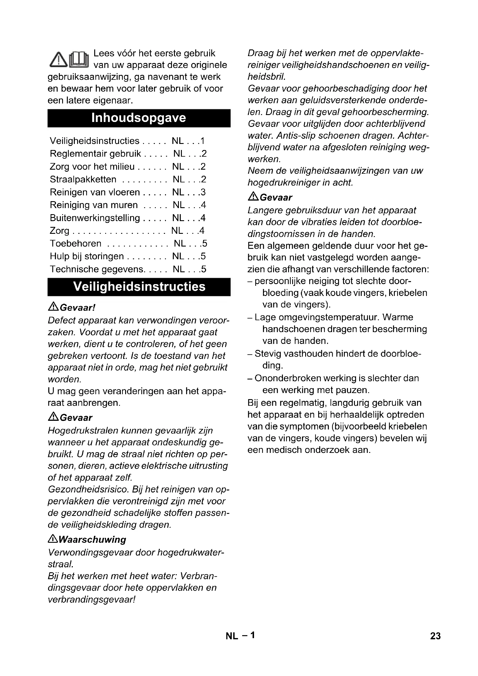 0,4 22 IT– 1 Lees vóór het eerste gebruik van uw apparaat deze originele gebruiksaanwijzing, ga navenant te werk en bewaar hem voor later gebruik of voor een latere eigenaar. Gevaar! Defect apparaat kan verwondingen veroor- zaken. Voordat u met het apparaat gaat werken, dient u te controleren, of het geen gebreken vertoont. Is de toestand van het apparaat niet in orde, mag het niet gebruikt worden. U mag geen veranderingen aan het appa- raat aanbrengen. Gevaar Hogedrukstralen kunnen gevaarlijk zijn wanneer u het apparaat ondeskundig ge- bruikt. U mag de straal niet richten op per- sonen, dieren, actieve elektrische uitrusting of het apparaat zelf. Gezondheidsrisico. Bij het reinigen van op- pervlakken die verontreinigd zijn met voor de gezondheid schadelijke stoffen passen- de veiligheidskleding dragen. 몇 Waarschuwing Verwondingsgevaar door hogedrukwater- straal. Bij het werken met heet water: Verbran- dingsgevaar door hete oppervlakken en verbrandingsgevaar! Draag bij het werken met de oppervlakte- reiniger veiligheidshandschoenen en veilig- heidsbril. Gevaar voor gehoorbeschadiging door het werken aan geluidsversterkende onderde- len. Draag in dit geval gehoorbescherming. Gevaar voor uitglijden door achterblijvend water. Antis-slip schoenen dragen. Achter- blijvend water na afgesloten reiniging weg- werken. Neem de veiligheidsaanwijzingen van uw hogedrukreiniger in acht. Gevaar Langere gebruiksduur van het apparaat kan door de vibraties leiden tot doorbloe- dingstoornissen in de handen. Een algemeen geldende duur voor het ge- bruik kan niet vastgelegd worden aange- zien die afhangt van verschillende factoren: – persoonlijke neiging tot slechte door- bloeding (vaak koude vingers, kriebelen van de vingers). – Lage omgevingstemperatuur. Warme handschoenen dragen ter bescherming van de handen. – Stevig vasthouden hindert de doorbloe- ding. – Ononderbroken werking is slechter dan een werking met pauzen. Bij een regelmatig, langdurig gebruik van het apparaat en bij herhaaldelijk optreden van die symptomen (bijvoorbeeld kriebelen van de vingers, koude vingers) bevelen wij een medisch onderzoek aan. Inhoudsopgave Veiligheidsinstructies . . . . . NL . . .1 Reglementair gebruik . . . . . NL . . .2 Zorg voor het milieu . . . . . . NL . . .2 Straalpakketten . . . . . . . . . NL . . .2 Reinigen van vloeren . . . . . NL . . .3 Reiniging van muren . . . . . NL . . .4 Buitenwerkingstelling . . . . . NL . . .4 Zorg . . . . . . . . . . . . . . . . . . NL . . .4 Toebehoren . . . . . . . . . . . . NL . . .5 Hulp bij storingen . . . . . . . . NL . . .5 Technische gegevens. . . . . NL . . .5 Veiligheidsinstructies 23NL– 2 De oppervlaktereiniger is geschikt voor het reinigen van vloeren en muren in combina- tie met een hogedrukreiniger. Maximale waterdruk 25 MPa (250 bar). Maximale watertempeatuur 85 °C. Het afvalwater wordt via een slang afge- voerd. Het verpakkingsmateriaal is herbruik- baar. Deponeer het verpakkingsma- teriaal niet bij het huishoudelijk afval, maar bied het aan voor hergebruik. Onbruikbaar geworden apparaten bevatten waardevolle materialen die geschikt zijn voor hergebruik. Lever de apparaten daarom in bij een inzamel- punt voor herbruikbare materialen. Aanwijzingen betreffende de inhouds- stoffen (REACH) Huidige informatie over de inhoudsstoffen vindt u onder: www.kaercher.com/REACH Aanwijzing De benodigde straalpakketten zijn op de desbetreffende hogedrukreiniger afge- stemd en moeten apart besteld worden. 1 O-ring 2 Rotatiearm 3 Sproeier 4 Verbindingsmoer O-ring in de groef van de rotatiearm leg- gen. Sproeier erop zetten. Sproeier met verbindingsmoer licht vastdraaien. Aanwijzing De naar buiten komende straal moet paral- lel aan de rotatiearm gericht worden. Symbolen op het toestel 몇 Waarschuwing Verwondingsgevaar door de roterende arm. Grijp nooit on- der het apparaat als de hoge- drukreiniger draait. De roterende arm draait na het uitschakelen van de hogedruk- reiniger nog even verder. Wacht voor werkzaamheden aan het apparaat tot de rote- rende arm stilstaat. Bij werking met heet water: 몇 Waarschuwing Verbrandingsgevaar! Raak hete oppervlakken niet aan! Neem de oppervlaktereiniger niet in bedrijf zonder de ge- bruiksaanwijzing gelezen te hebben. Reglementair gebruik Zorg voor het milieu Straalpakketten Afmeting sproeier van de hogedrukreiniger: Straalpakket 034...035 2.642-430.0 036...040 2.642-431.0 041...045 2.642-432.0 046...050 2.642-433.0 051...080 2.642-982.0 Straalpakket monteren 24 NL– 3 Sleutelvlakken van de sproeier (sleutel- maat 10) parallel aan de rotatiearm richten. Verbindingsmoer (sleutelmaat 22) met schroefsleutel vast aandraaien. Proces aan de tweede rotatiearm her- halen. Instructie: Breng de sproeiers voor de oppervlakterei- niger niet aan op de straalpijp van de hoge- drukreiniger. 1 Injectorsproeier 2 Steeksleutel Injectorsproeier met steeksleutel in de injector schroeven en handvast (8 Nm) aandraaien. De steeksleutel zit bij de sproeierset. Straalbuis van de hogedrukreiniger op de oppervlaktereiniger aansluiten en met schroefsleutel (sleutelmaat 24) vast aandraaien. Voorzichtig Uit de slangaansluiting komt een sterke straal afvalwater. Oppervlaktereiniger niet zonder slang gebruiken. O-ring aan het slanguiteinde vóór de montage met bijgevoegd vet invetten. Steek de bijgevoegde slang op de slan- gaansluiting van de oppervlaktereiniger en zet vast door te draaien. Ander uiteinde van de slang naar een afvoer leiden en met bijgevoegde velcro vastzetten. Instructie: Leg de slang indien mogelijk zonder hel- ling. Maximale hoogte van het afvalwater bedraagt 1 m. Met de bijgevoegde klittenband kan het vrije slangeinde vastgezet worden (bijvoor- beeld aan een rooster van de afvoer). Gebruik indien nodig een verlengslang (zie „Accessoires“). Bij het werken handspuitpistool en straalbuis met beide handen vasthou- den. Oppervlaktereiniger zo leiden, dat hij dicht op het te reinigen oppervlak rust. Reinigen van vloeren 25NL– 4 Wartelmoer los